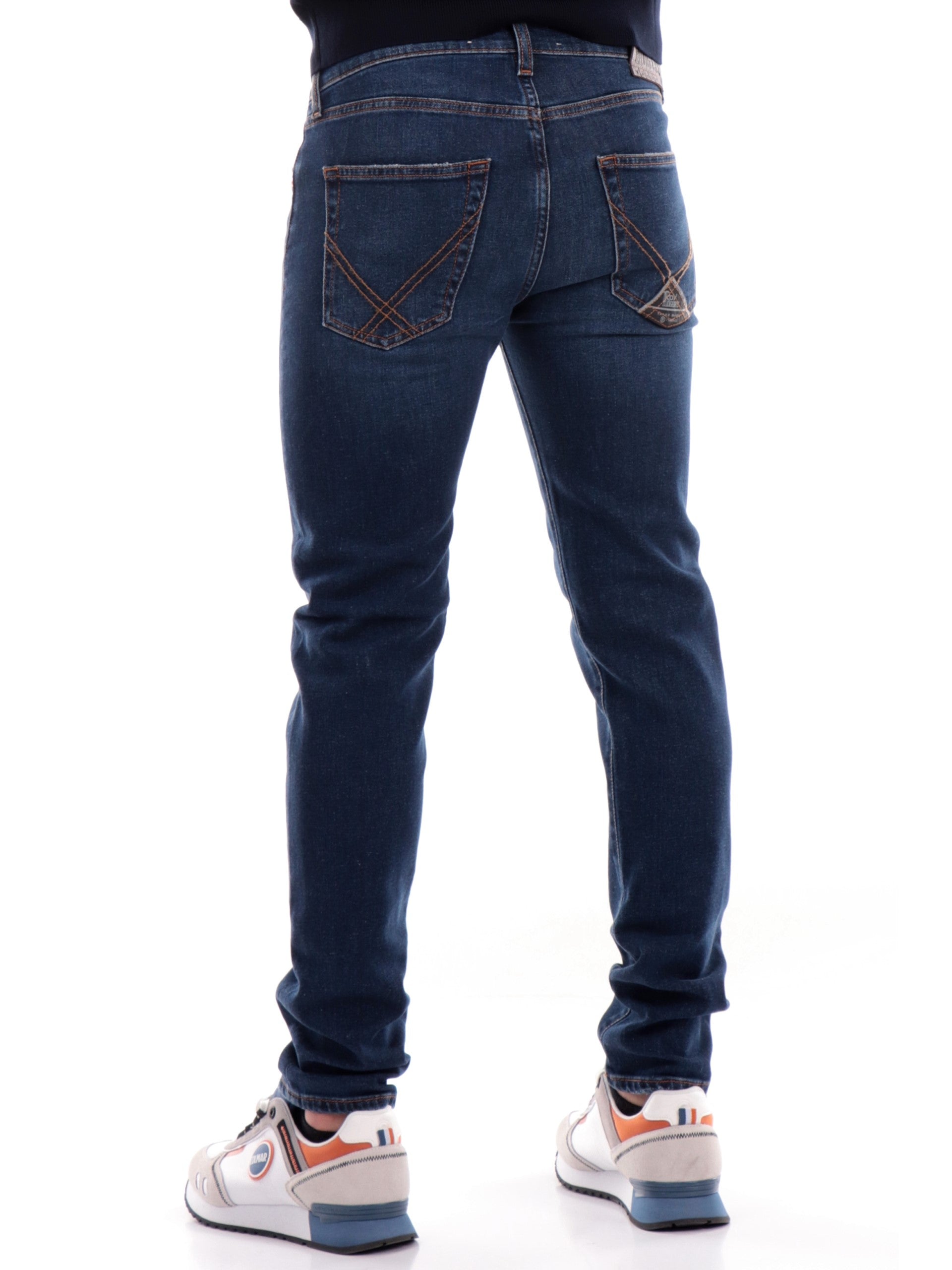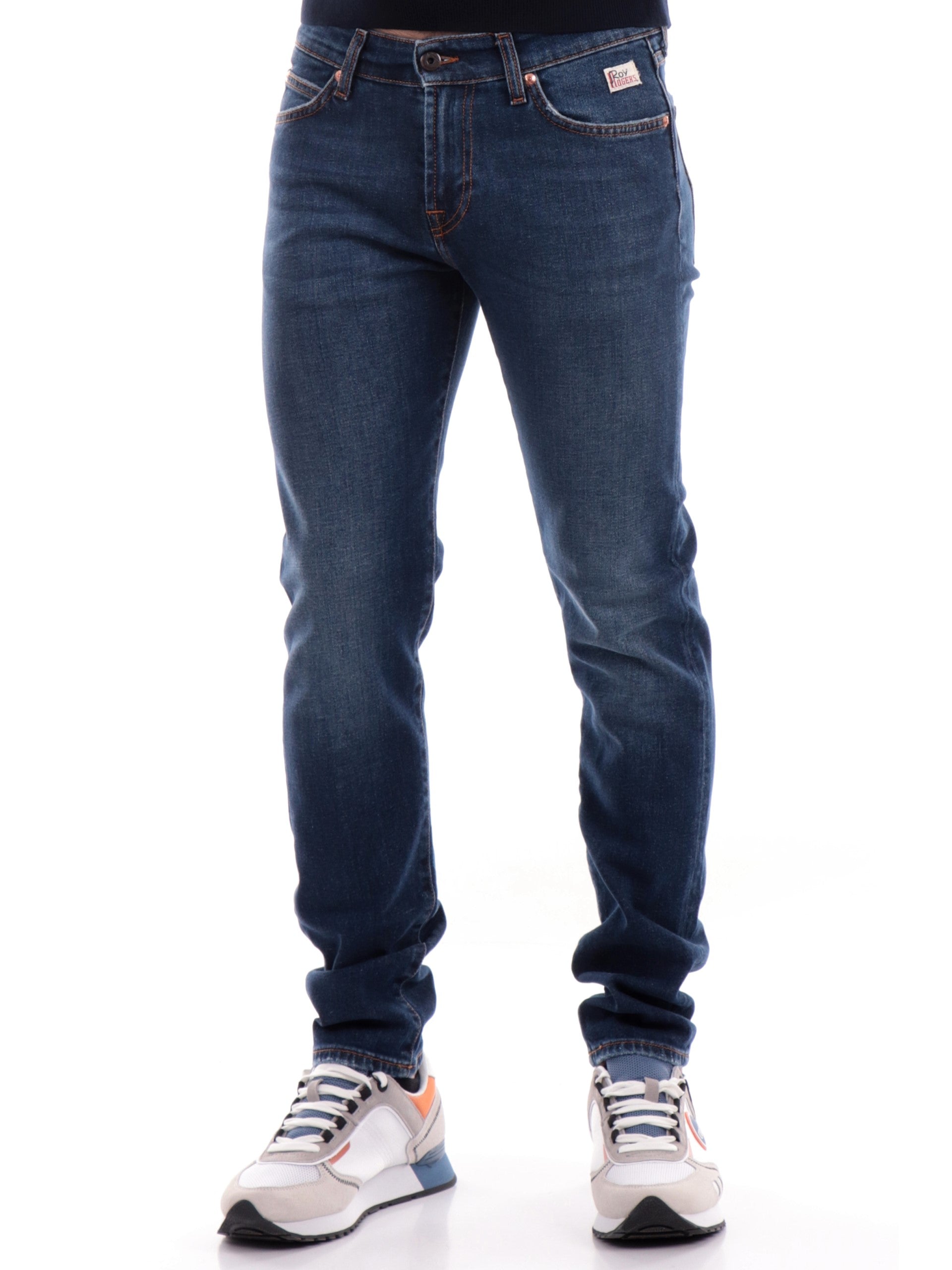 Jeans Roy Rogers da uomo realizzati in morbido denim elasticizzato dal lavaggio scuro. Pantaloni 5 tasche di manifattura italiana, caratterizzati da un'allacciatura con zip e bottone logato, duetasche sul fronte con rivetti in metallo e due tasche sul retro con label Roy Roger's applicato. Denim a vita media con passanti e salpa Roy Roger's applicata sul retro, è un passpartout nelguardaroba di ogni uomo.