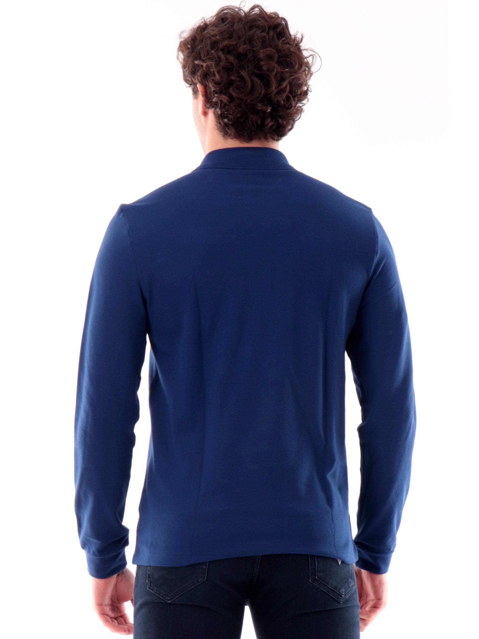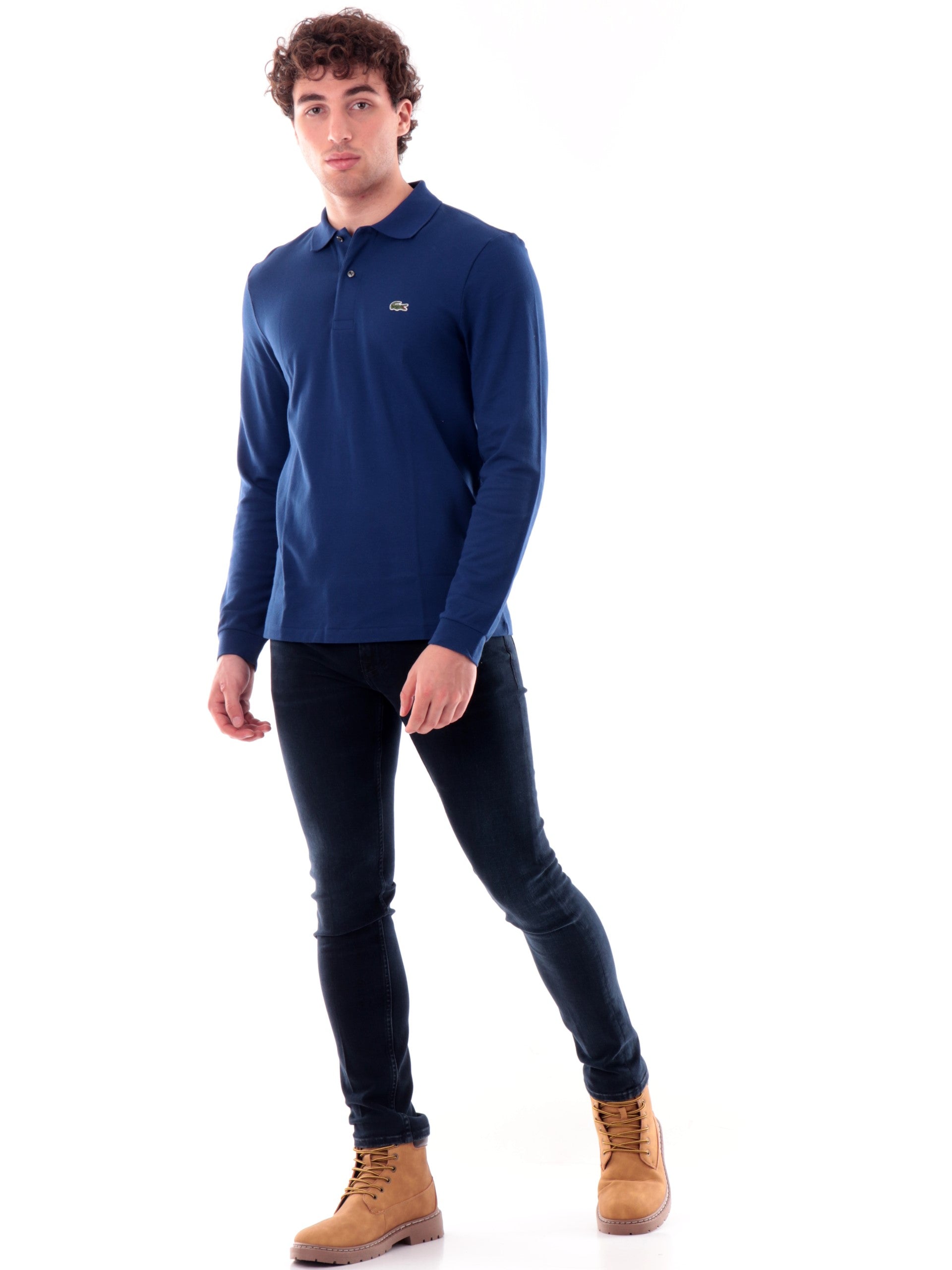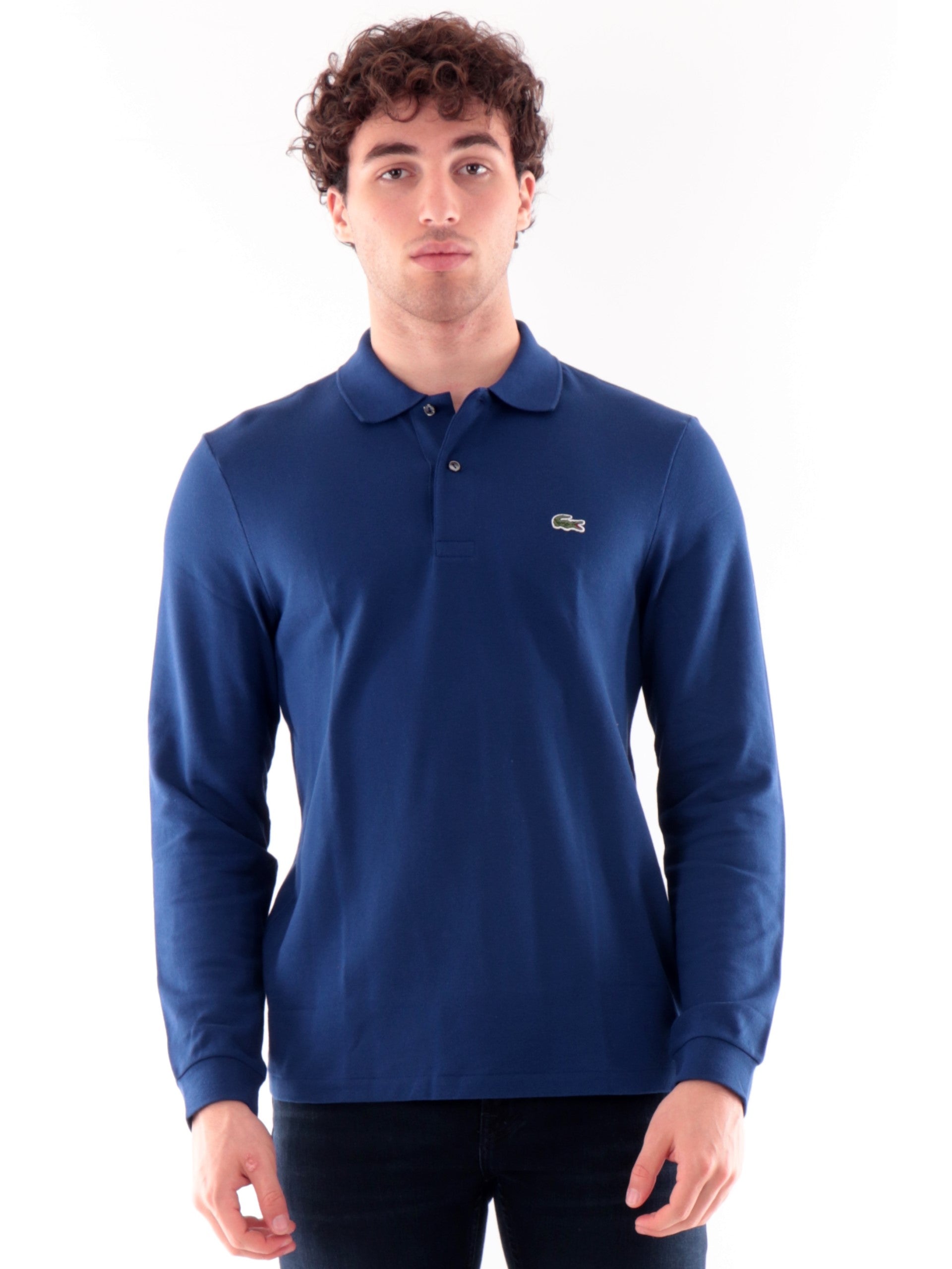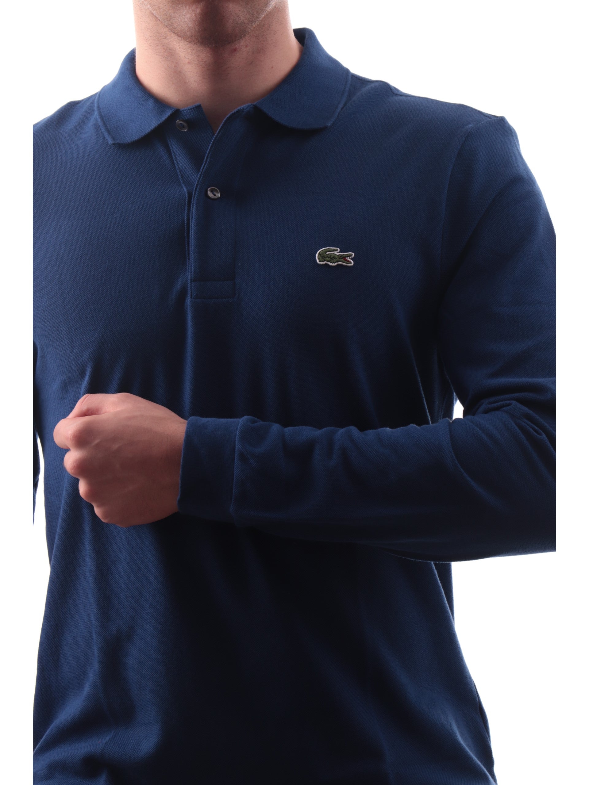 Polo Lacoste blu da uomo a maniche lunghe L1312. Questa polo Lacoste blu ha la chiusura con doppio bottone, la composizione 100% cotone pique, polsini elasticizzati, il fondo regolare ed il leggendario coccodrillo cucito sul davanti lato sinistro.