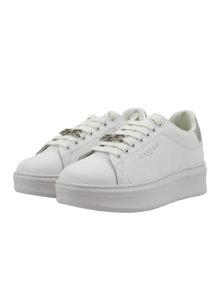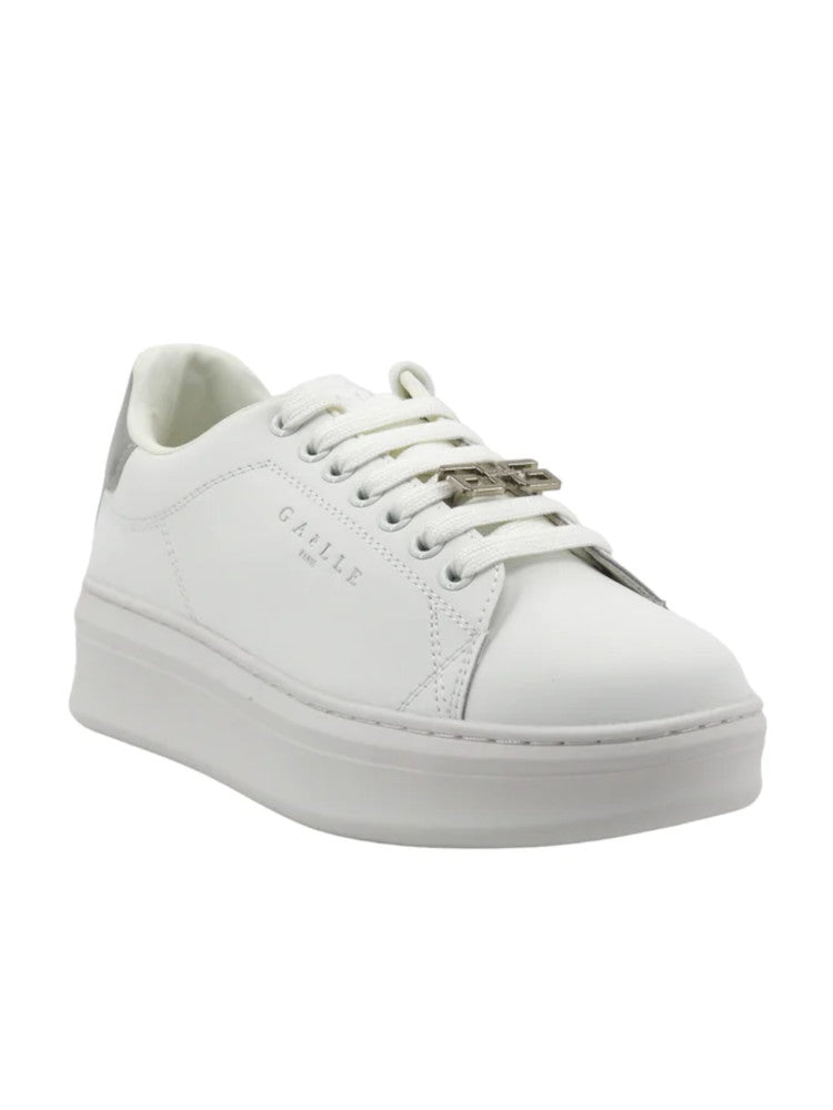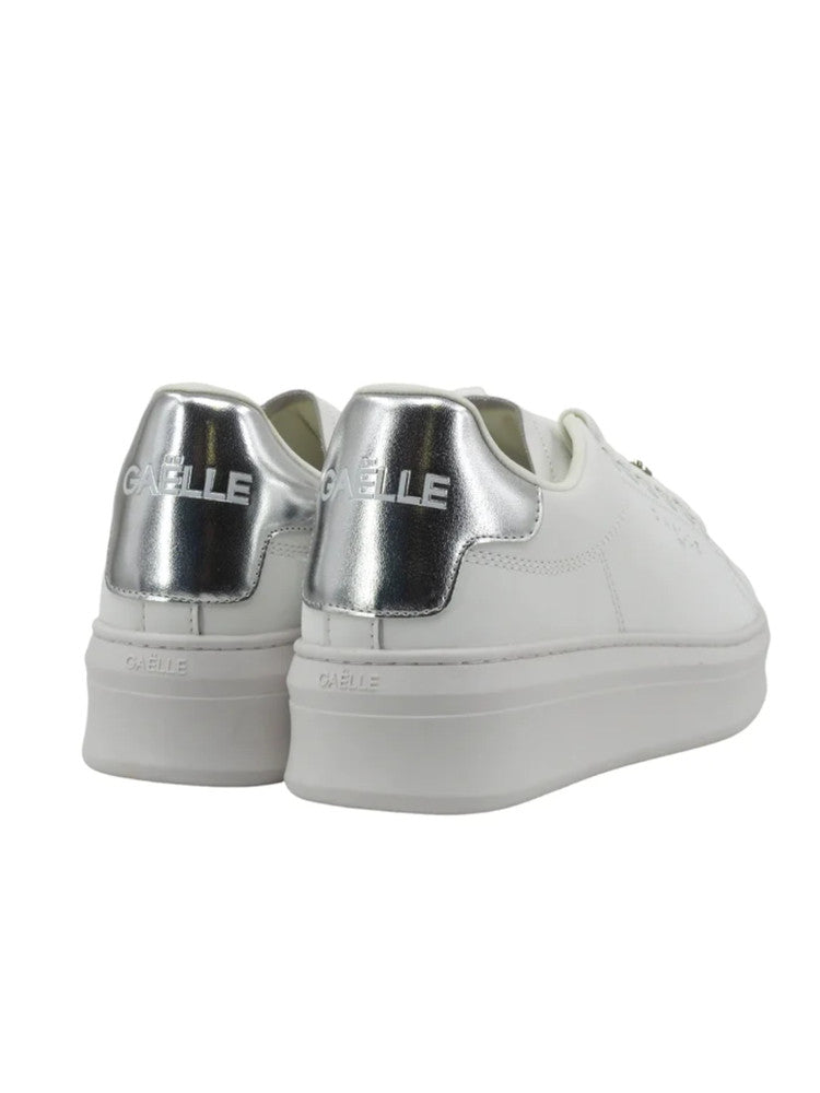 White and silver Gaelle shoes for women Addict GACAW00018. These white Gaelle sneakers have an upper made of eco-leather, a reinforced rubber sole and an insole with a logo texture. On the front of these Gaelle we find the lace closure and the brand patch on the heel area in contrasting colour.