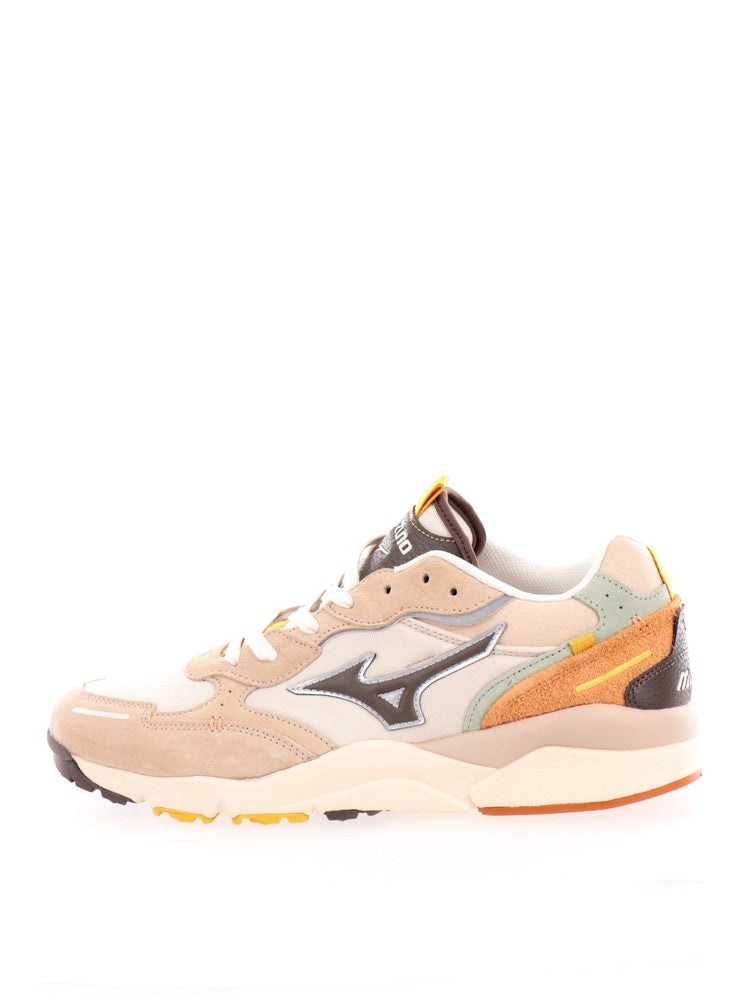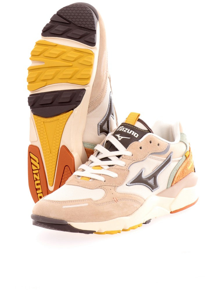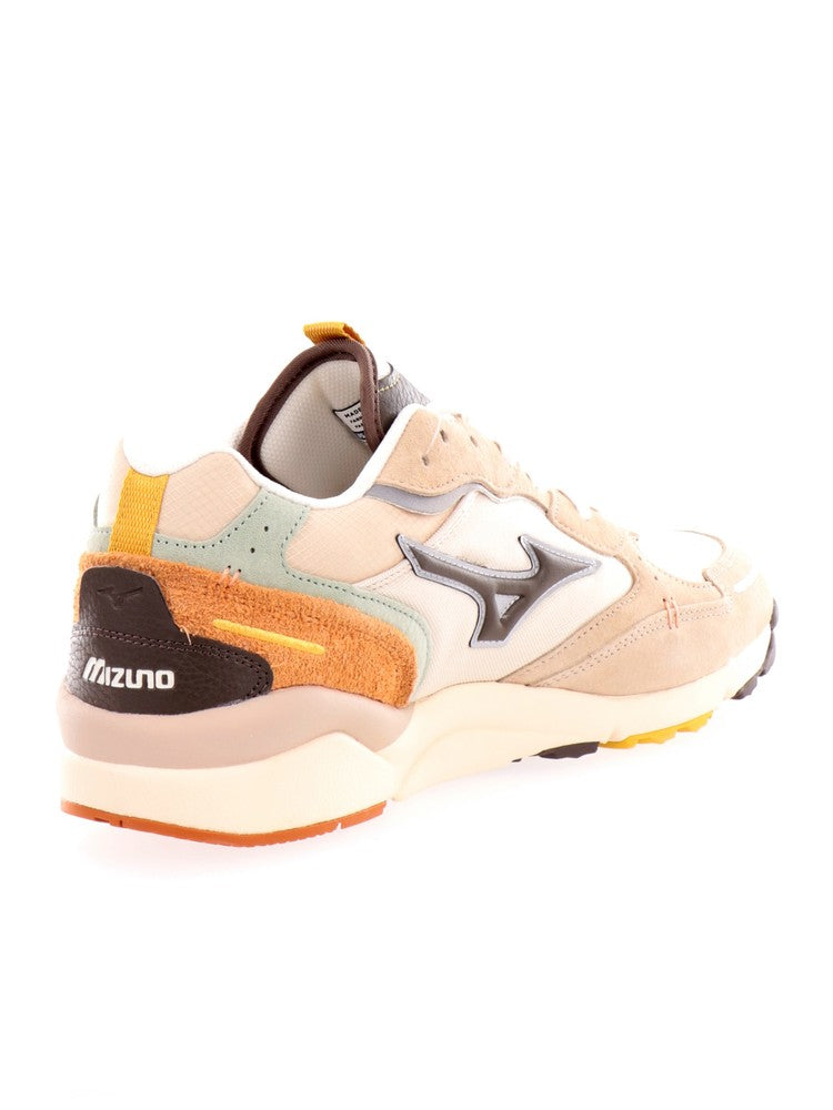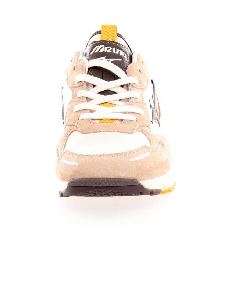 Mizuno beige and orange men's shoes Sky Medal Beta D1GA243. These beige Mizuno sneakers have an upper with leather and fabric inserts, a reinforced rubber sole and a removable insole. On the front of these Mizuno we find the classic lace-up closure, the brand logo on both sides in contrasting color and the 'Mizuno' lettering on the back side.