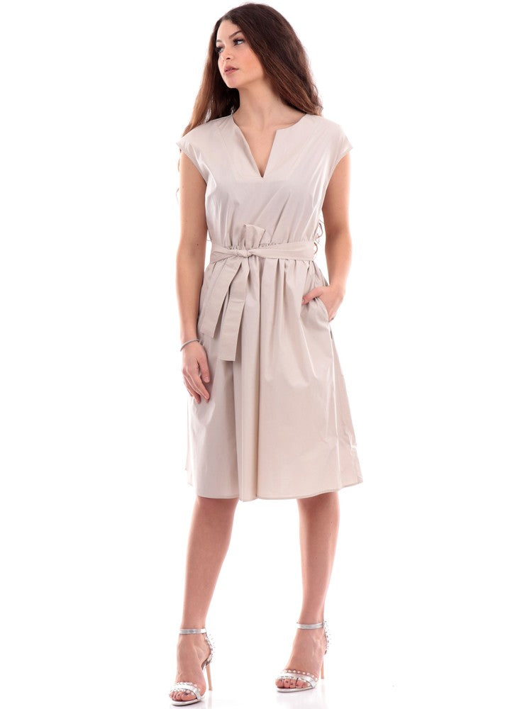 Beige Woolrich women's flared dress with waistline and V-neck. This beige Woolrich women's dress is characterized by a flared bottom, an underskirt that does not make it transparent and butterfly sleeves.