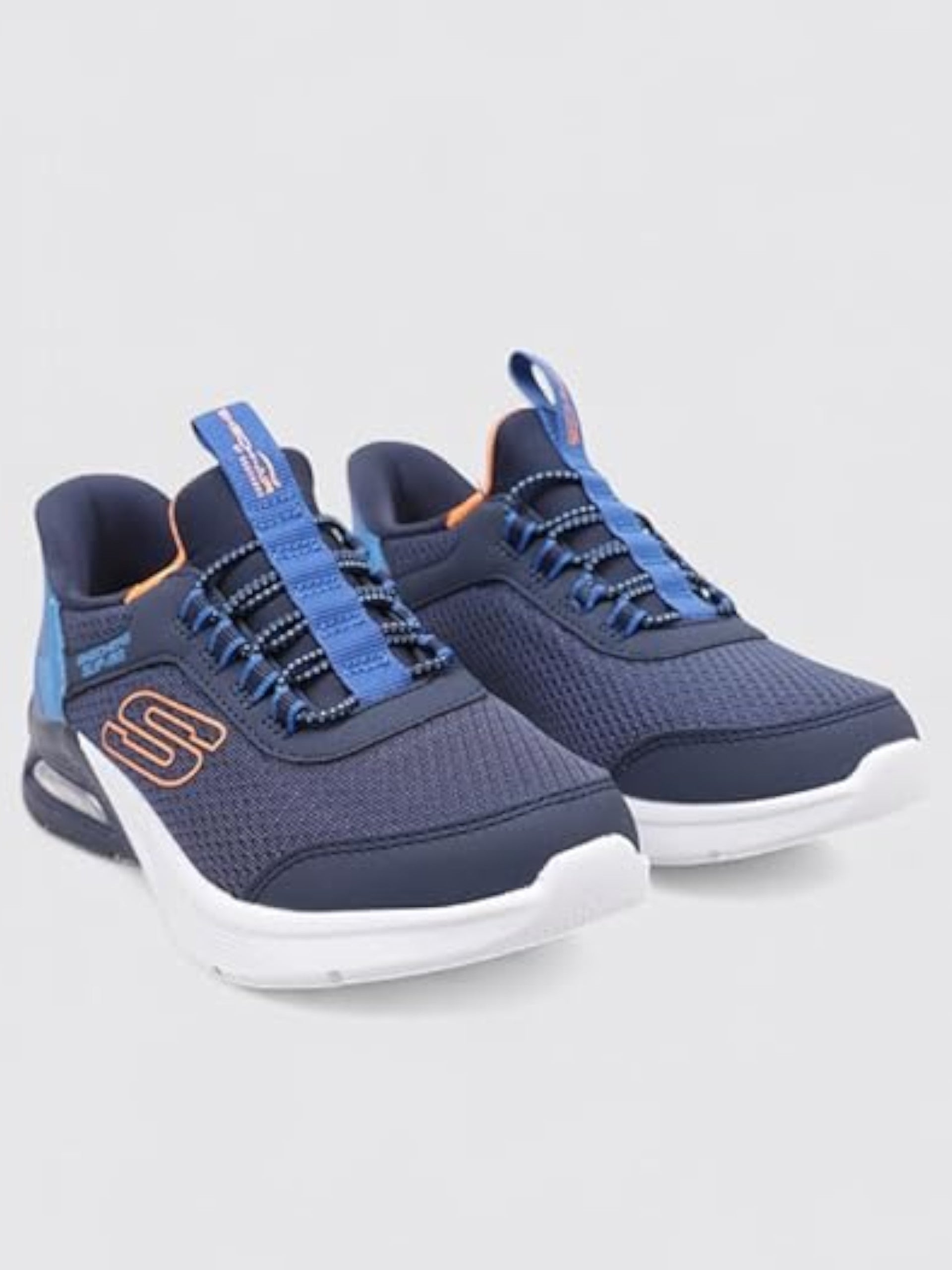 Scarpe Skechers blu Microspec Max Brisk Stripe Kids 403890L. Queste scarpe Skechers blu hanno la tomaia in mesh con inserti in tessuto traspirante, la chiusura slip on, la suola in gomma con tecnologia ArchFit che garantisce un corretto sostegno dell'arco plantare ed il sottosuola antiscivolo che dona maggiore grip su tutte le superfici.