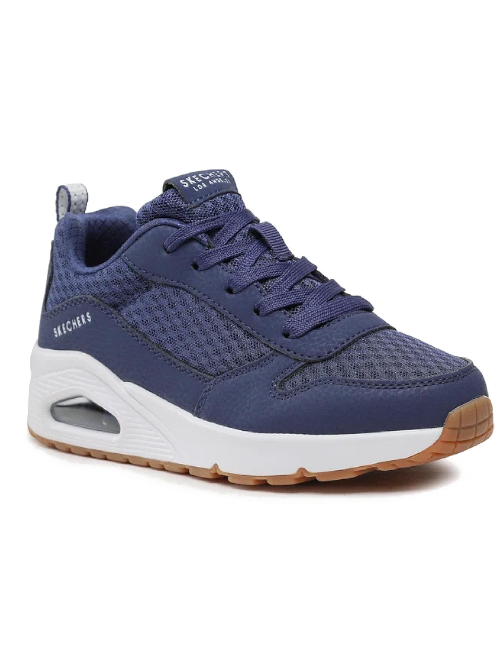 Scarpe Skechers blu Uno Powex da bambino 403667L. Queste sneakers Skechers blu hanno la tomaia in mesh con inserti in tessuto, allacciatura con lacci, suola in gomma con tecnologia Memory Foam ergonomica per il corretto sostegno dell'arco plantare ed il sottosuola con trama antiscivolo per avere maggiore aderenza sulle diverse superfici.