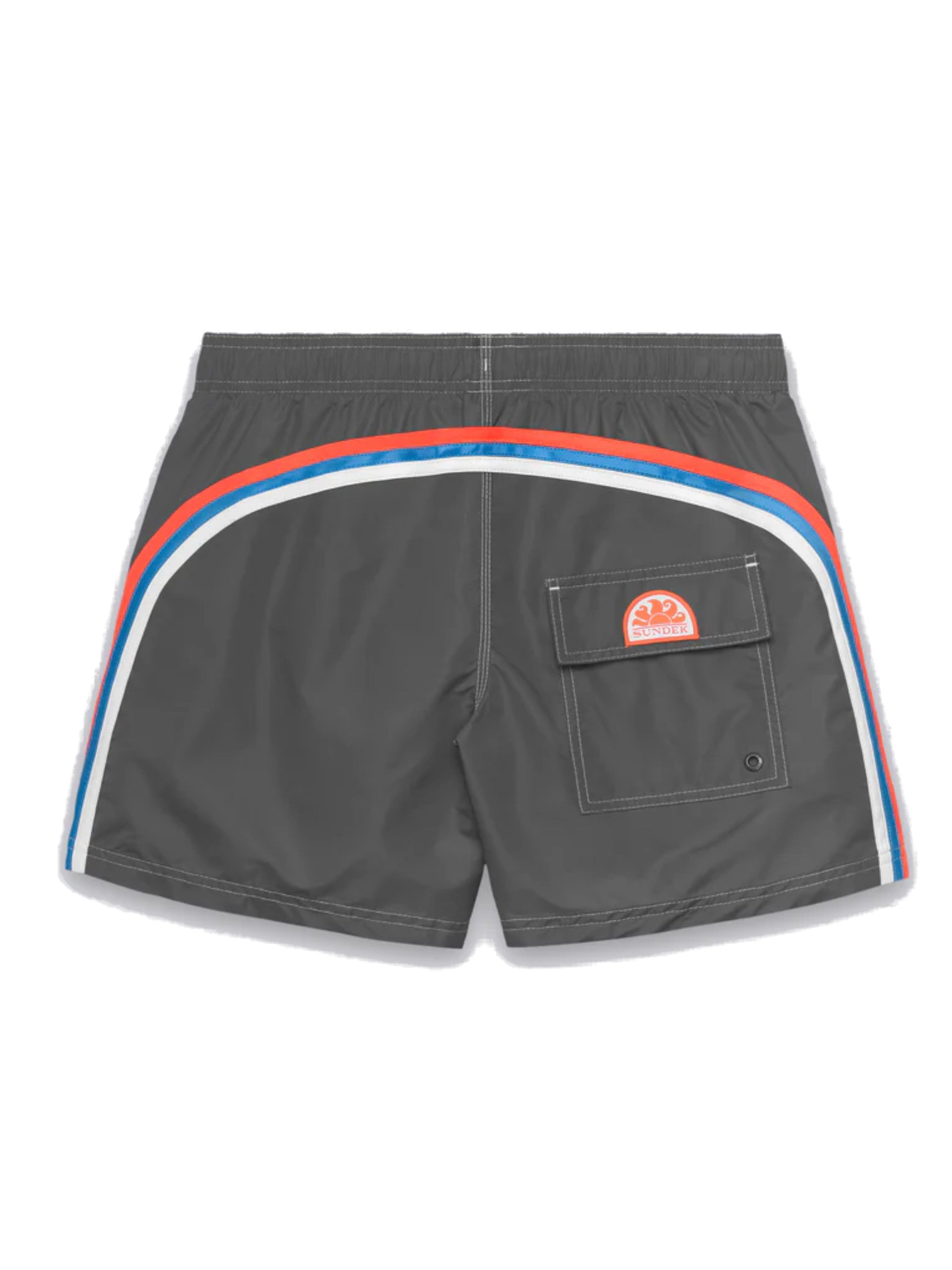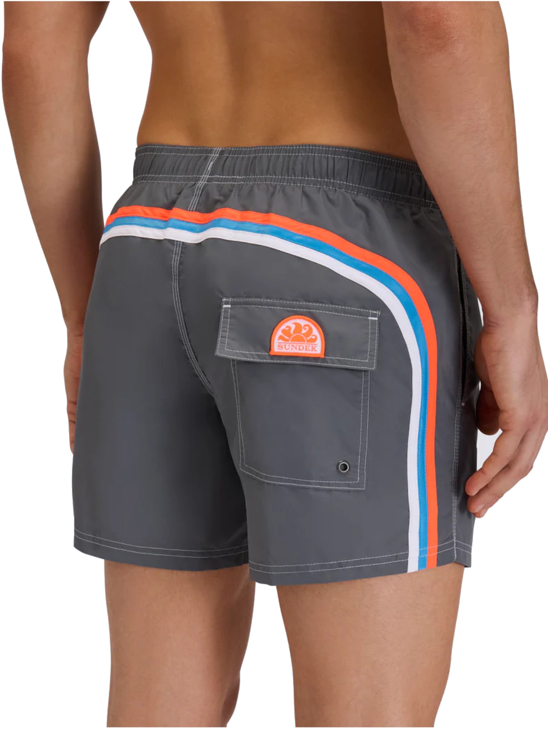 Costume mare Sundek grigio da uomo è realizzato in tessuto in grado di asciugarsi in pochissimi minuti. Questo costume Sundek uomo ha la banda elastica sul punto vita regolabile con laccetti,due tasche laterali aperte, la retina interna traspirante, il logo del brand ricamato sul lato destro a contrasto colore, un taschino posteriore con patta con il patch del brand e l'arcobaleno del brand applicato sul retro.