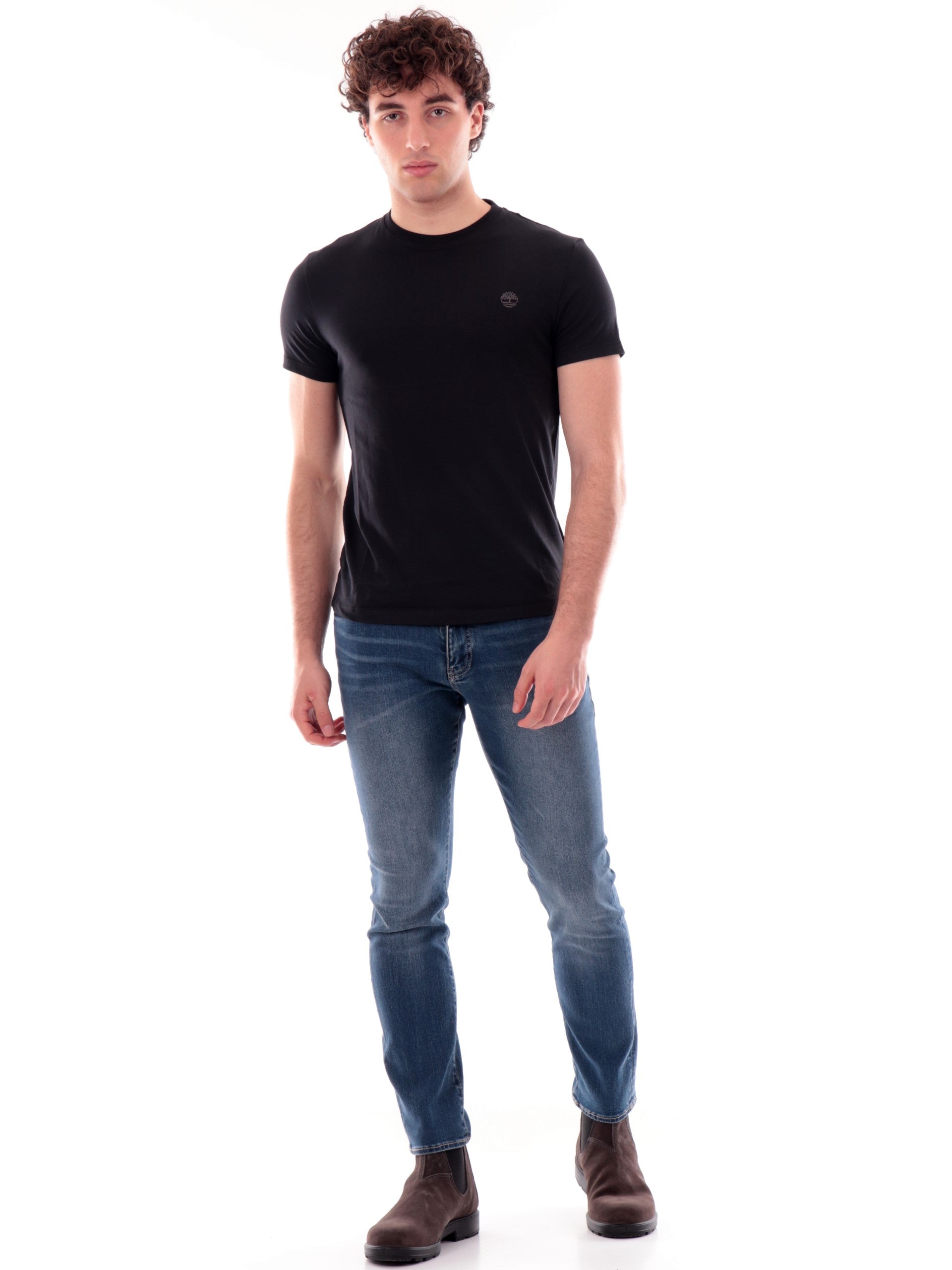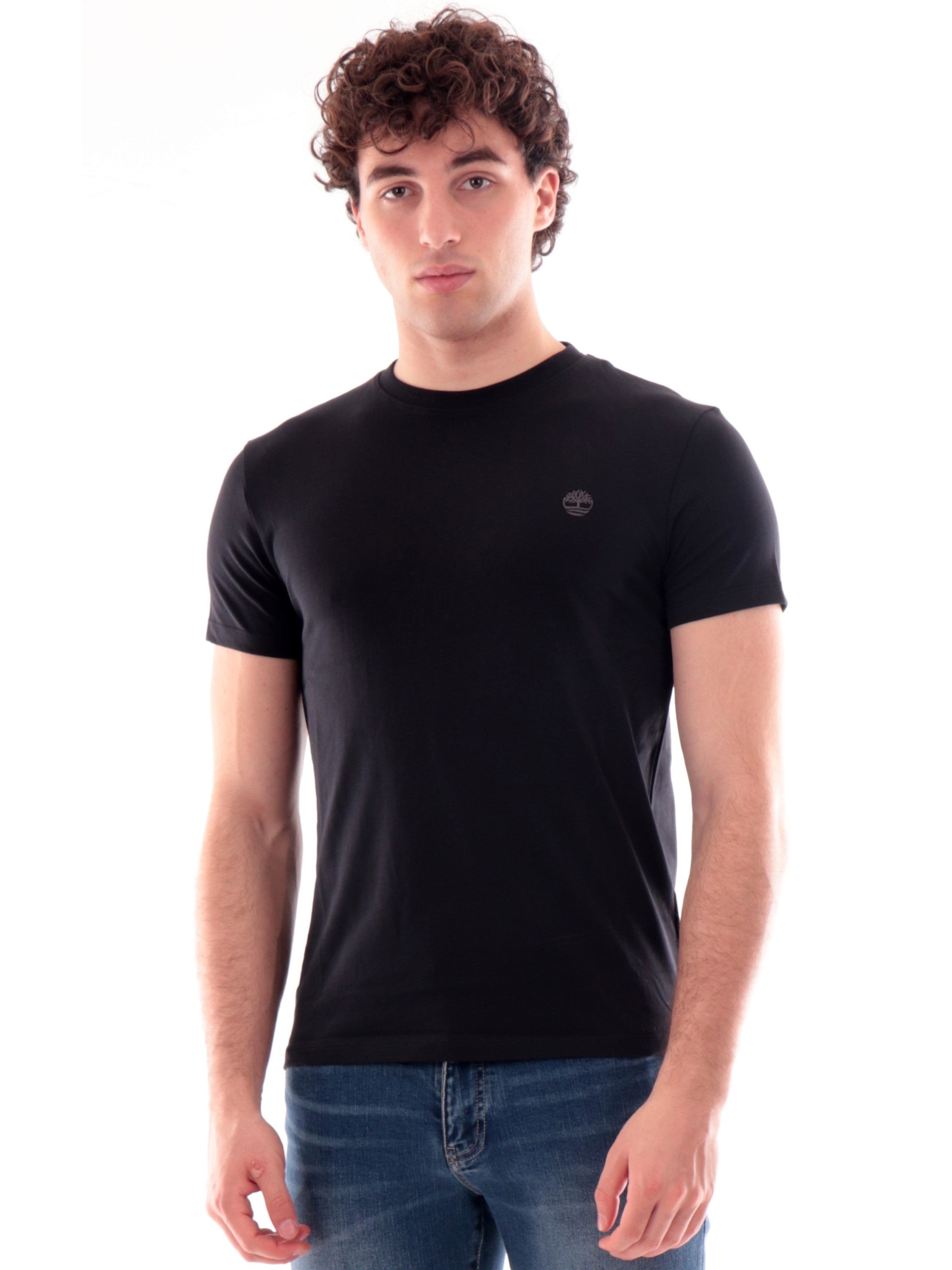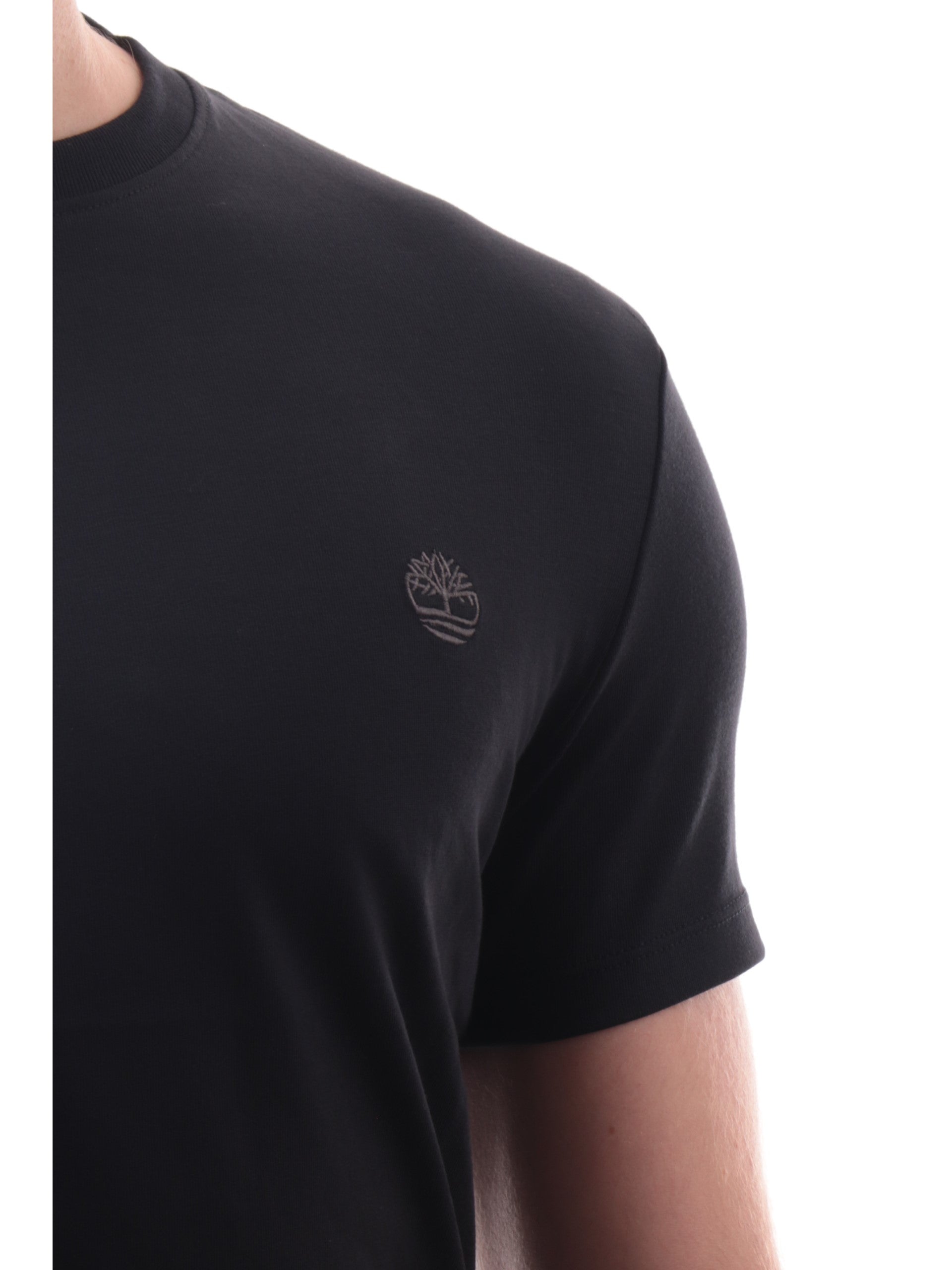 Maglia Timberland nera girocollo da uomo Dunstan River TB0A2BPR, realizzata in 100% cotone. Questa t-shirt Timberland nera girocollo ha le maniche corte e il logo ricamato lato cuore.