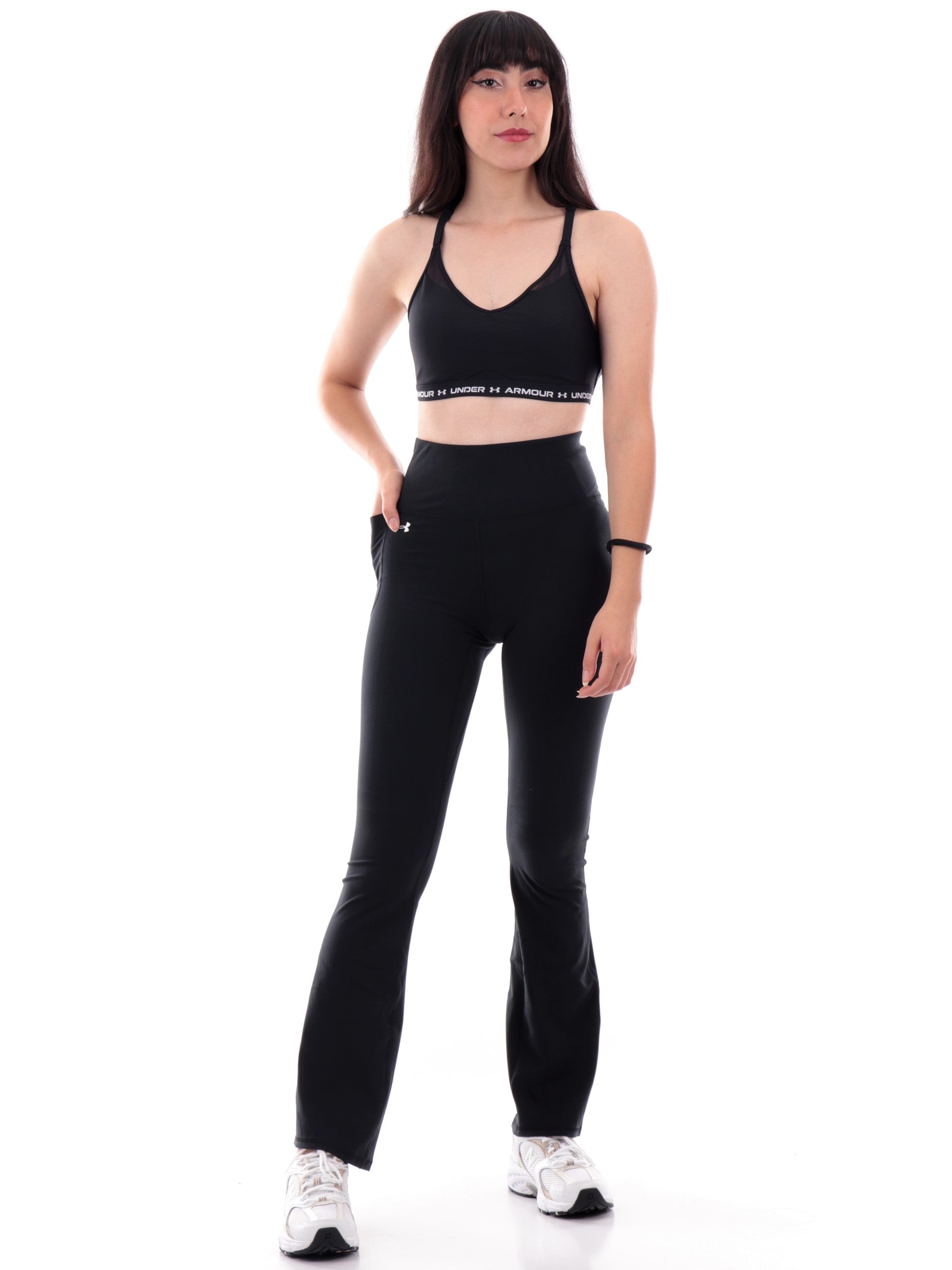 Leggings Under Armour neri da donna Motion Flare 13791760, realizzati in tessuto tecnico traspirante. Questi leggings flare Under Armour neri hanno la banda elastica sul punto vita, un taschino aperto sul lato destro e il fondo ampio.