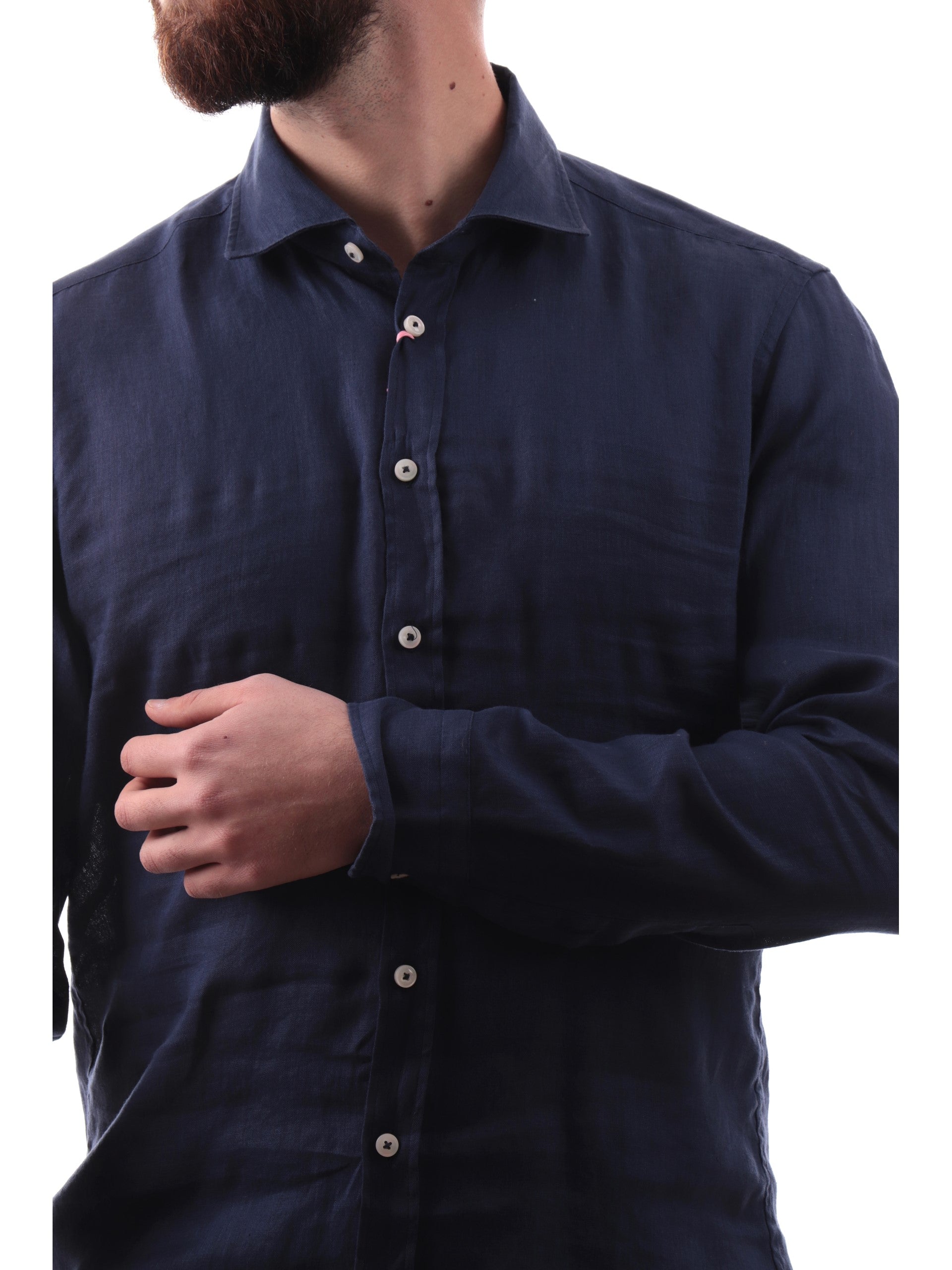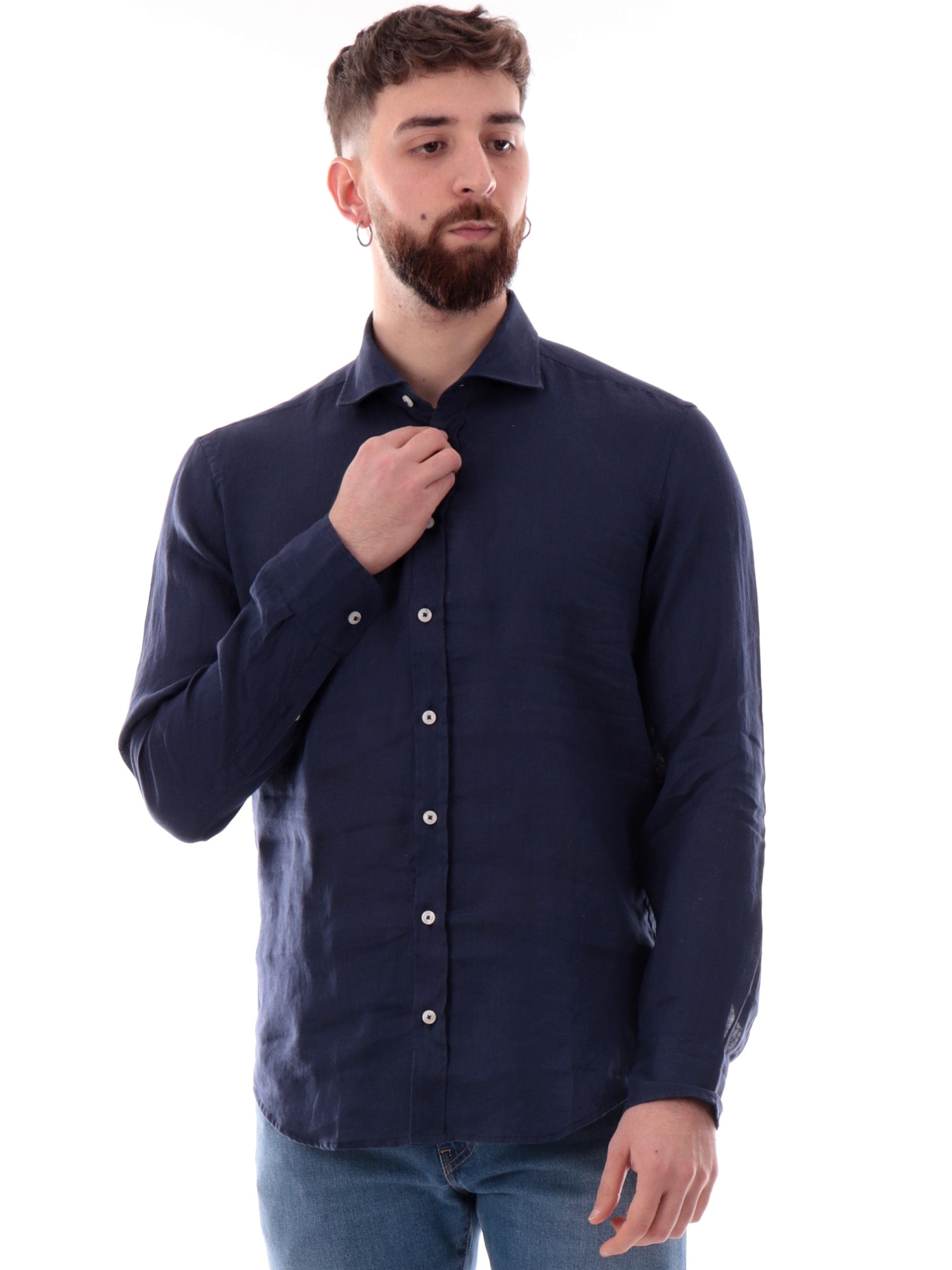 Camicia Bastoncino blu 100% lino da uomo maniche lunghe B05023, realizzata in Italia. Questa camicia uomo Bastoncino blu ha il colletto alla francese, la chiusura con bottoni, le maniche lunghe e la composizione in 100% lino.