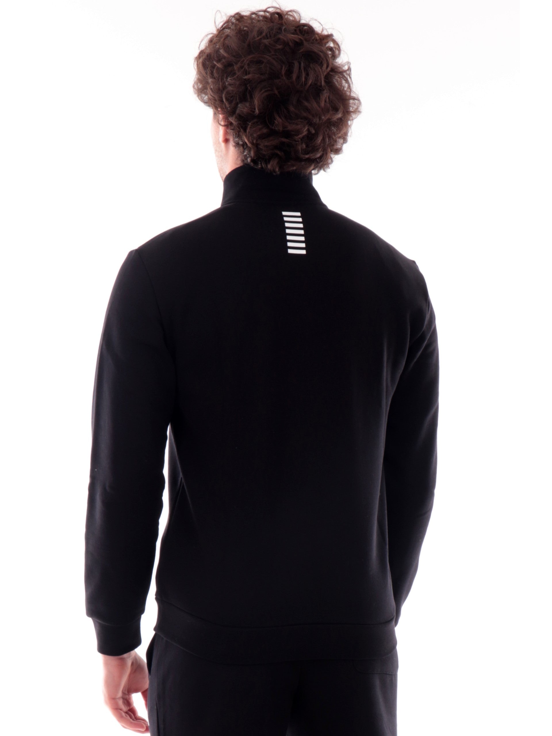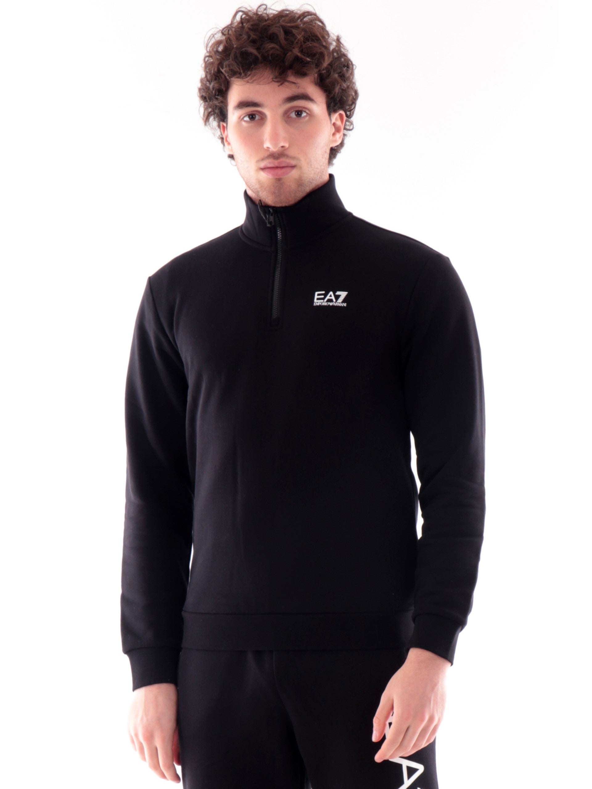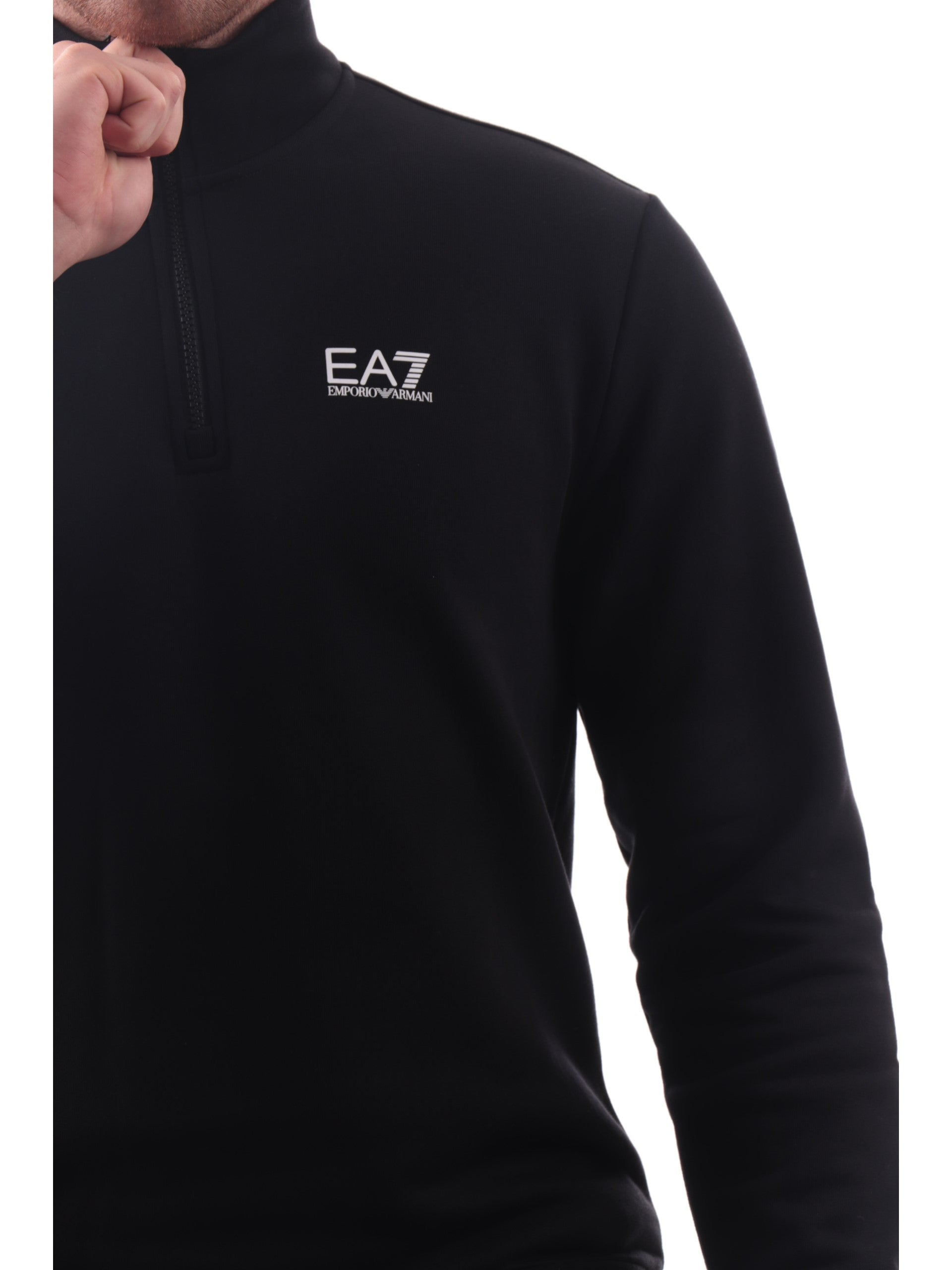 Felpa nera a colloalto mezza zip EA7 da uomo felpata. Questa felpa nera EA7 da uomo realizzata in cotone felpato, caldo ed avvolgente perfetta per i primi freddi, è caratterizzata dal colloalto,mezzazip, la scritta EA7 applicato a lato cuore, polsini e fondo elasticizzati a costine