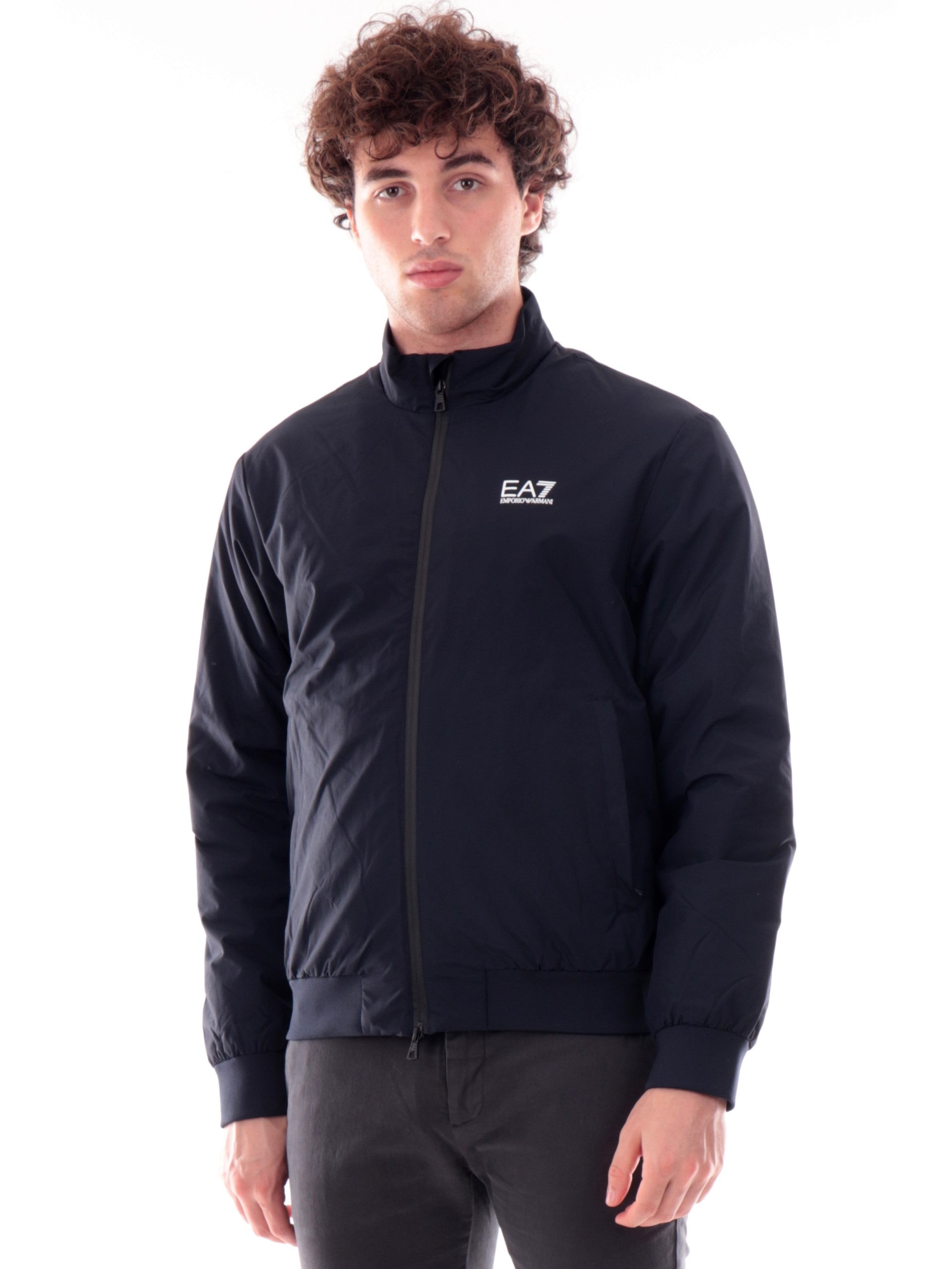 Giubbino EA7 blu da uomo tessuto tecnico. Questo giubbino è realizzato da un tessuto tecnico perfetto per la stagione autunno-inverno, al suo interno troviamo un tessuto in eco teddy morbido, sofficeed avvolgente perfetto per i primi freddi. Questo giubbino Emporio Armani è caratterizzato da una chiusura full zip con doppio cursore, polsini e fondo elasticizzati a costine e il logo del brand applicato a lato cuore
