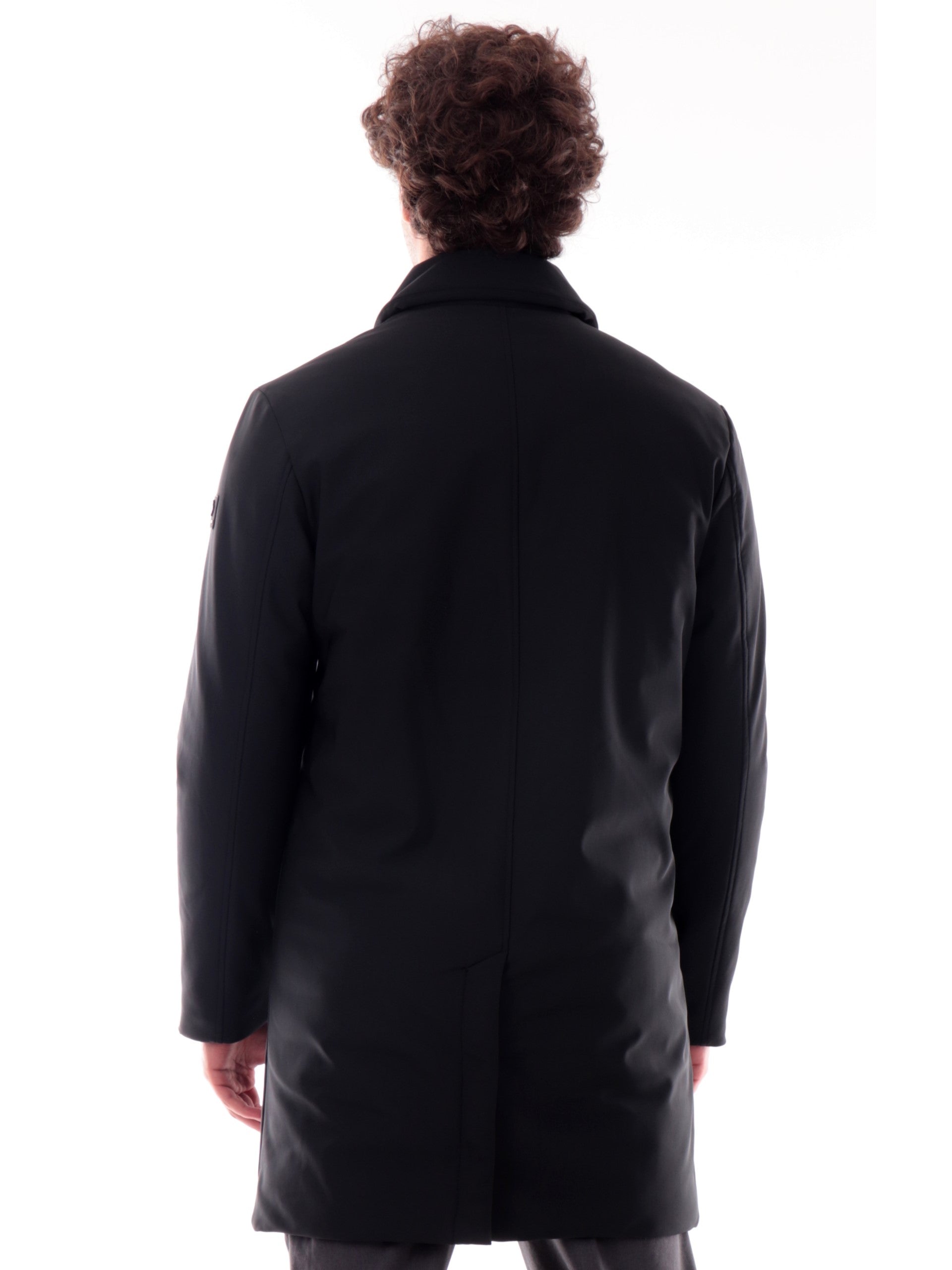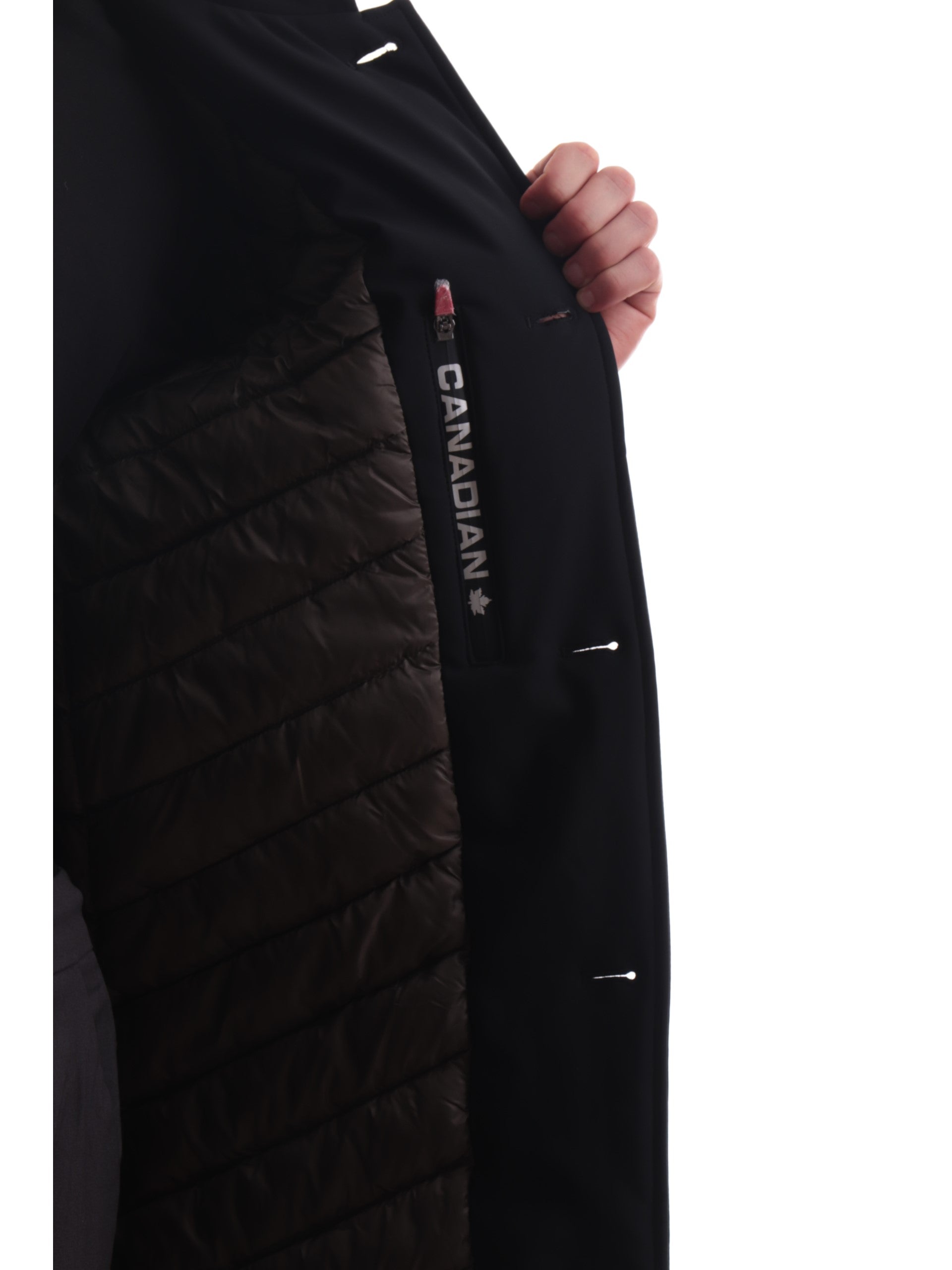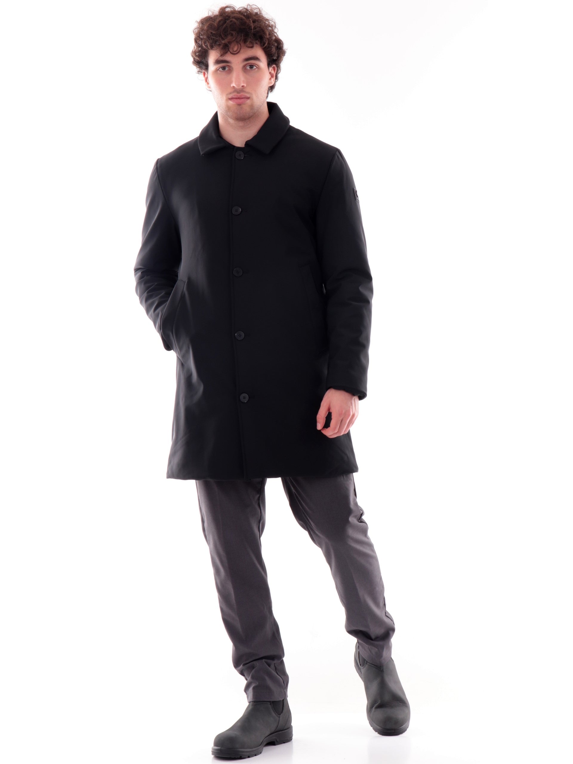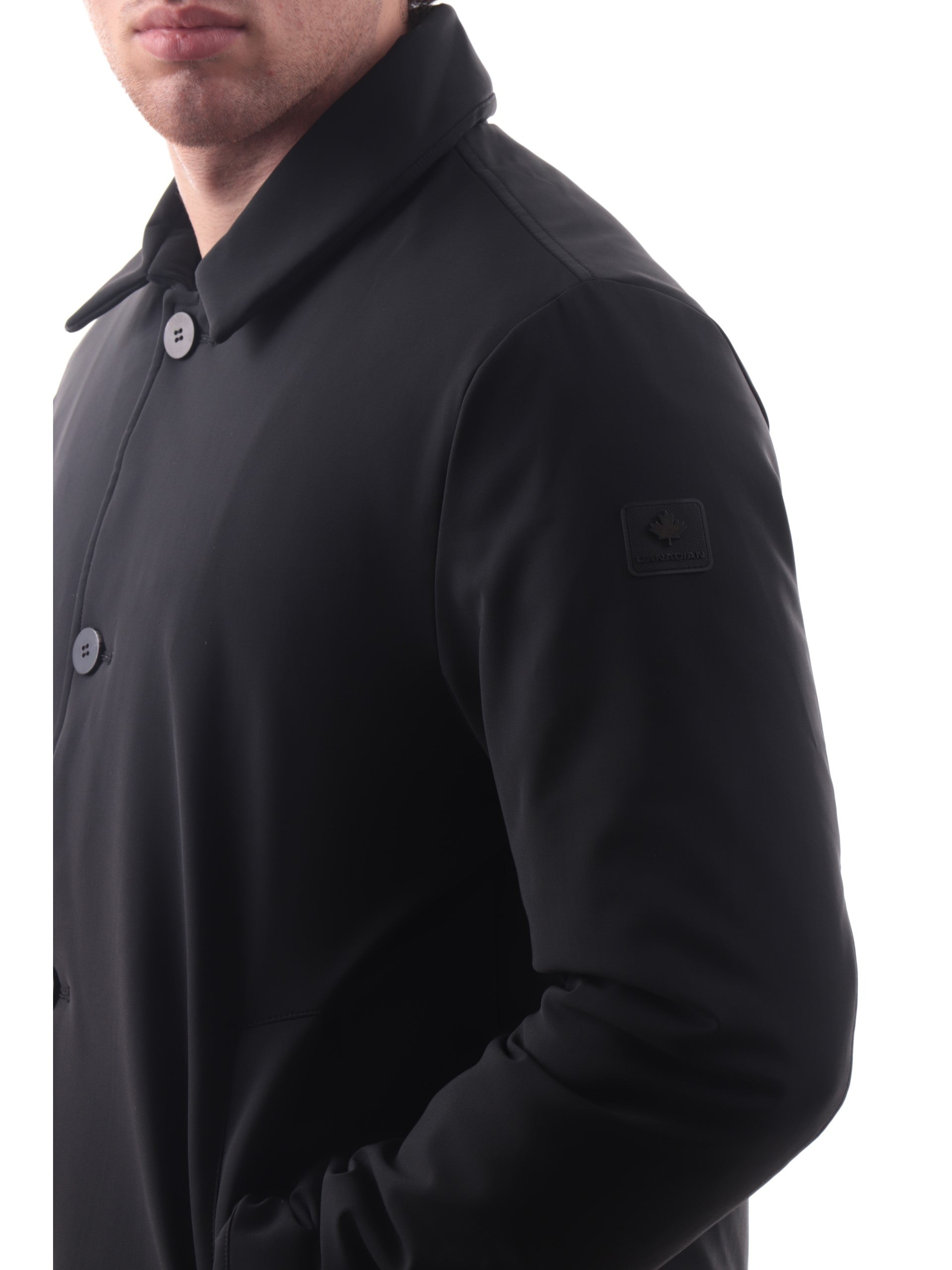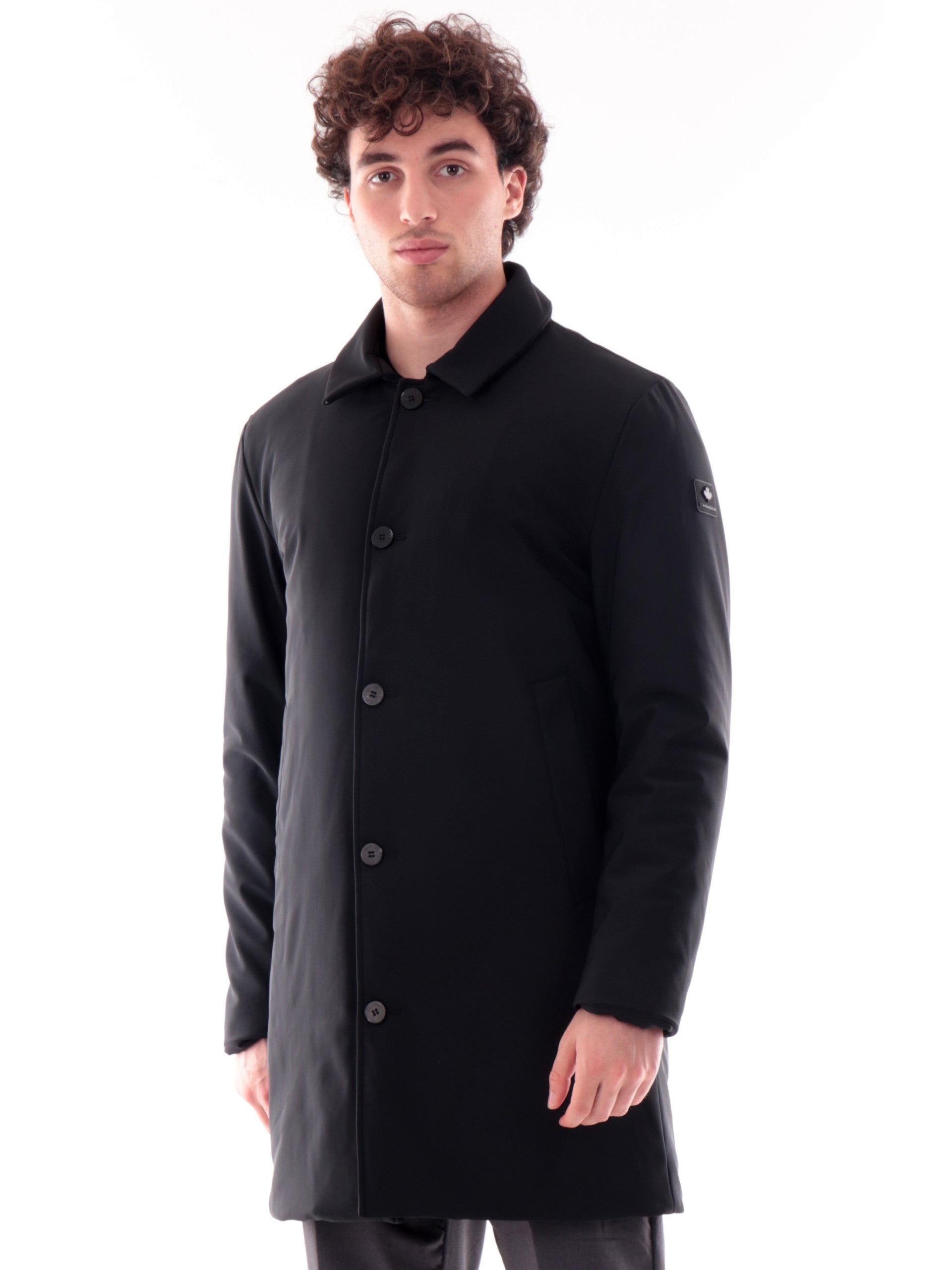 Cappotto nero Canadian da uomo Frank. Questo cappotto Canadian è realizzato in tech stretch traspirante, Frank è ideale per chi si muove ogni giorno ed è realizzato da un tessuto Leggero, resistente e comoda, con imbottitura in calda perfetta per la stagione invernale. Questo cappotto è caratterizzato dalla chiusura a bottoni, due tasche laterali aperte, polsini e fondo regolare, all'interno di questo cappotto troviamo una tasca con zip.