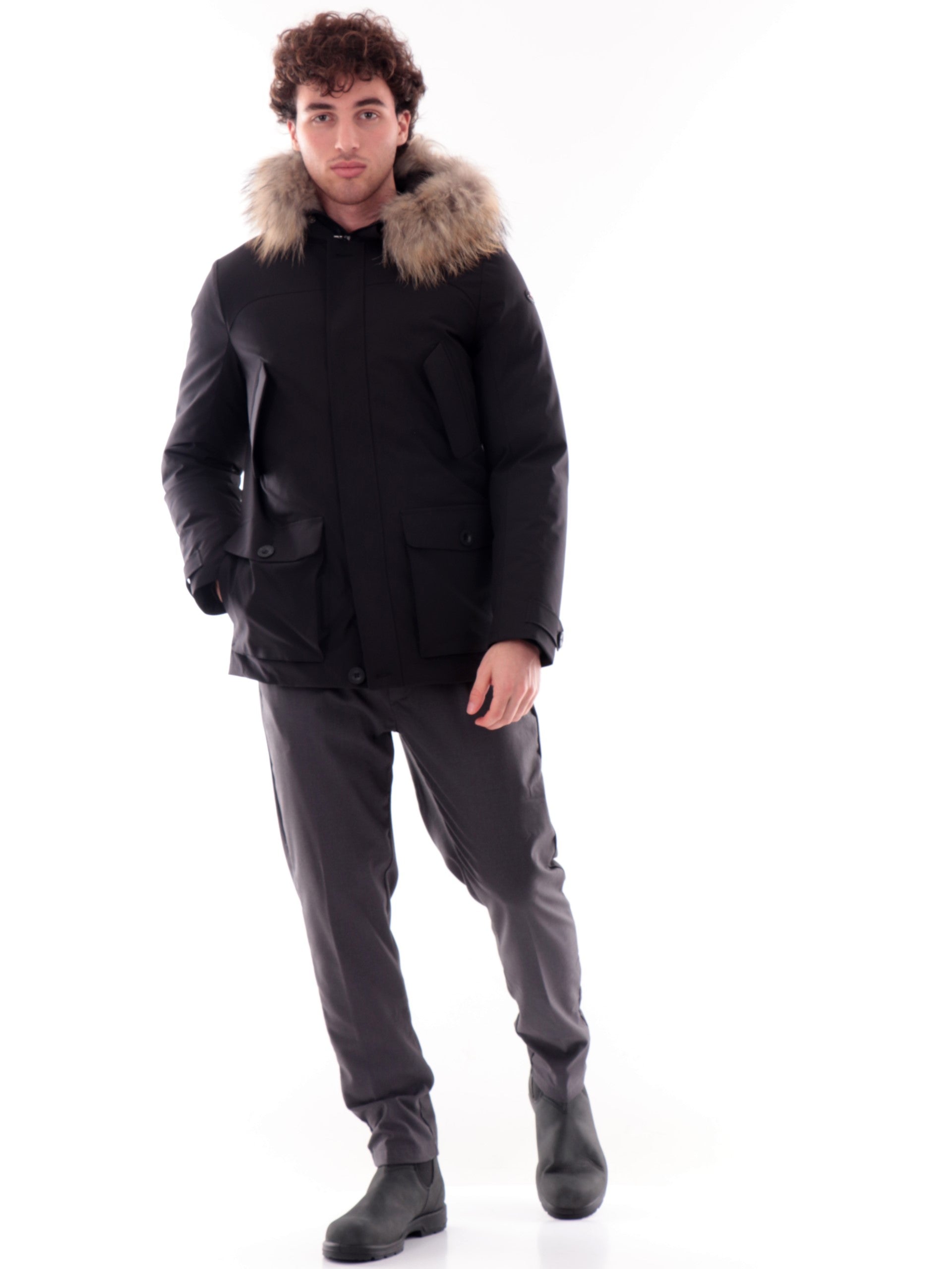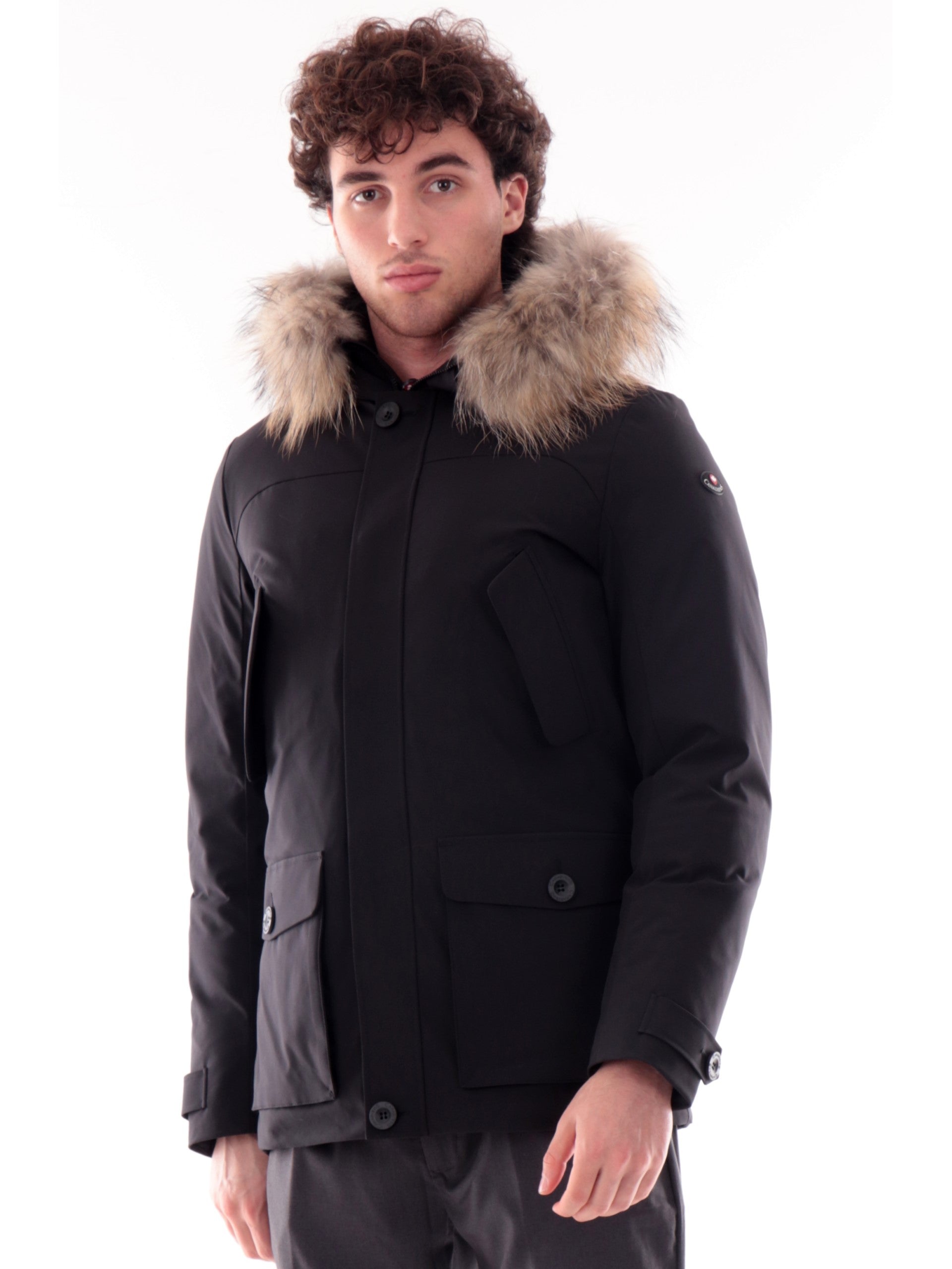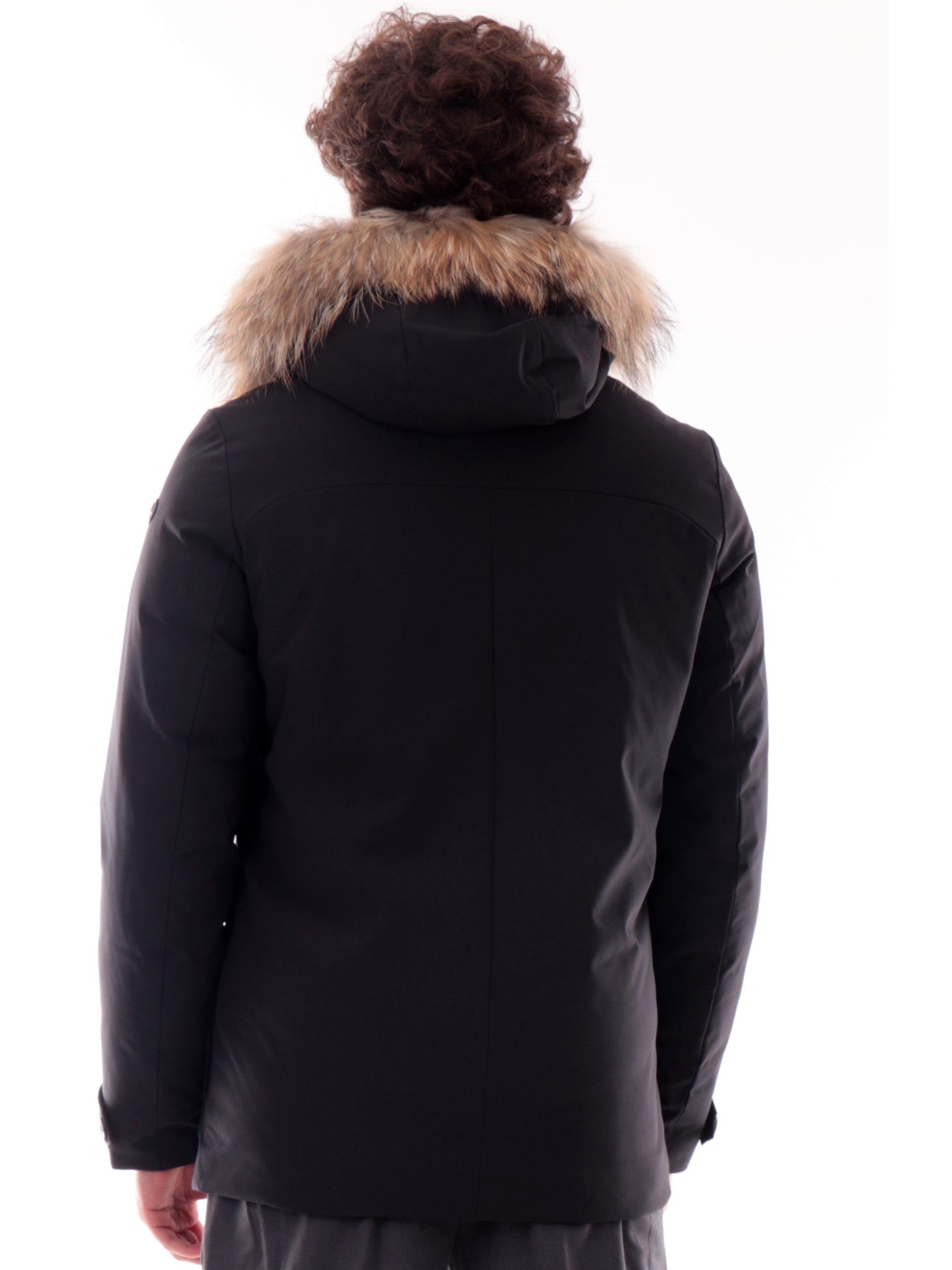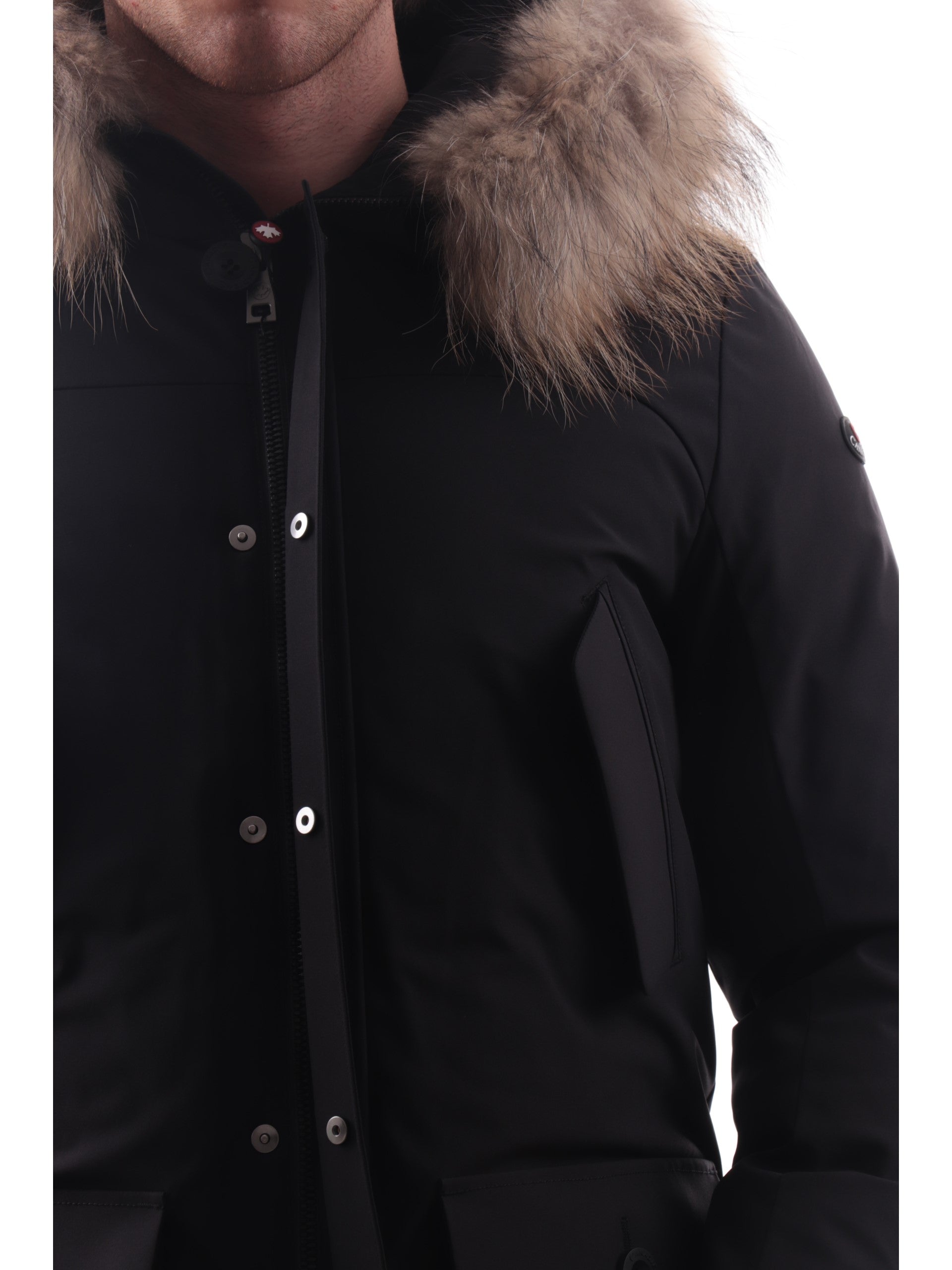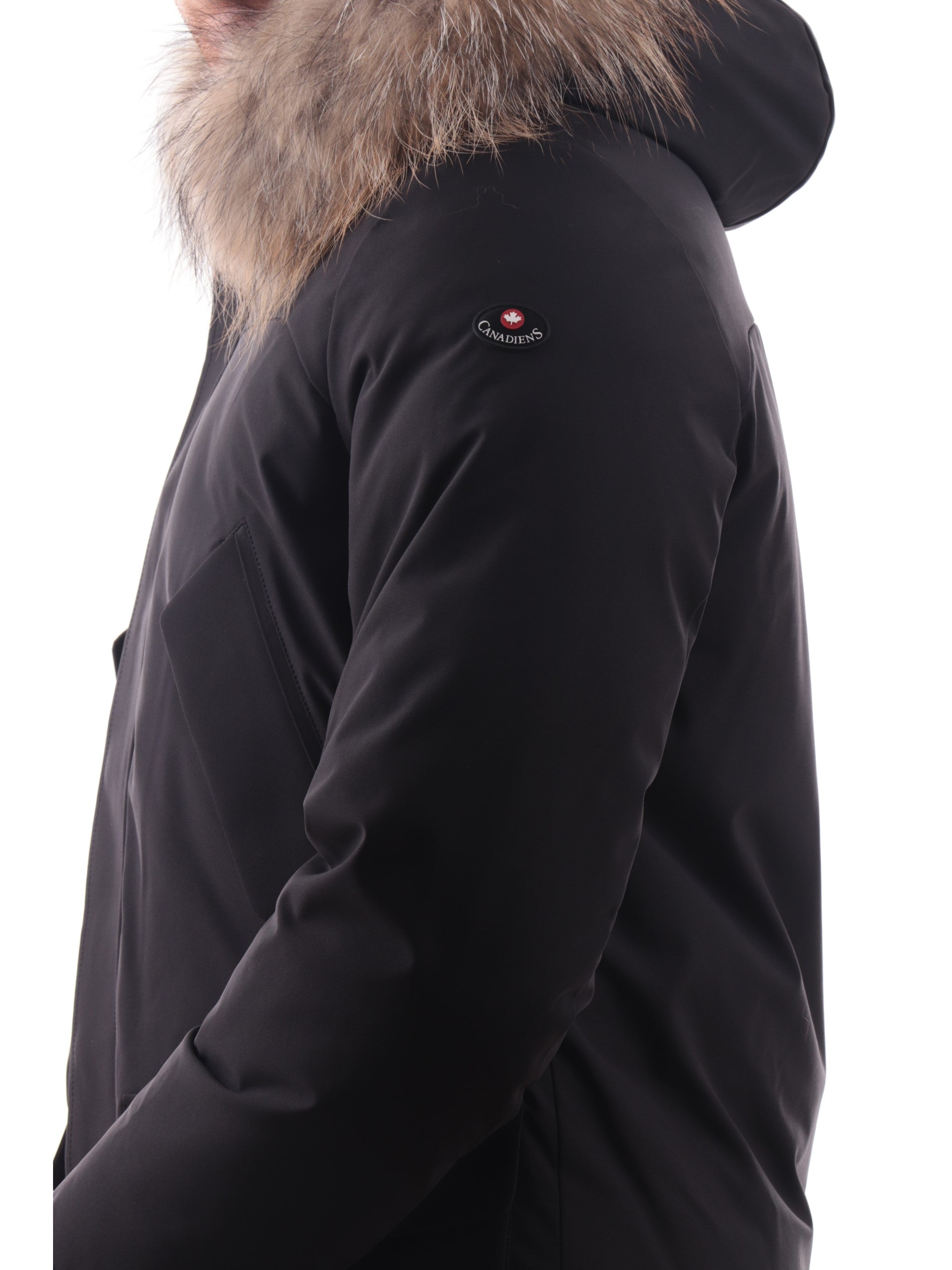 Giacca Canadiens nera da uomo Bonfield Tech 2.0 con pelliccia. Questo parka da uomo nero è realizzato dal tessuto Hidra-Nek per rimanere sempre protetti da acqua e vento e un' imbottitura in vera piuma perfetto per l'inverno. Questa giacca è caratterizzata dal cappuccio fisso con pelliccia naturale staccabile, chiusura con zip con doppio cursore e con una patta a bottoni, sul davanti troviamo quattro tasche ampie, maniche regolabili con bottoni, polsini elasticizzati e fondo regolare