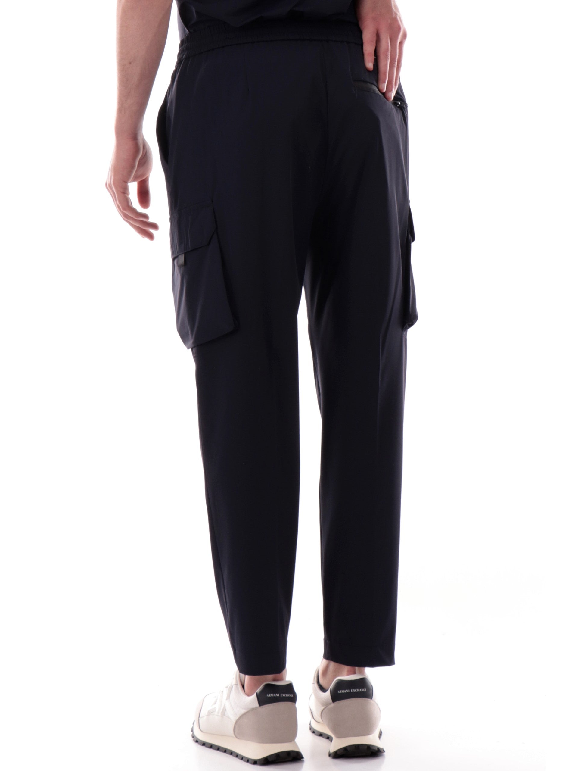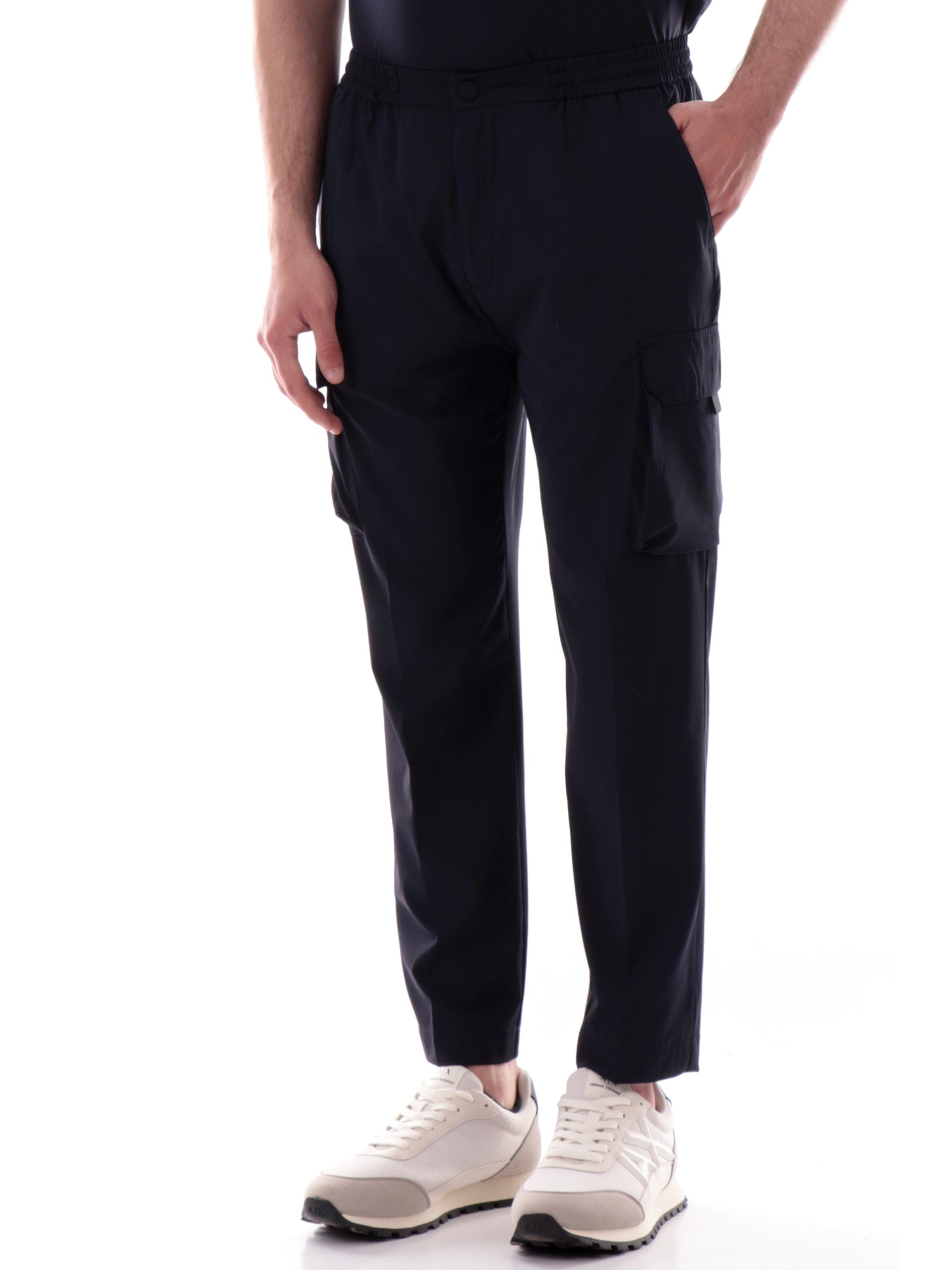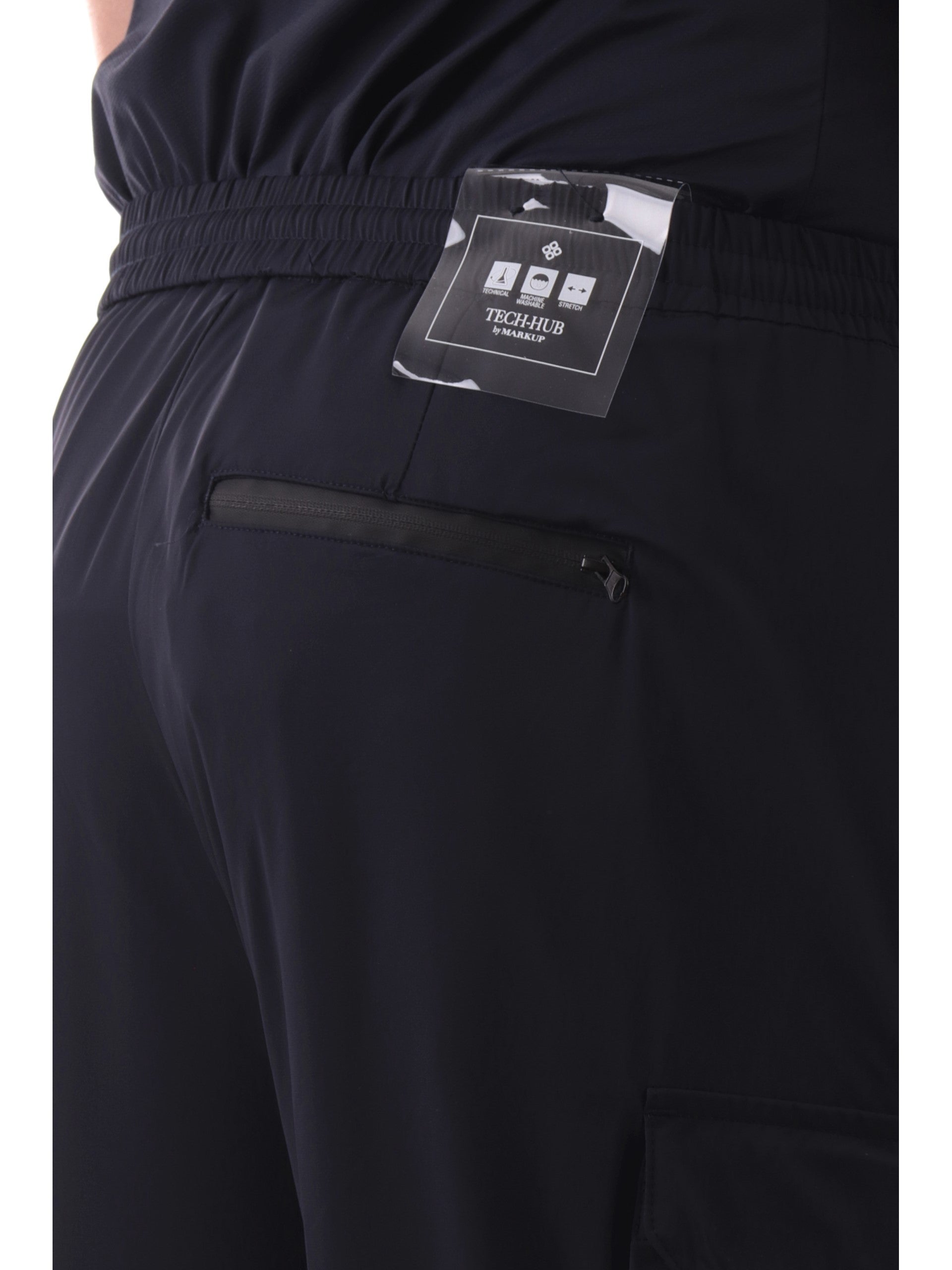 Pantaloni cargo Markup blu da uomo tessuto tecnico MK895185. Questi pantaloni uomo Markup blu hanno la chiusura con bottone automatico più zip, la banda elastica sul punto vita, due tasche laterali aperte, una tasca posteriore con zip e due tasconi altezza ginocchio con patta.