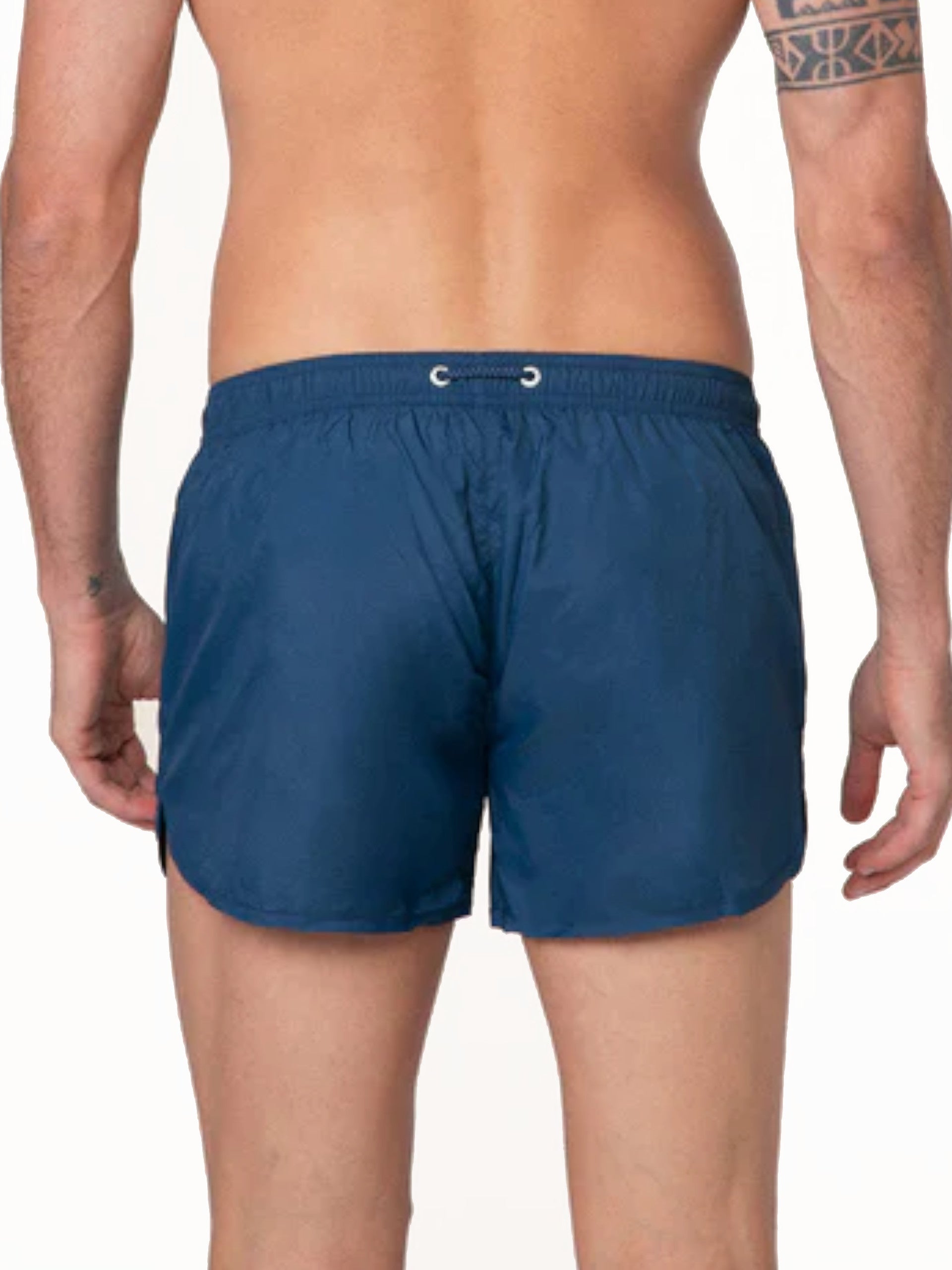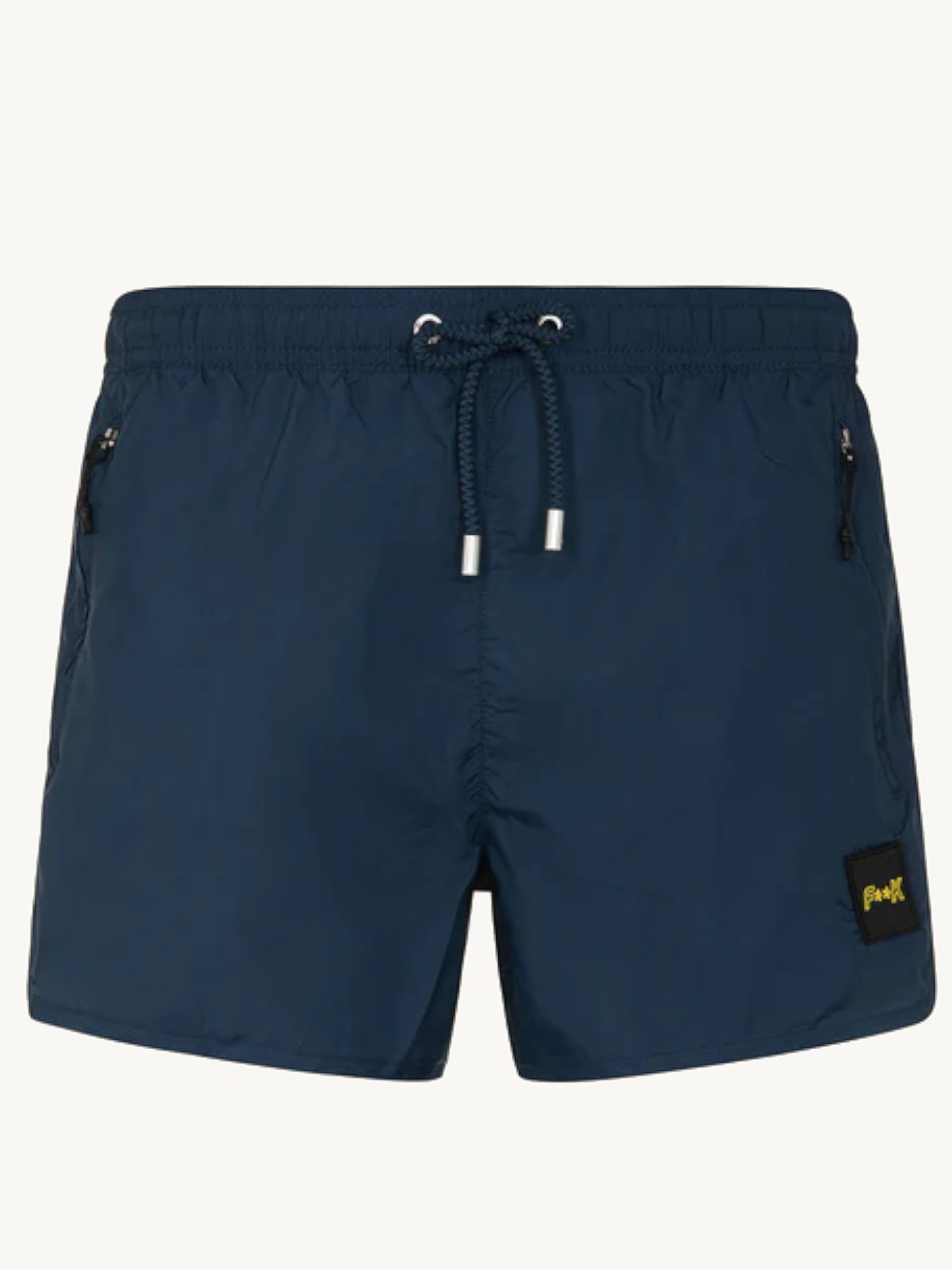 Costume mare Effek blu da uomo patch gommato M01BU03, realizzato in tessuto in grado di asciugarsi in pochissimi minuti. Questo costume F**K blu ha la banda elastica sul punto vita regolabile con laccetti, la retina interna traforata, due tasche laterali con zip e il patch Effek applicato sul fondo.