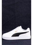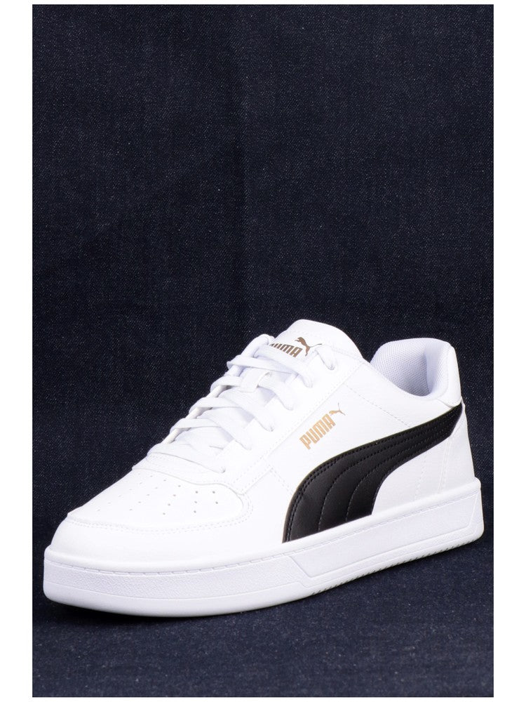 White Puma men's shoes Caven 2.0 39229. These Puma sneakers have a mesh upper and a rubber sole. On the front of these Puma we find the classic lace closure, the breathable holes and the contrasting color brand logo.