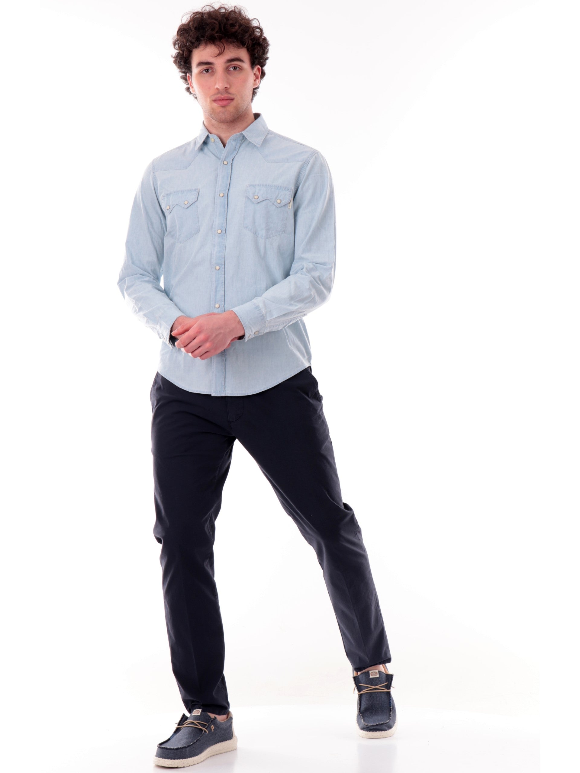 Camicia Roy Roger's Western realizzata in jeans chiaro con doppio taschino sul davanti da uomo. Questa camicia uomo Roy Roger's jeans è perfetta per dare un tocco di stile ai tuoi outfit. Il tessuto di questa Camicia jeans uomo la rende comoda ed avvolgente. Questa camicia è caratterizzata dal colletto classico, chiusura con bottoni, due taschini sul davanti, polsini con due bottoni e fondo regolare
