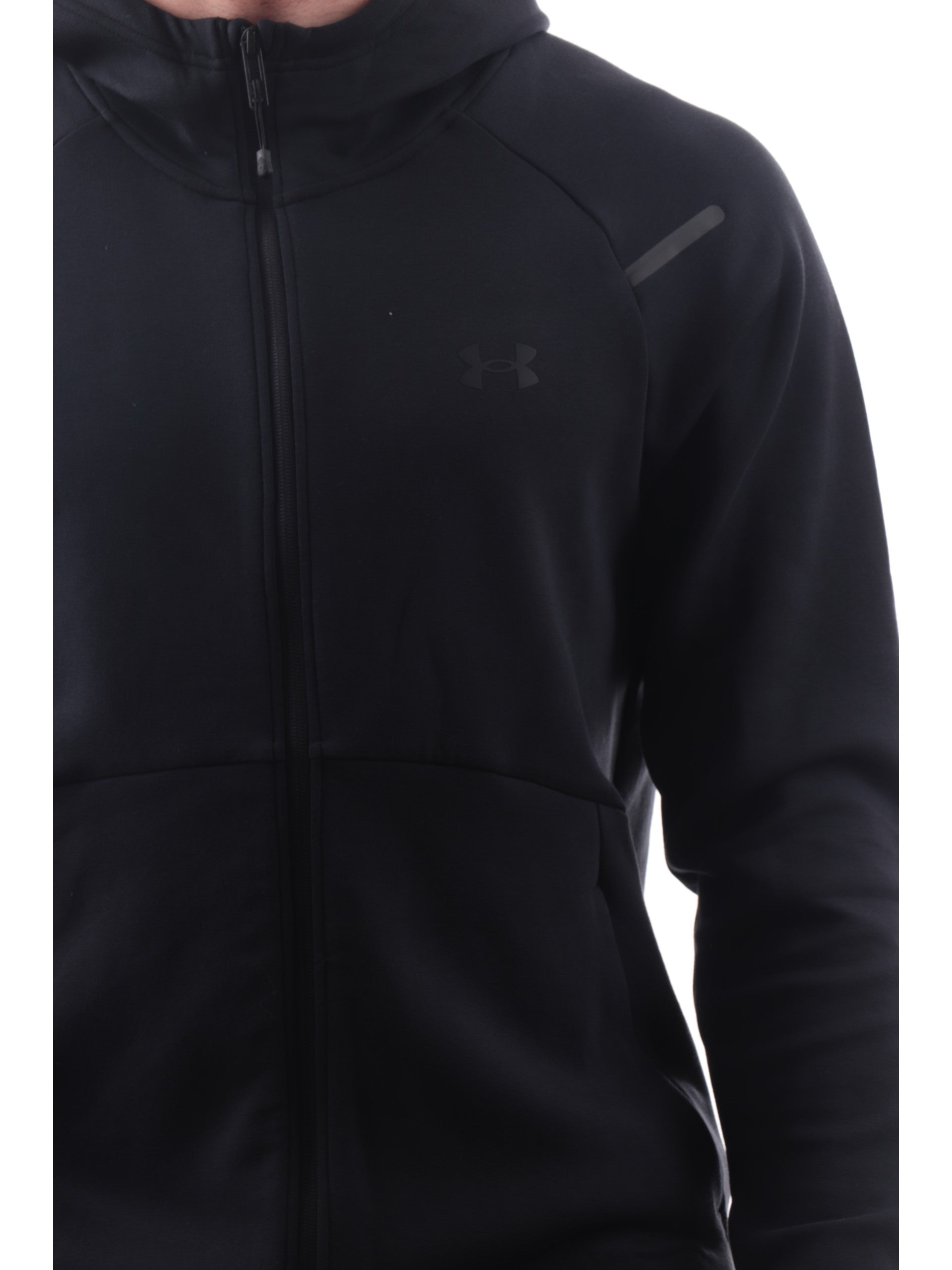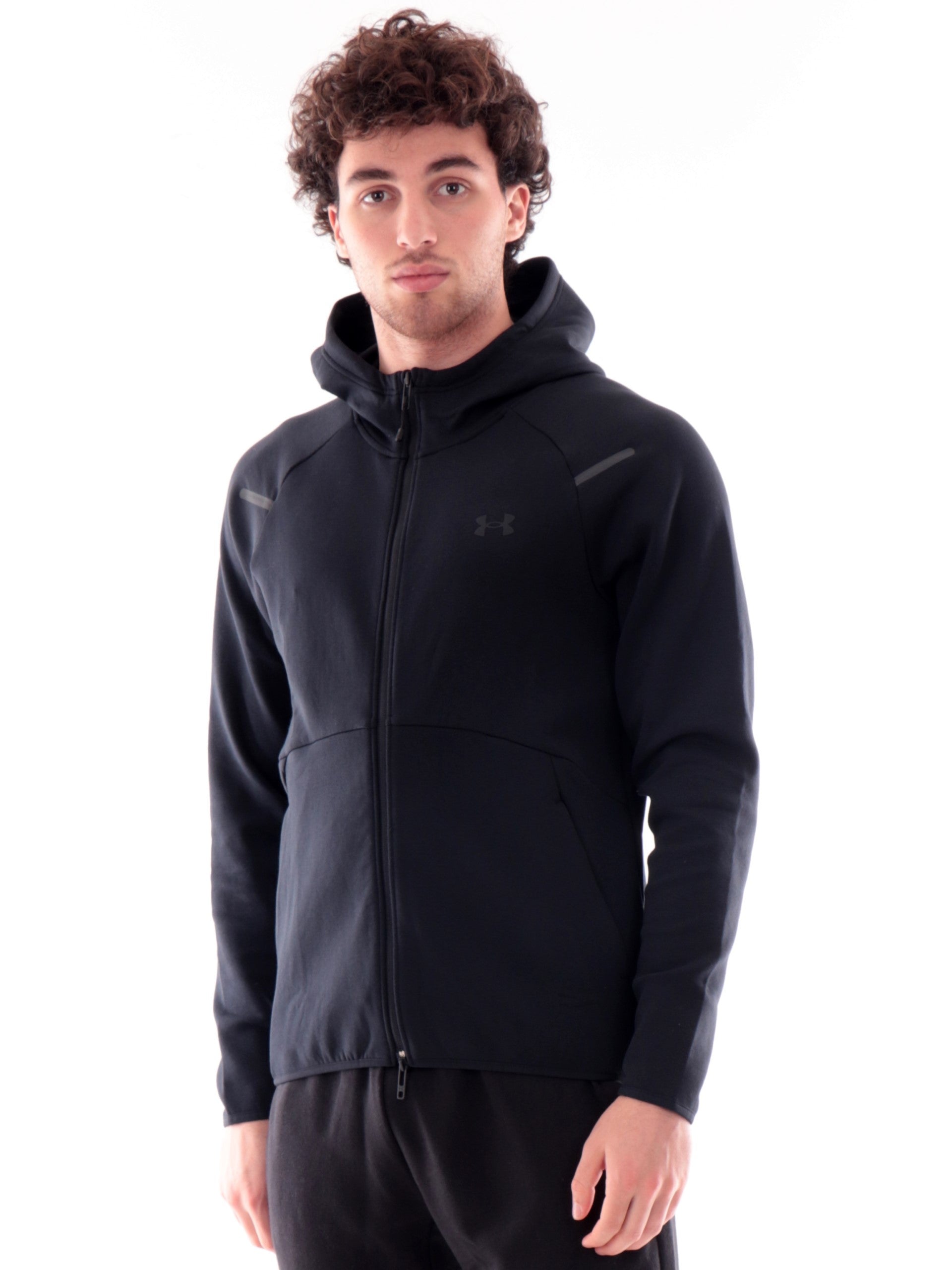 Felpa Under Armour nera da uomo Unstoppable Fleece, realizzata con inserti in tessuto tecnico. Questa felpa Under Armour nera ha il cappuccio fisso, lo scaldacollo, la chiusura full zip centrale, duetasche laterali con zip, polsini e fondo elasticizzati. Questa felpa è perfetta su un look sia sportivo e sia casual