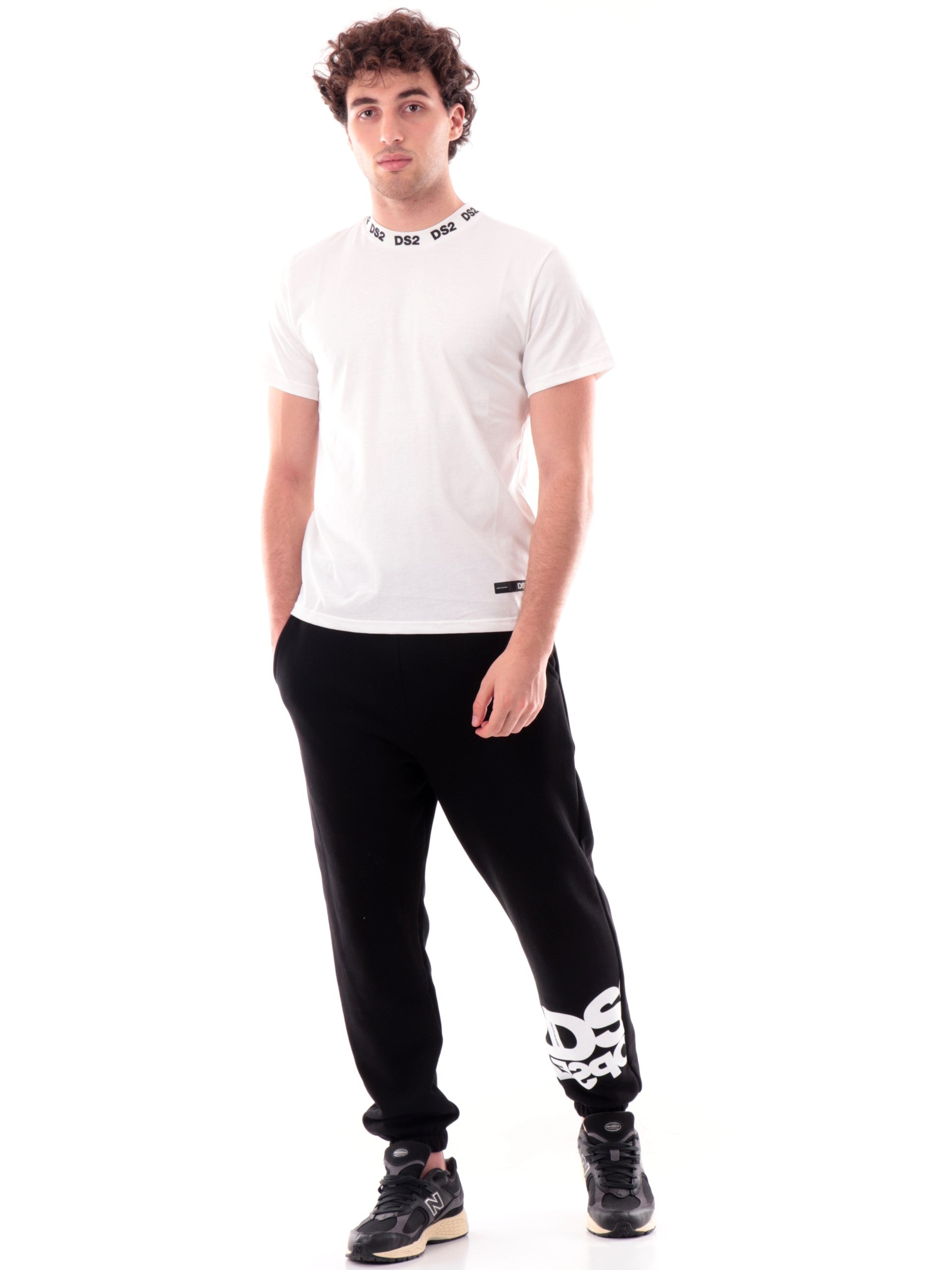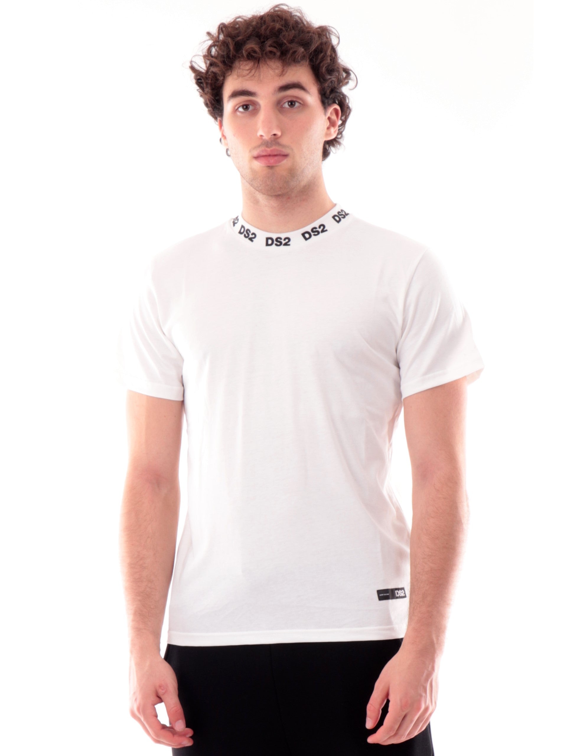 Maglia DS2 bianca da uomo colletto con logo DS2 FW25224, realizzata in 100% puro cotone. Questa t-shirt DS2 bianca girocollo ha le maniche corte e il logo DS2 stampato più volte sul colletto.