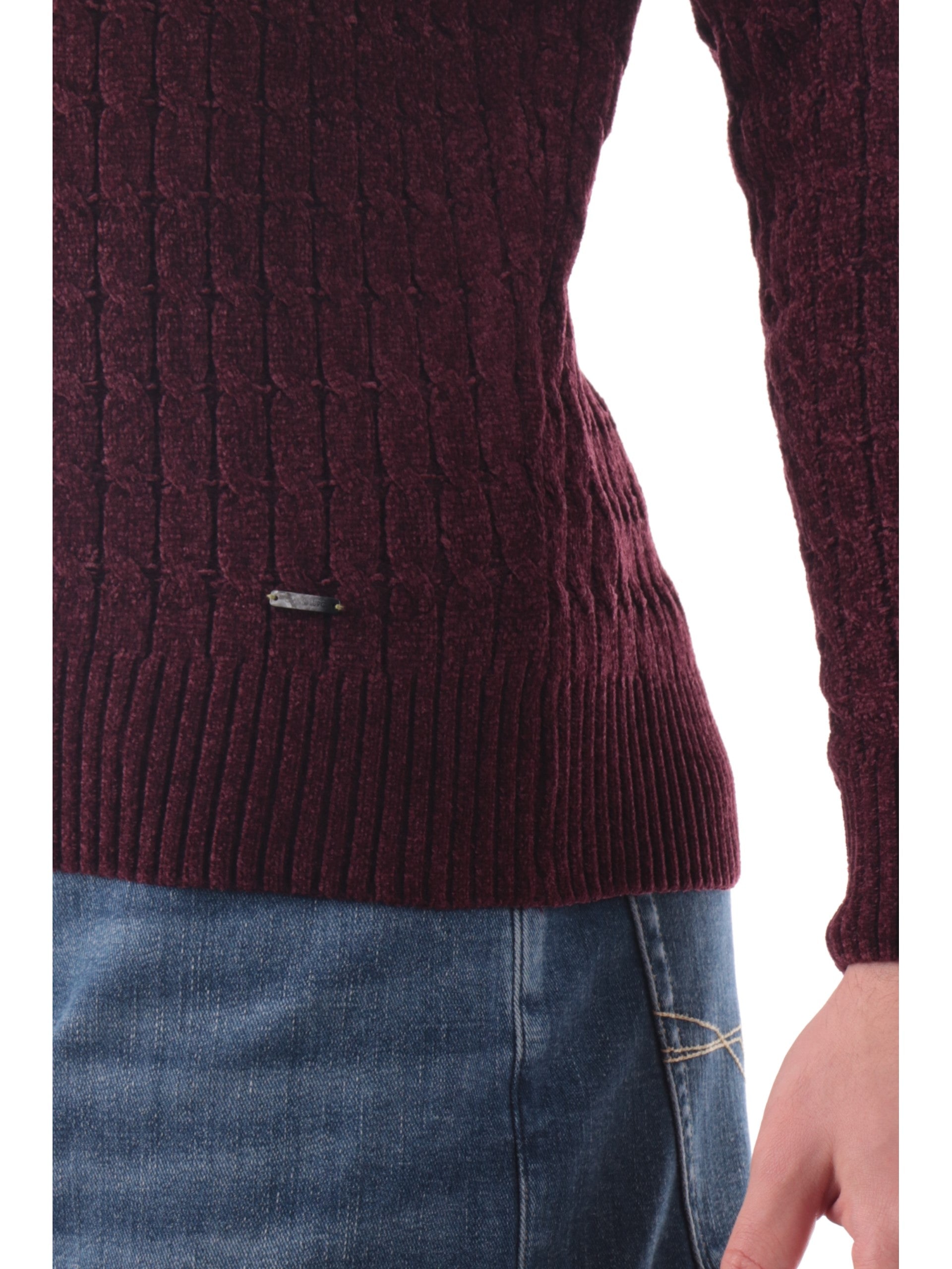 Maglione ciniglia Gianni Lupo bordeaux da uomo girocollo. Questo maglione girocollo Gianni Lupo bordeaux con la fantasia a treccia ha il logo del brand sul fondo a contrasto colore, polsini e fondo elasticizzati a costine.