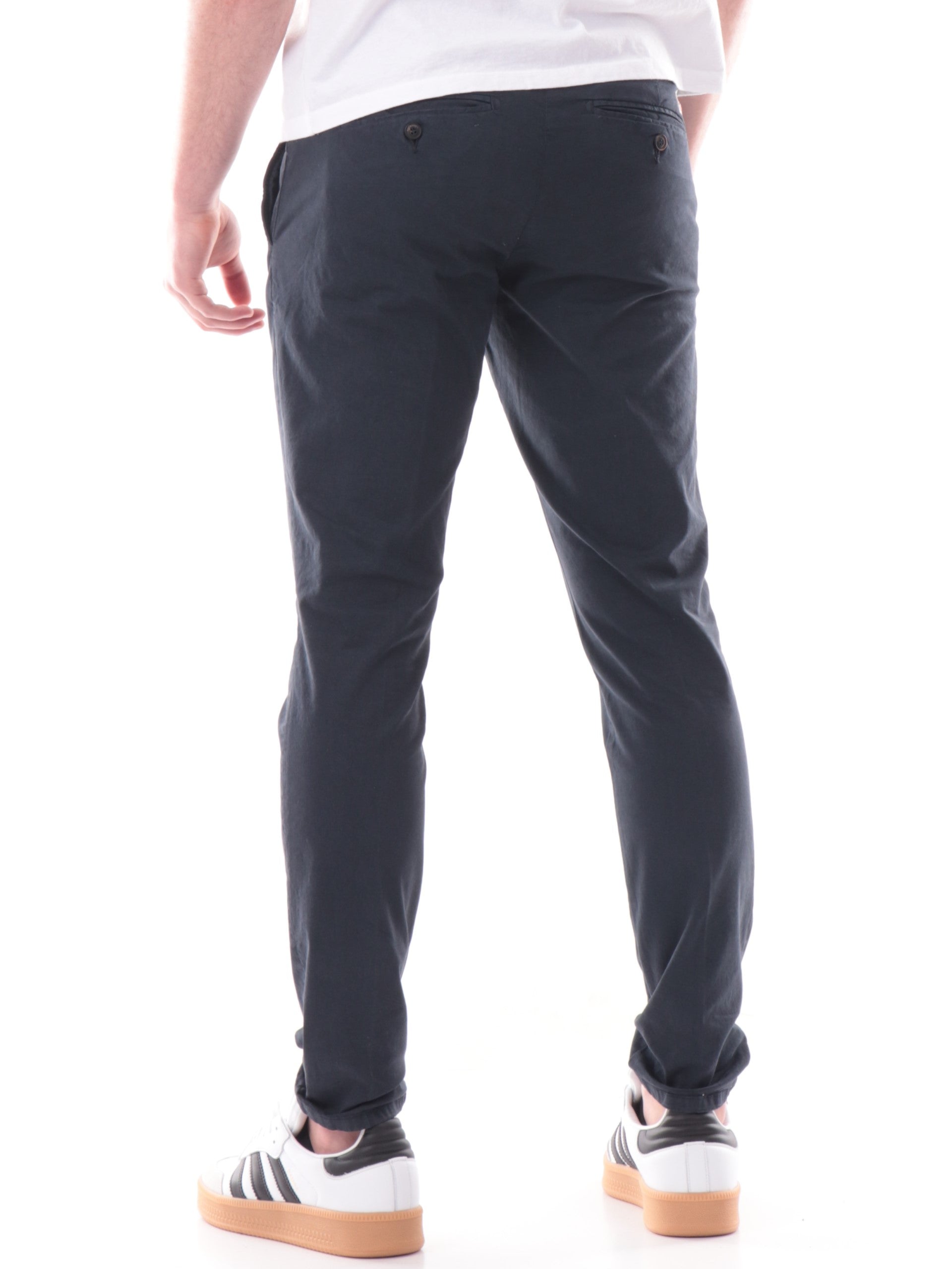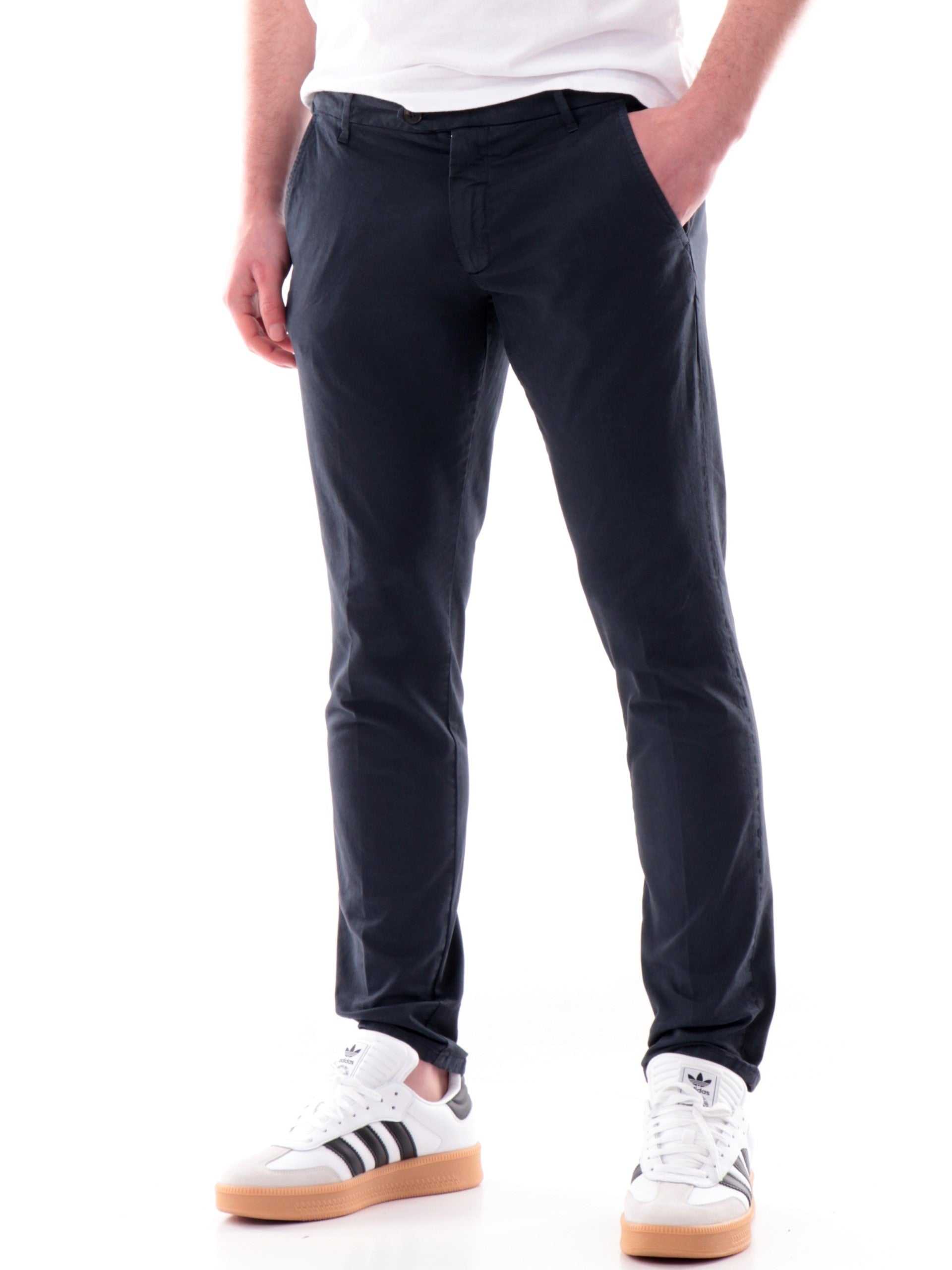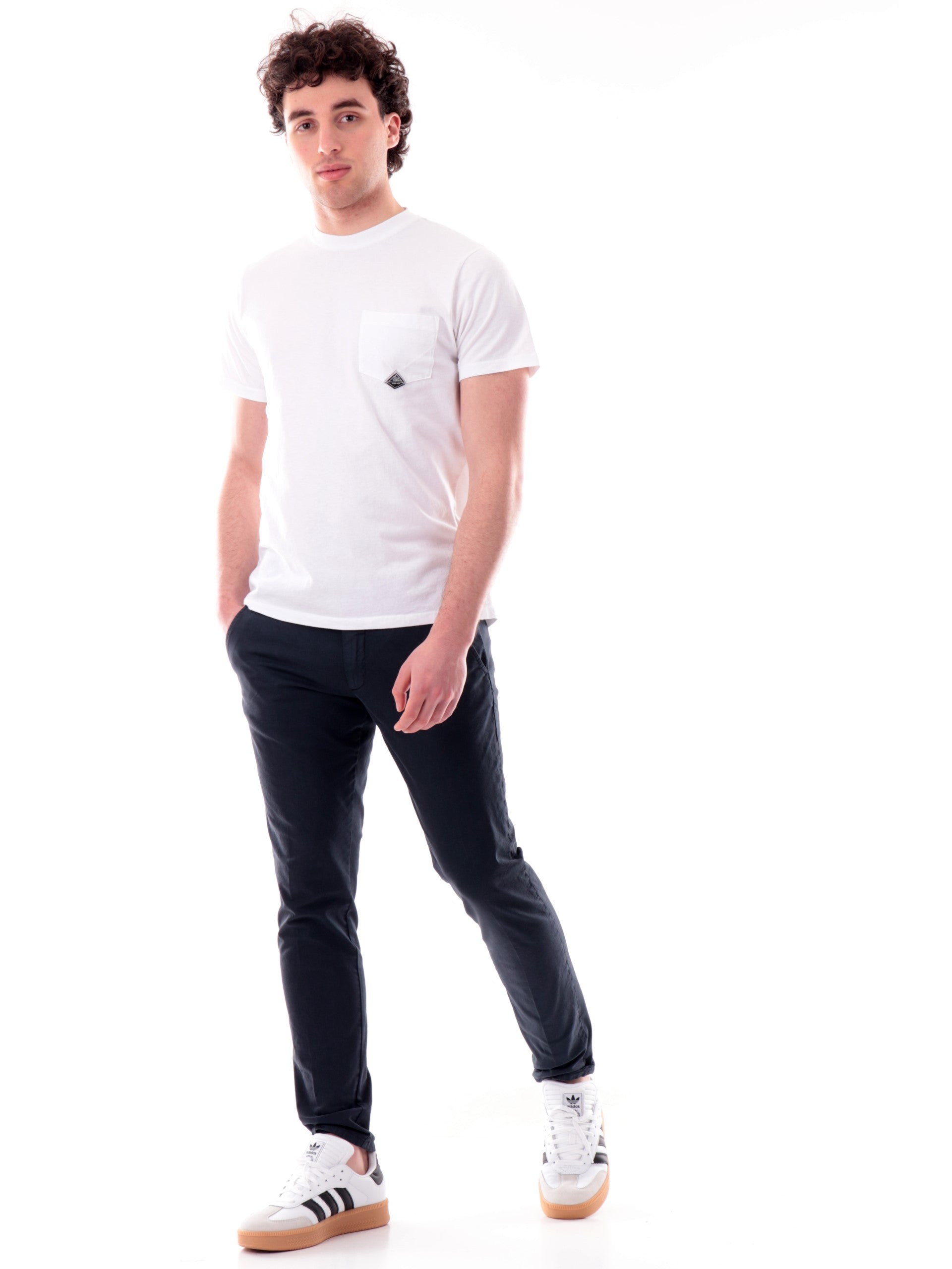 Pantaloni Roy Rogers blu New Rolf chino. Questi pantaloni uomo Roy Rogers blu sono caratterizzati da un morbido tessuto in cotone elasticizzato che dona a questi pantaloni Chino il massimo della comodità e comfort. Questi pantaloni sono caratterizzati da tasche oblique, modello chino e vestibilità slim fit.