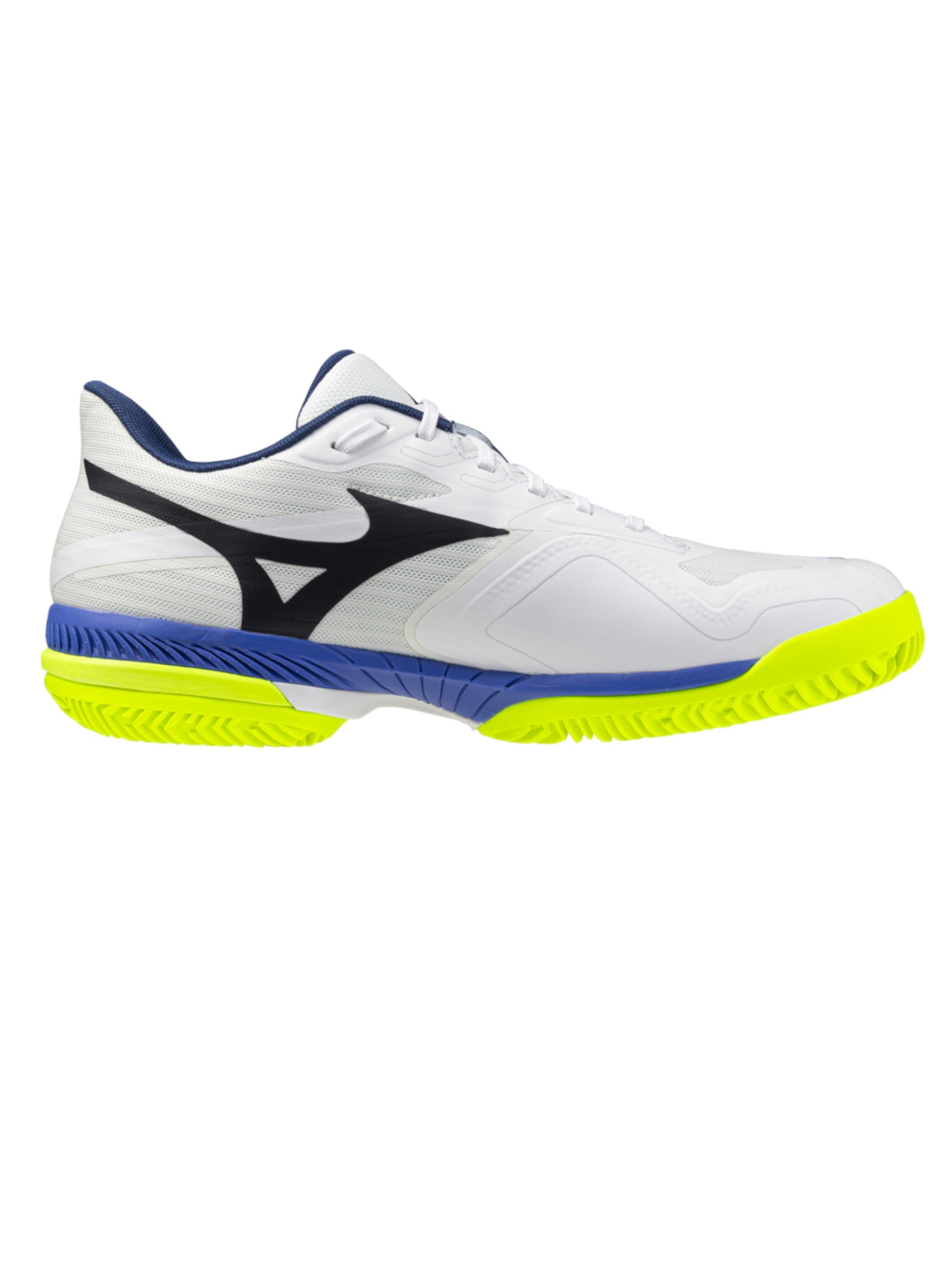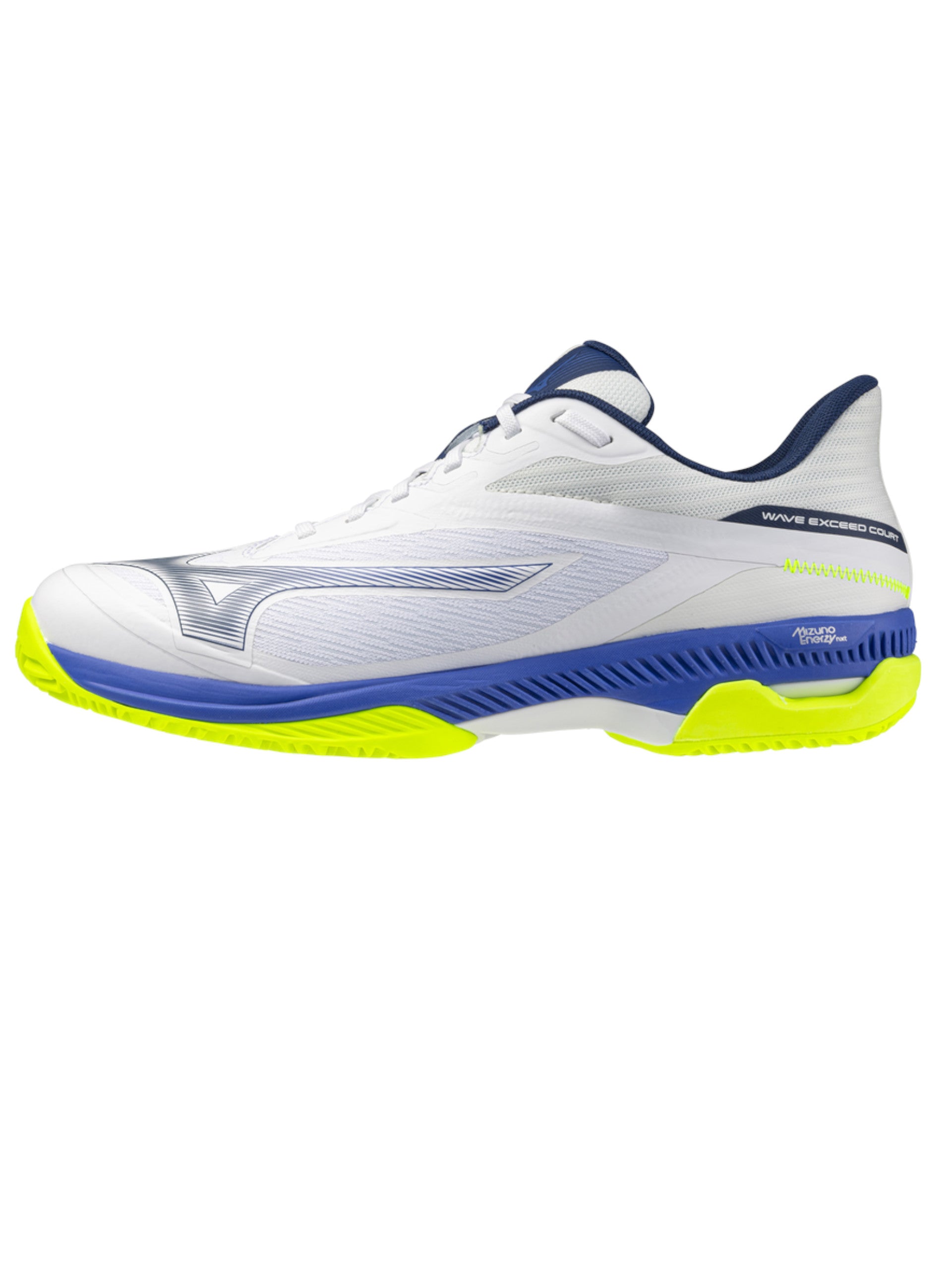 Scarpe Mizuno bianche-blu tennis da uomo Wave Exceed Court CC. Questa scarpa è stata realizzata per migliorare i cambi di direzione e i movimenti rapidi durante il gioco grazie all'integrazione di MIZUNO ENERZY nell'avampiede e di una soletta MIZUNO ENERZY. Adottando MIZUNO ENERZY nell'avampiede e la soletta MIZUNO ENERZY, questo modello fornisce il supporto necessario per "rapidi cambi di direzione e movimenti rapidi" Queste scarpe da running Mizuno bianche-blu hanno la chiusura con lacci, la tomaia realizzata in tessuto, la suola in gomma e il logo del brand ambo i lati a contrasto colore.