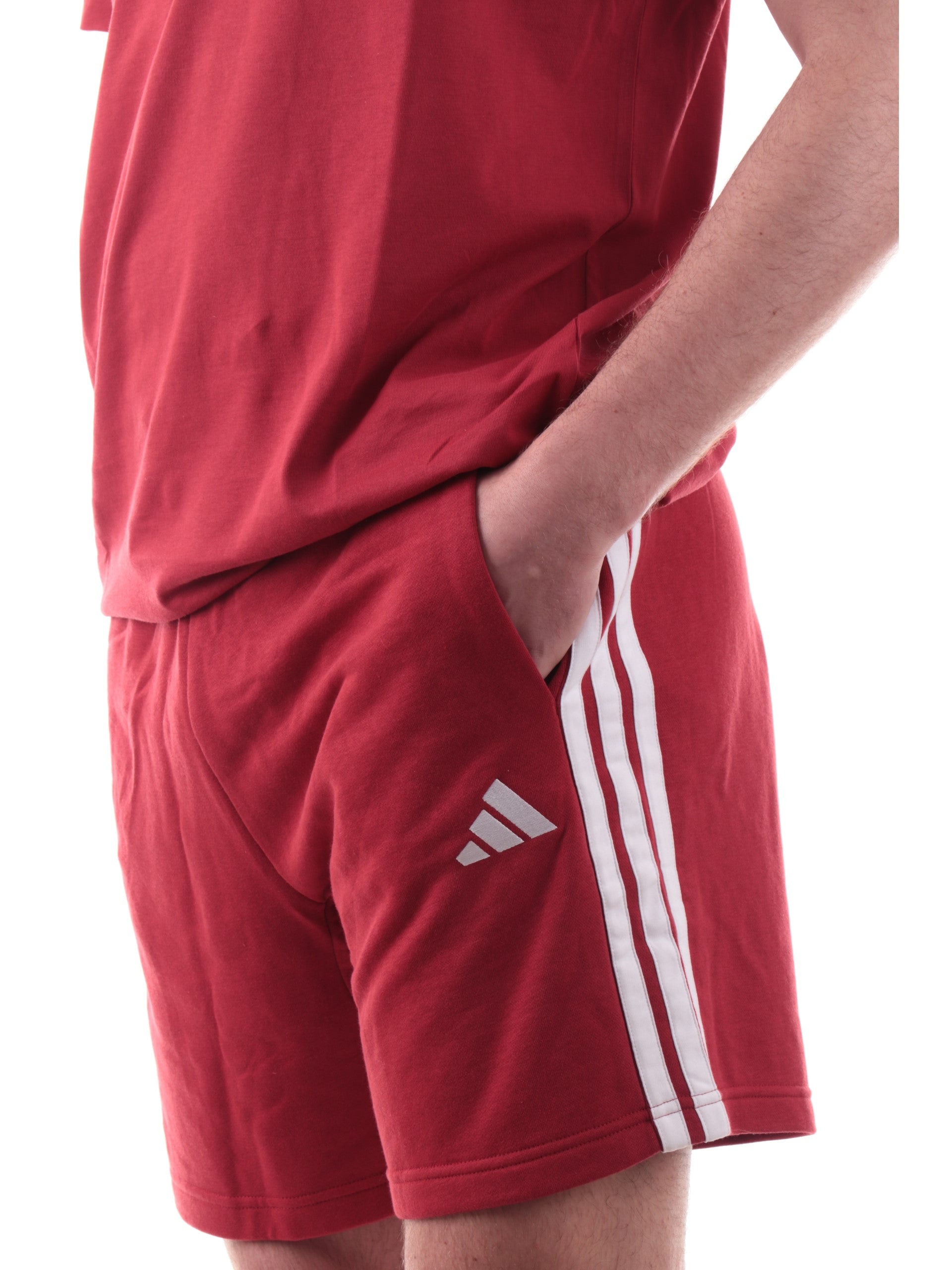 Shorts Adidas rossa 3Stripes da uomo logo Adidas ricamato, realizzati in cotone. Questi pantaloncini Adidas uomo hanno la banda elastica sul punto vita ragolabile con i lacci, due tasche laterali aperte, le 3Stripes ambo i lati e il logo Adidas ricamato.