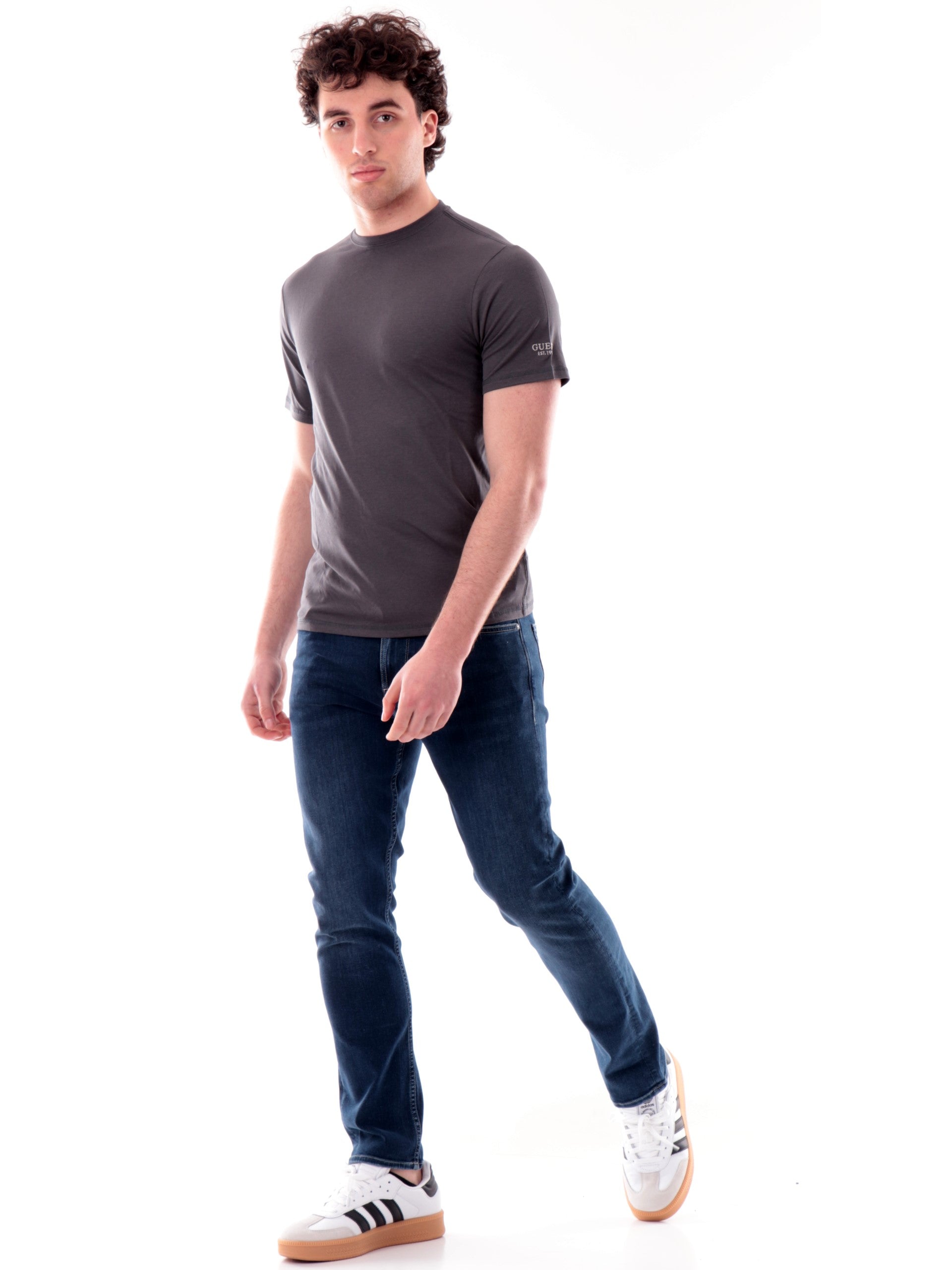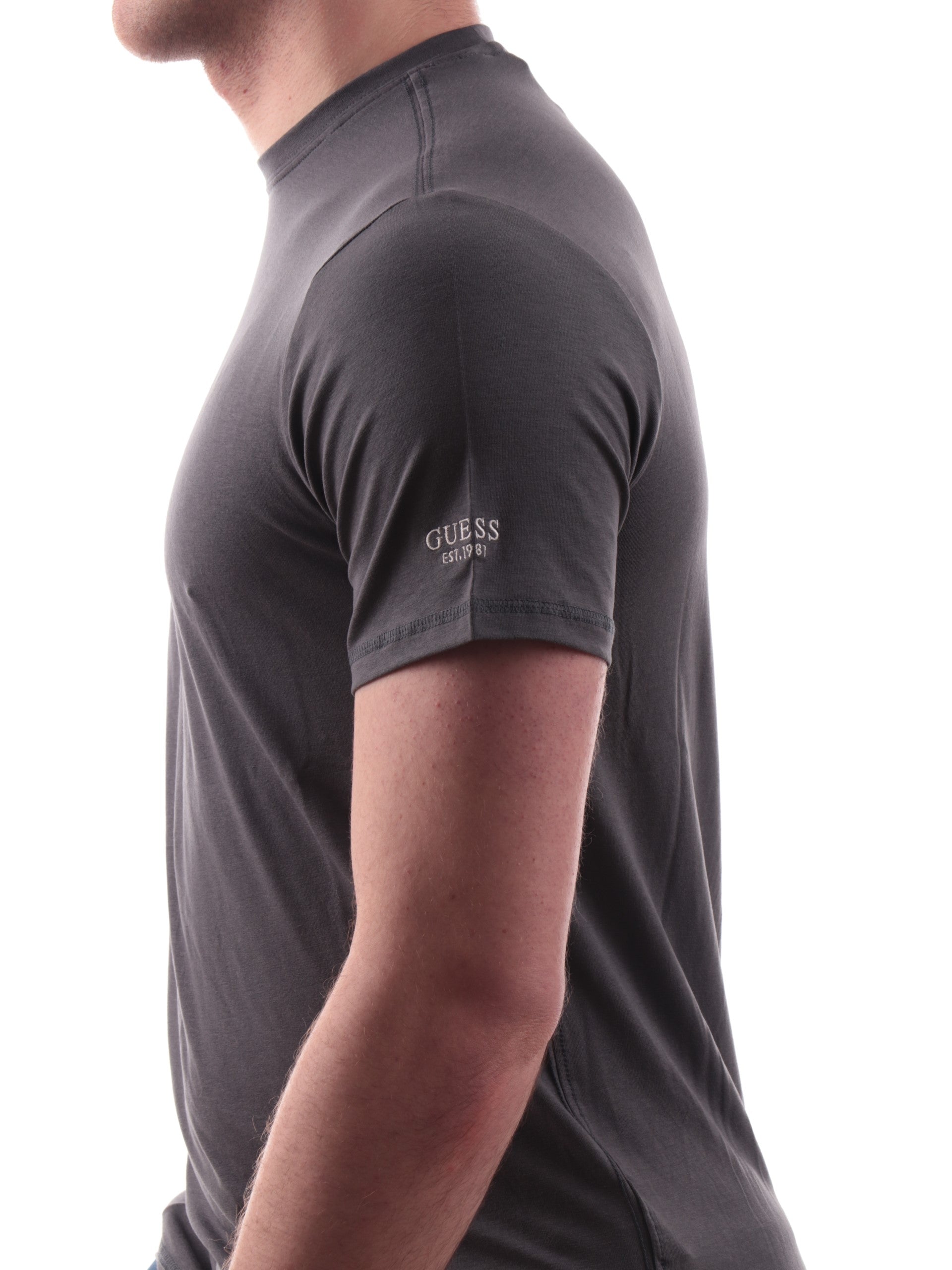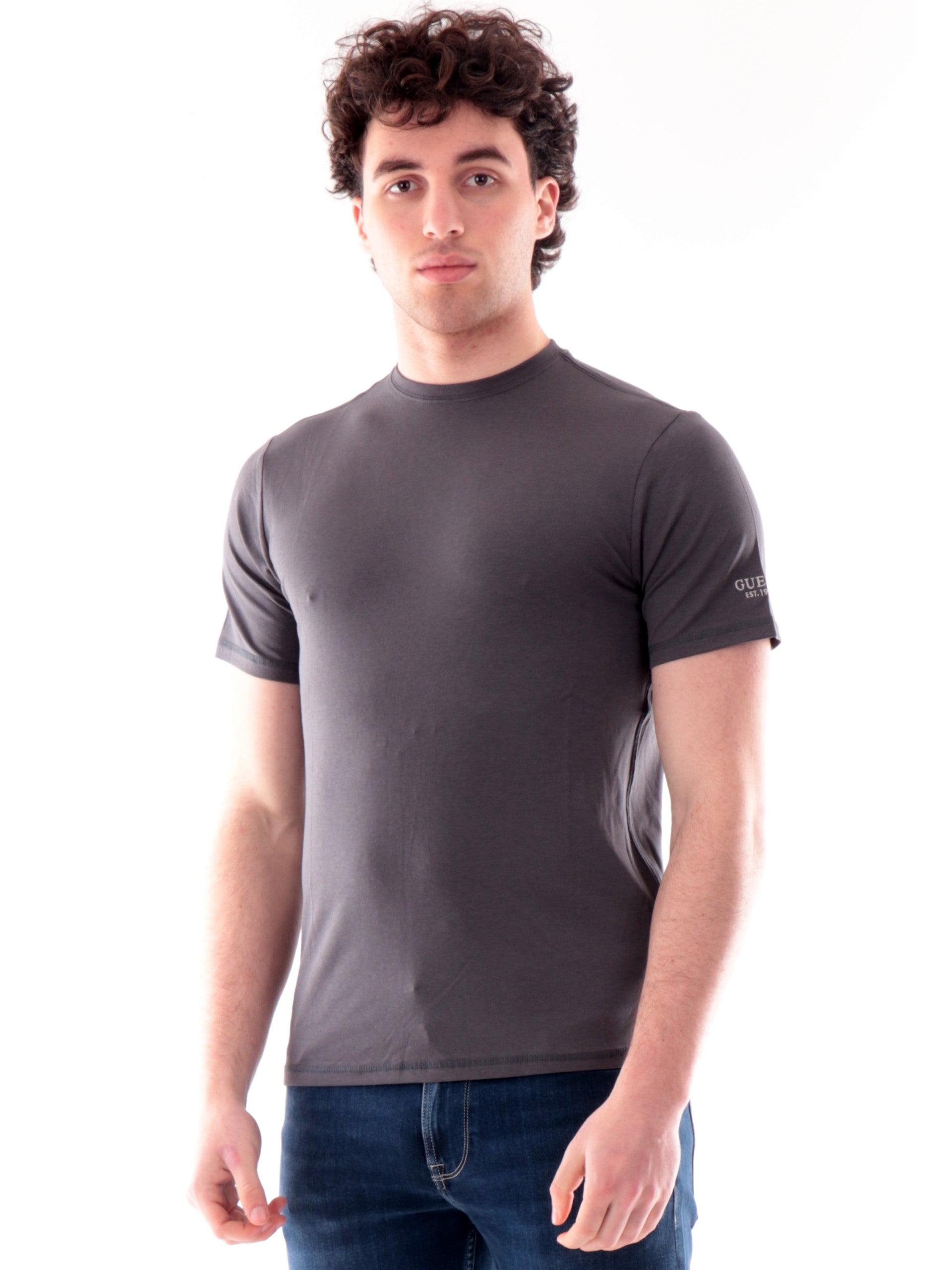 T-shirt Guess grigia da uomo Logo Script Tee, realizzata in cotone. Questa maglia Guess girocollo ha le maniche corte, la vestibilità regular e il logo ricamato sulla manica sinistra. Questa T-shirt Guess da uomo è perfetta per qualsiasi outfit, può essere abbinata sia su un look elegante, casual e sportivo.