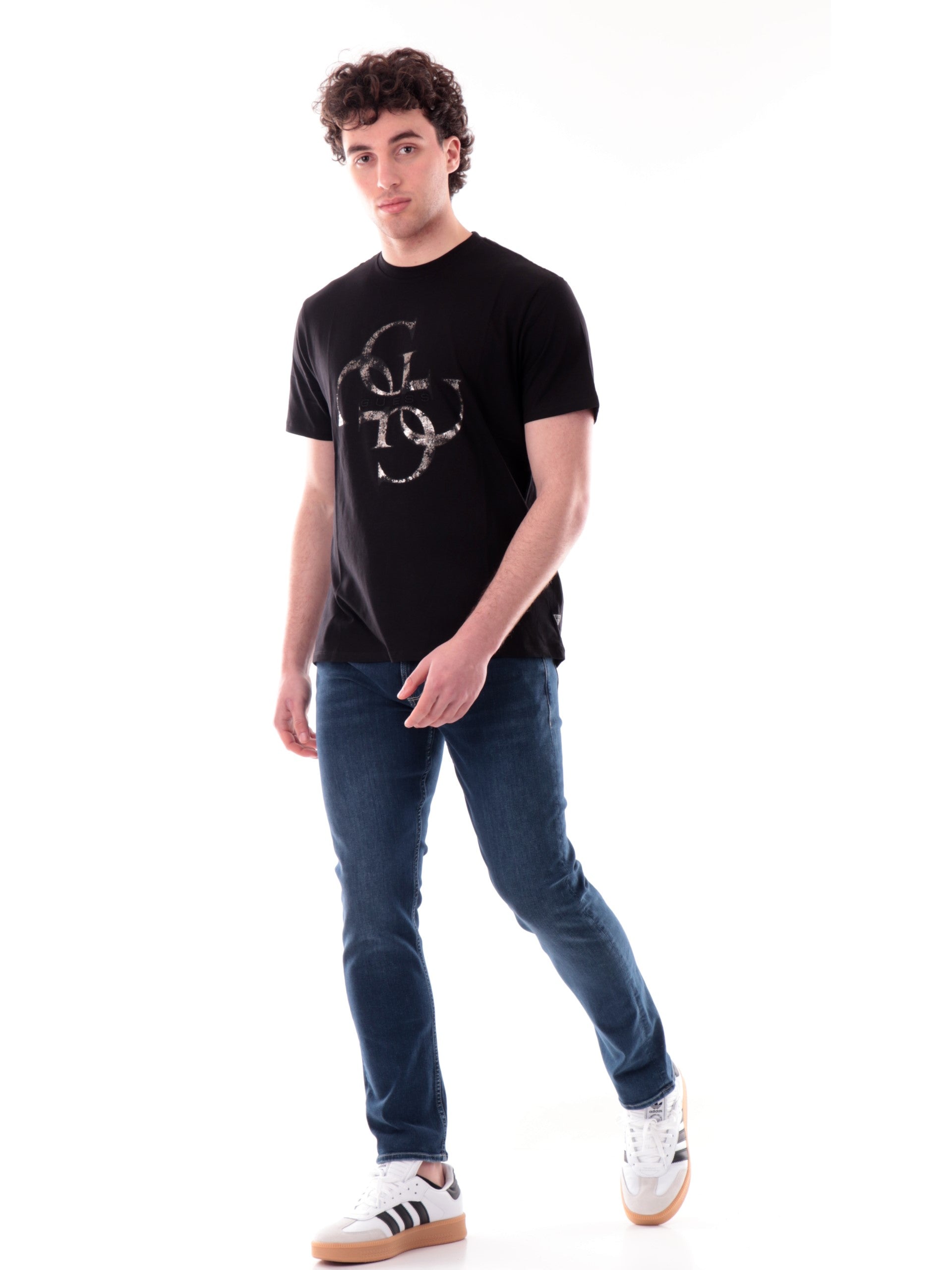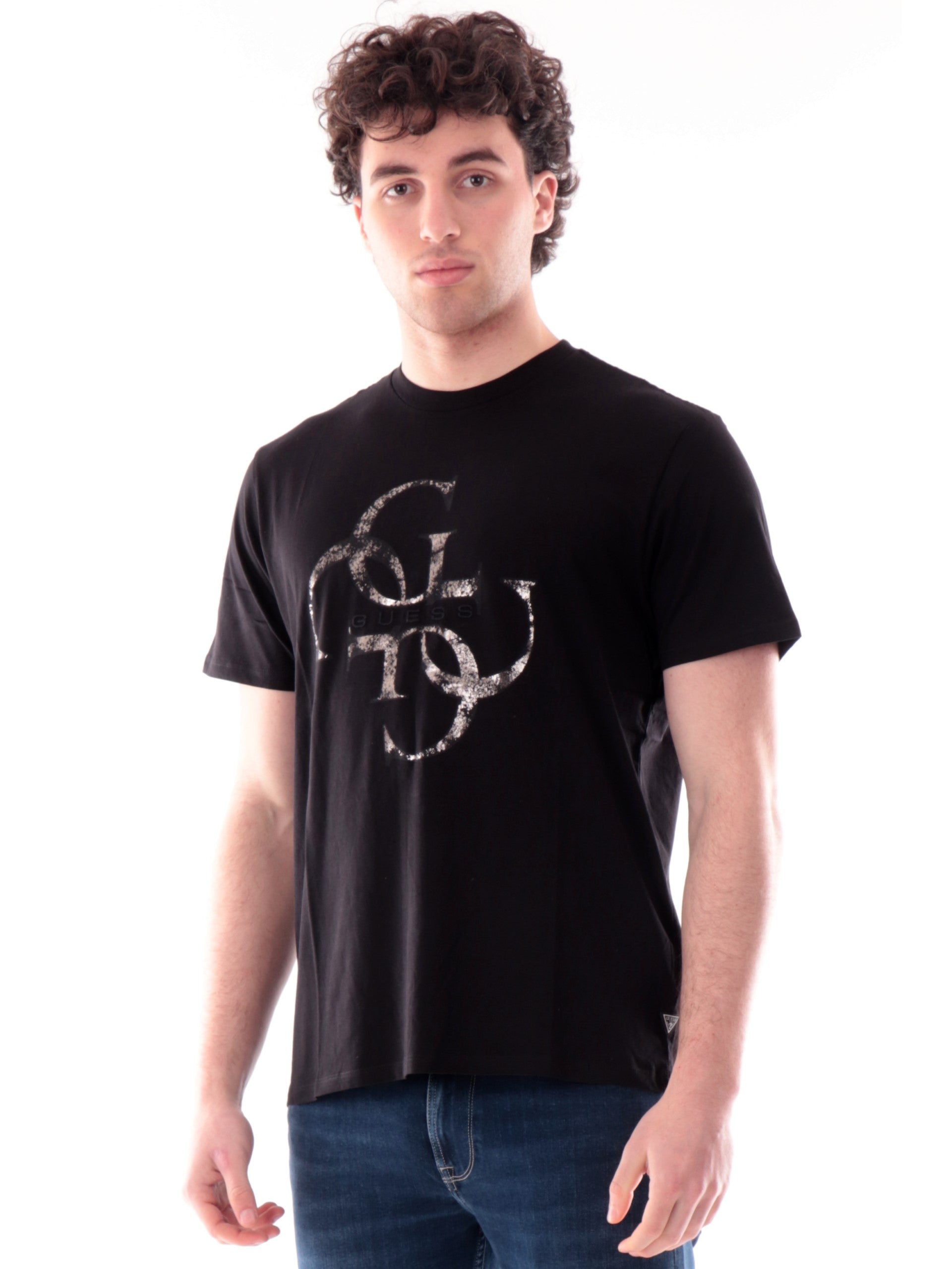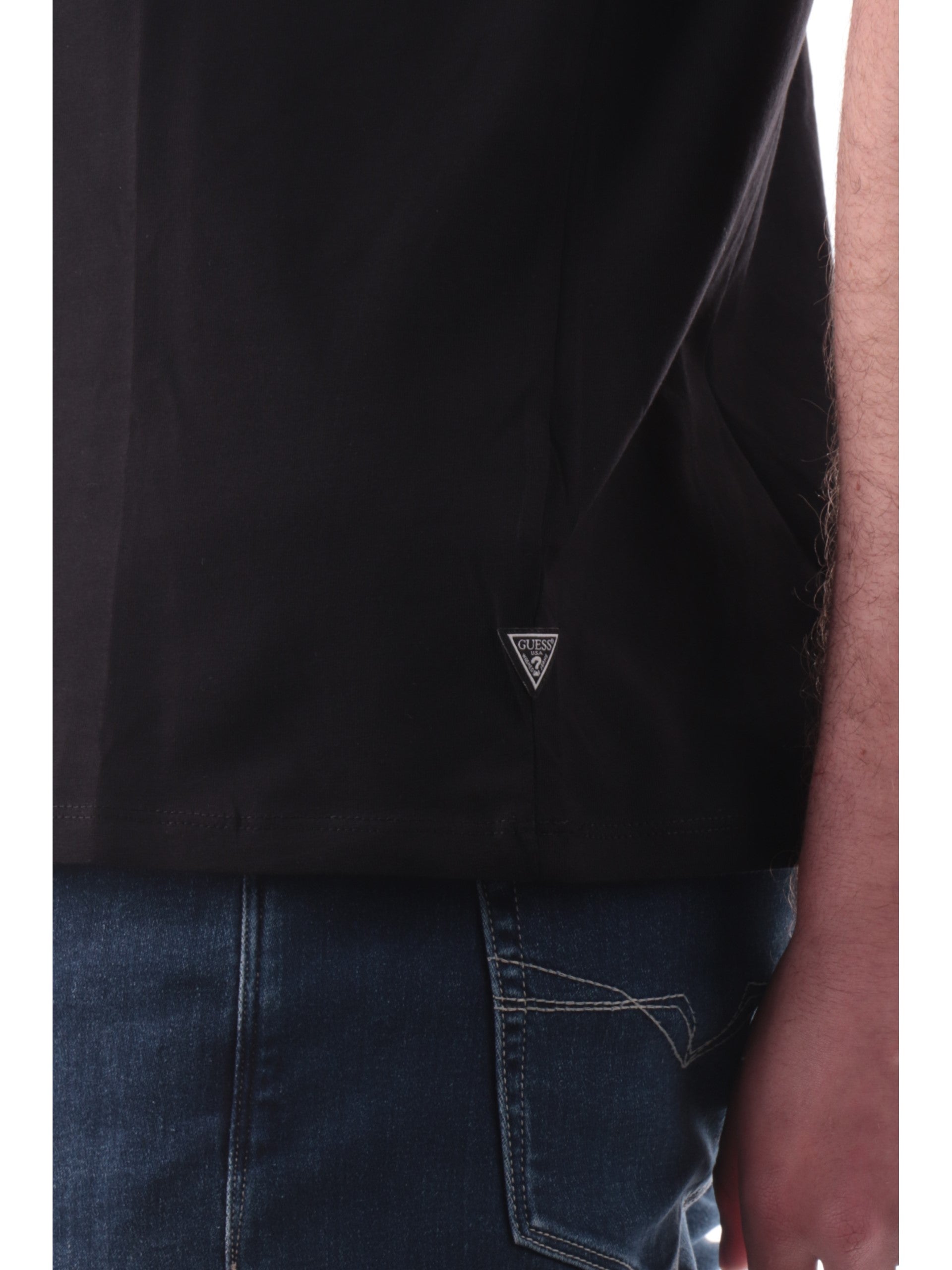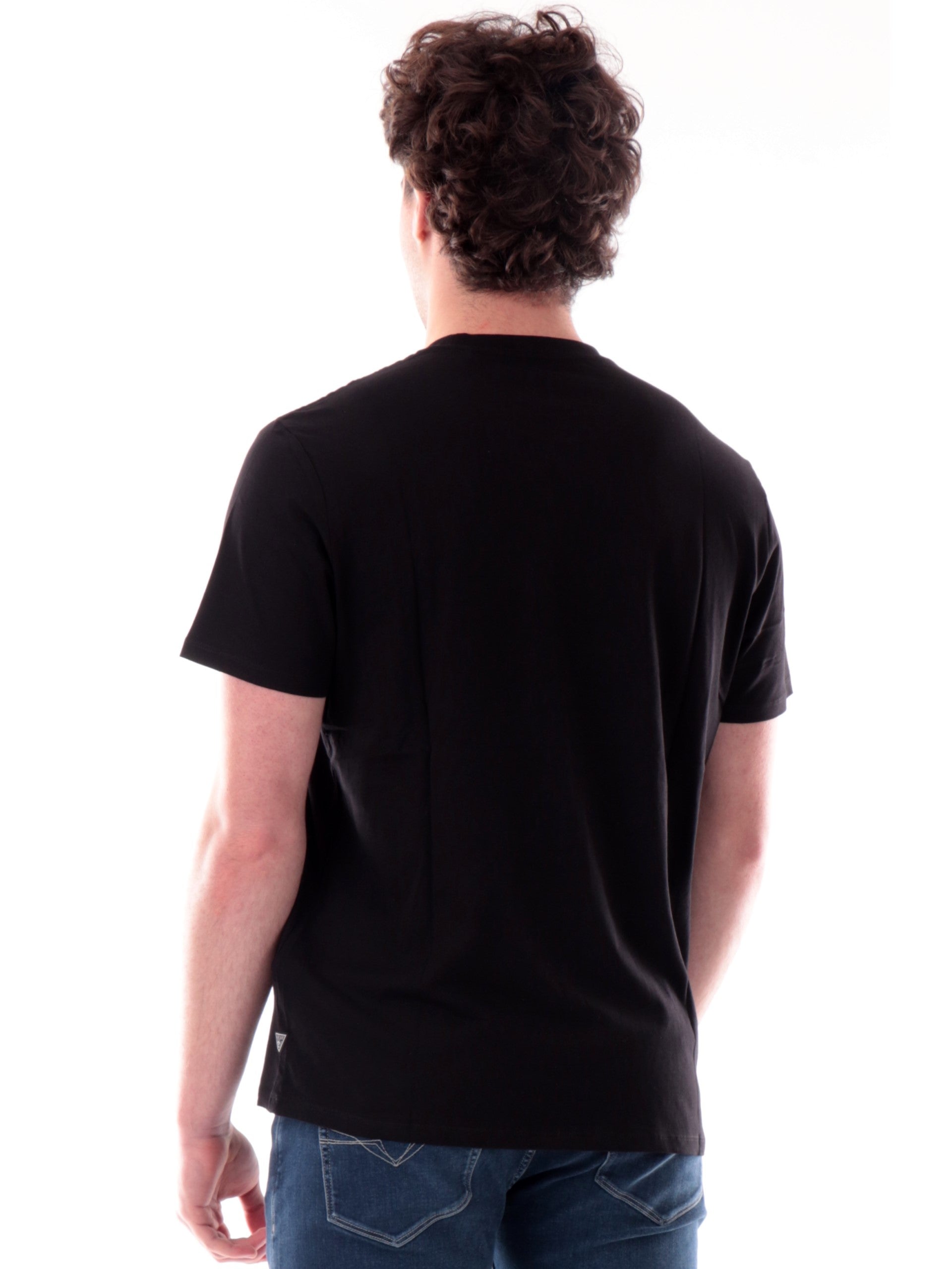 T-shirt Guess nera da uomo maxi stampa, realizzata 100% in puro cotone. Questa maglia Guess girocollo ha le maniche corte, la vestibilità regular e la maxi stampa del brand sul davanti a contrasto colore.