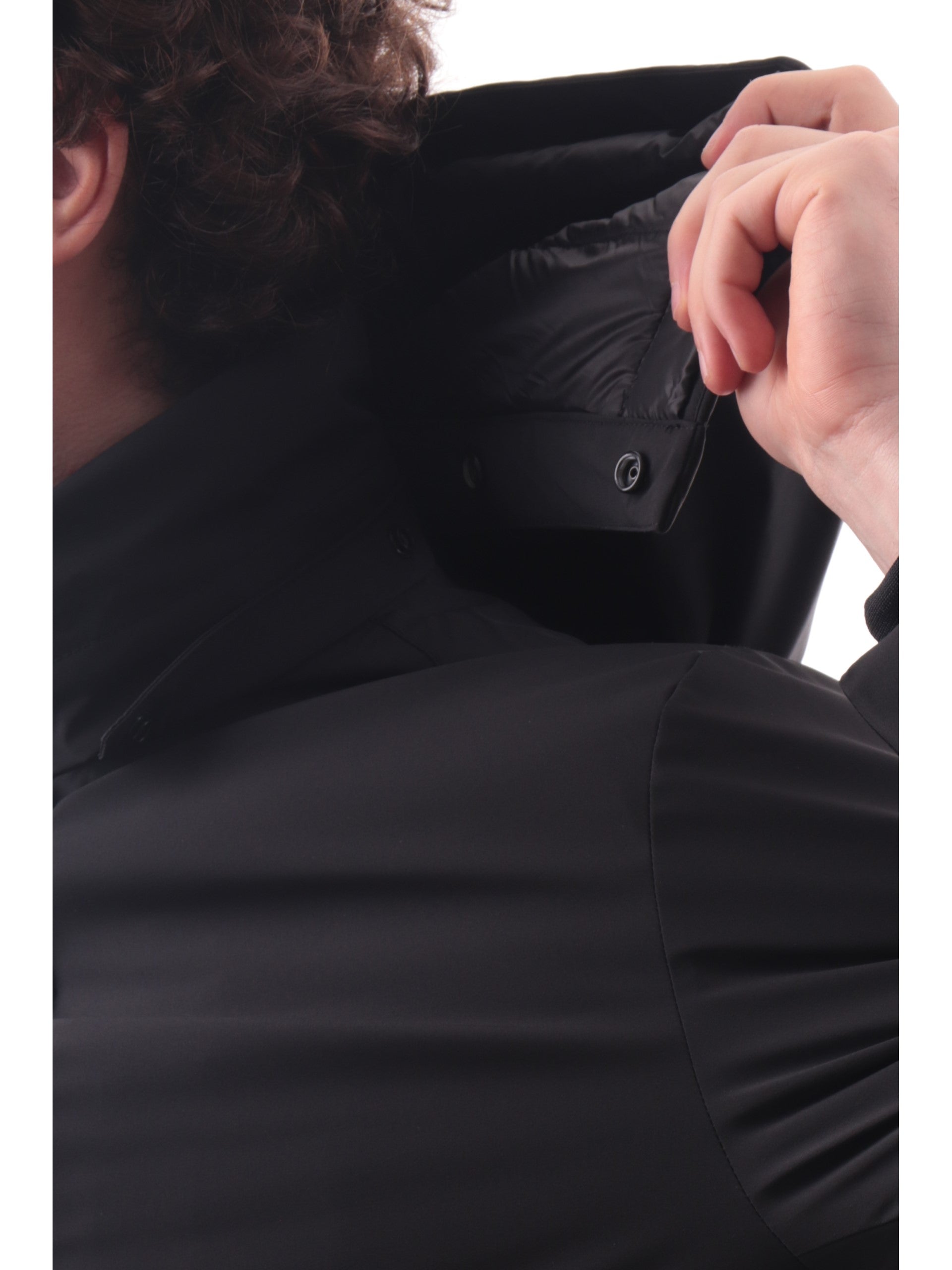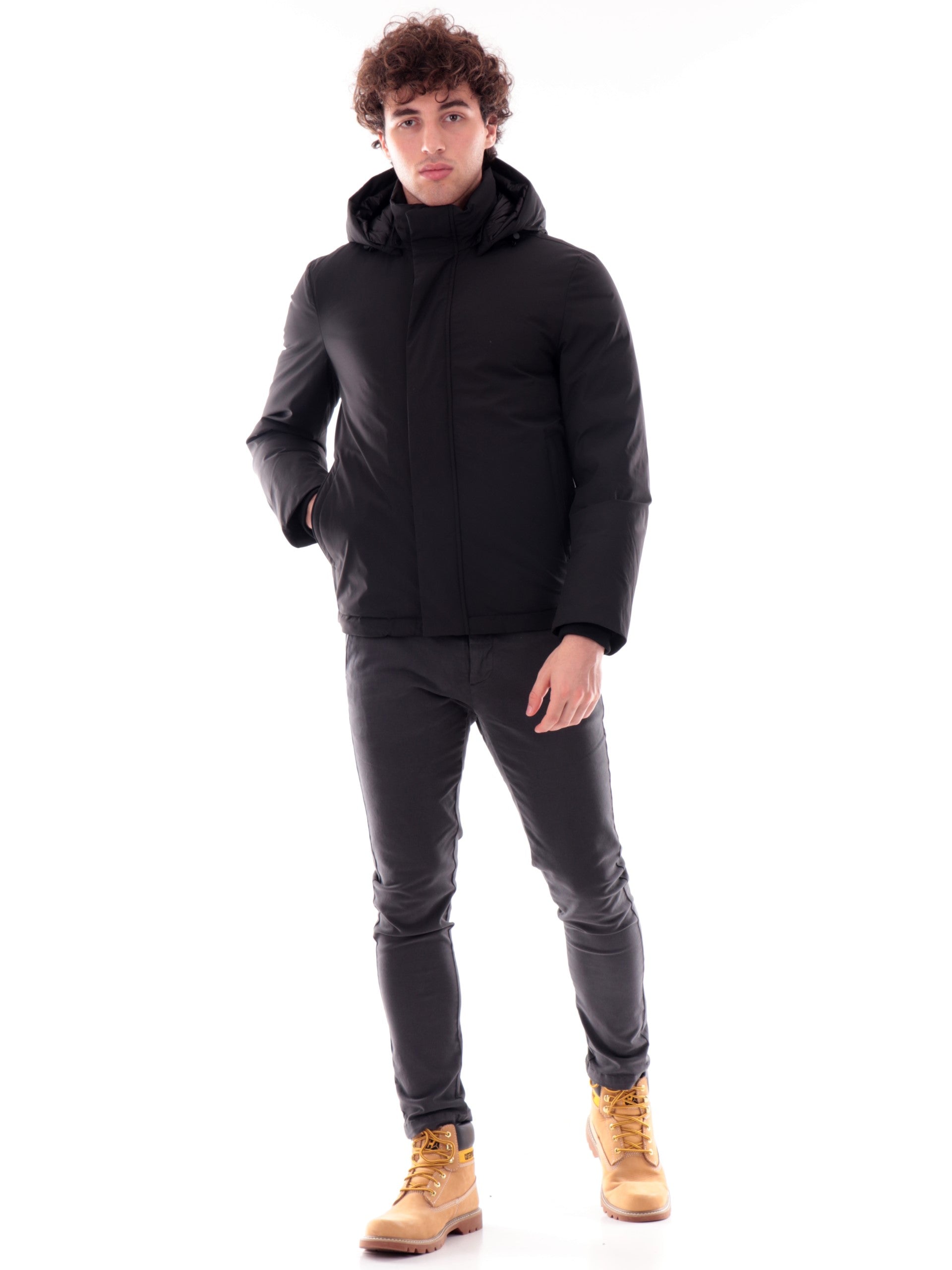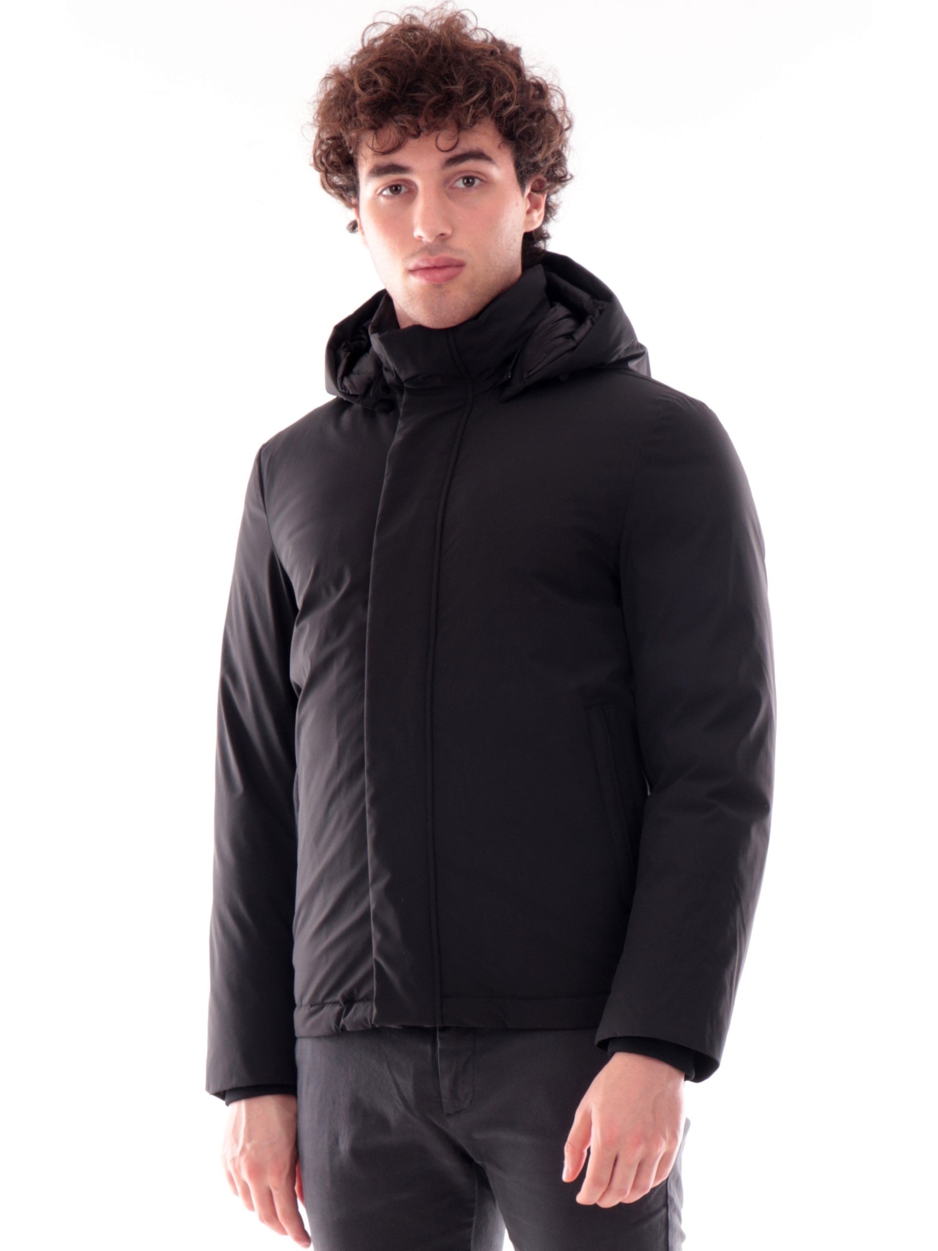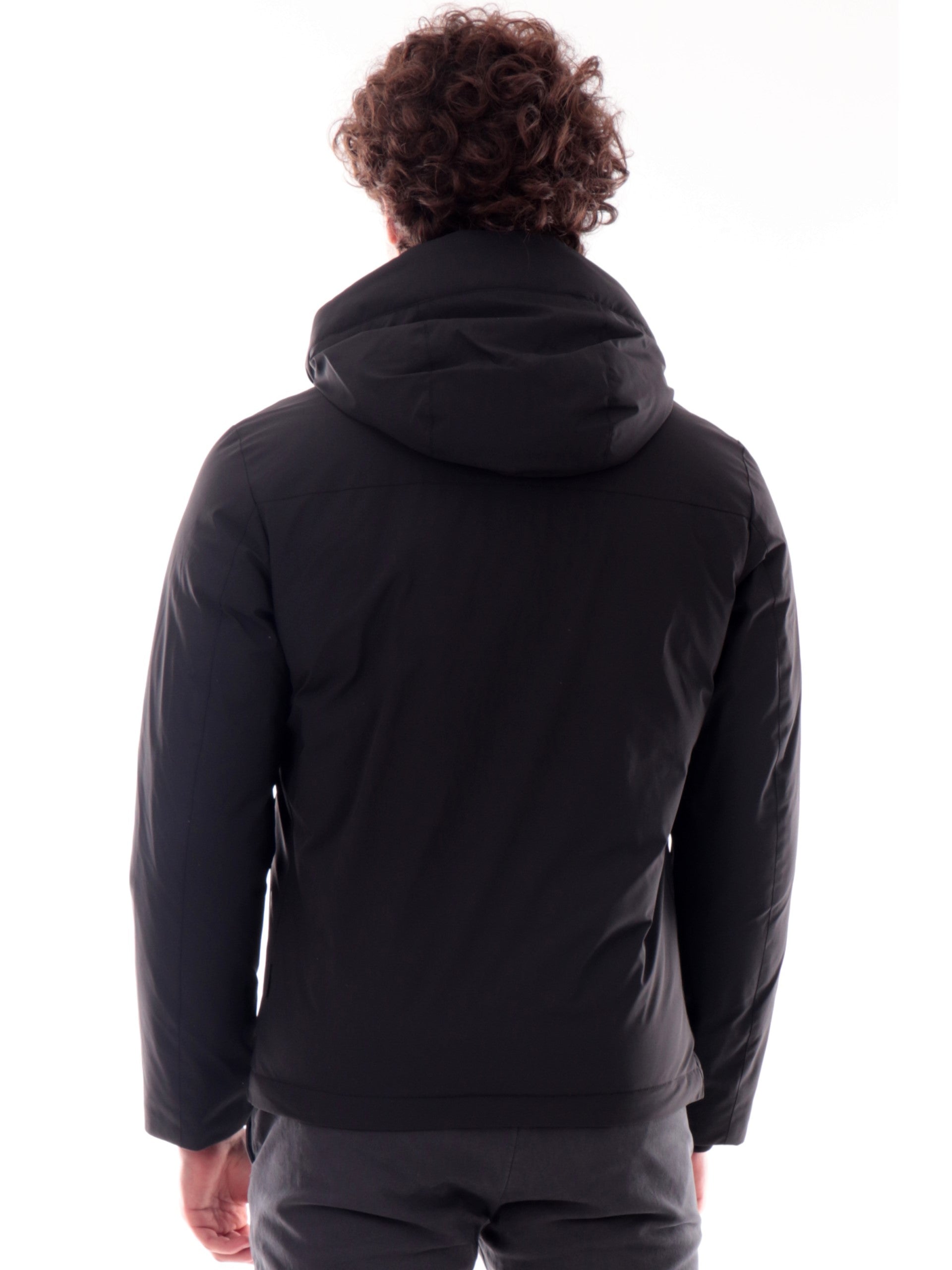 Cappotto nero Woolrich da uomo con cappuccio removibile. Questo cappotto Woolrich nero da uomo e realizzato in nylon elasticizzato, un tessuto impermeabile e antivento che assicura protezione ed è imbottito in piuma d’anatra perfetto per l'inverno. Questo cappotto Woolrich è caratterizzato dal cappuccio removibile e regolabile, chiusura con zip nascosta da una batta di bottoni, due tasche laterali con zip, all'interno troviamo tre tasche, coulisse interna sul fondo e polsini interni a costine, elementi che lo rendono un modello avvolgente e versatile