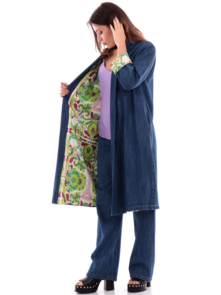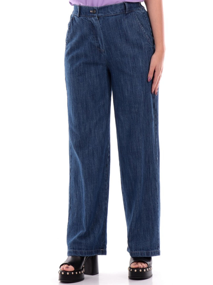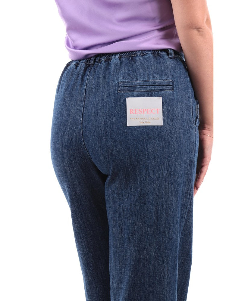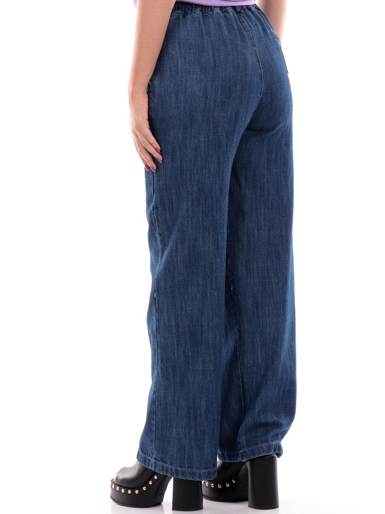 Wu'Side women's jeans 23790, made of 100% pure cotton. These blue Wu Side jeans trousers have an elastic band on the waist, a button and zip closure, two open side pockets with slanted cuts, a back welt pocket and a flared bottom.