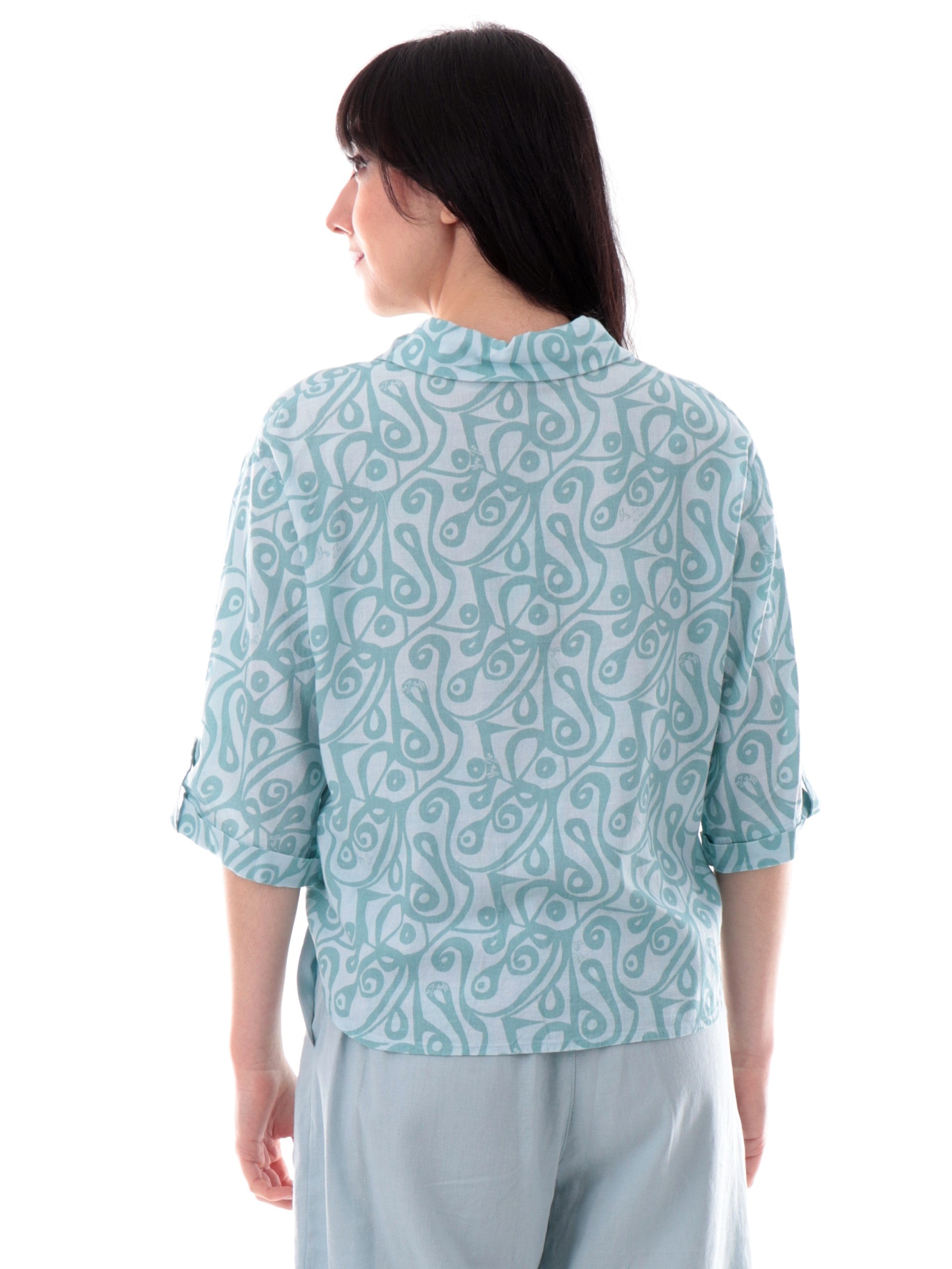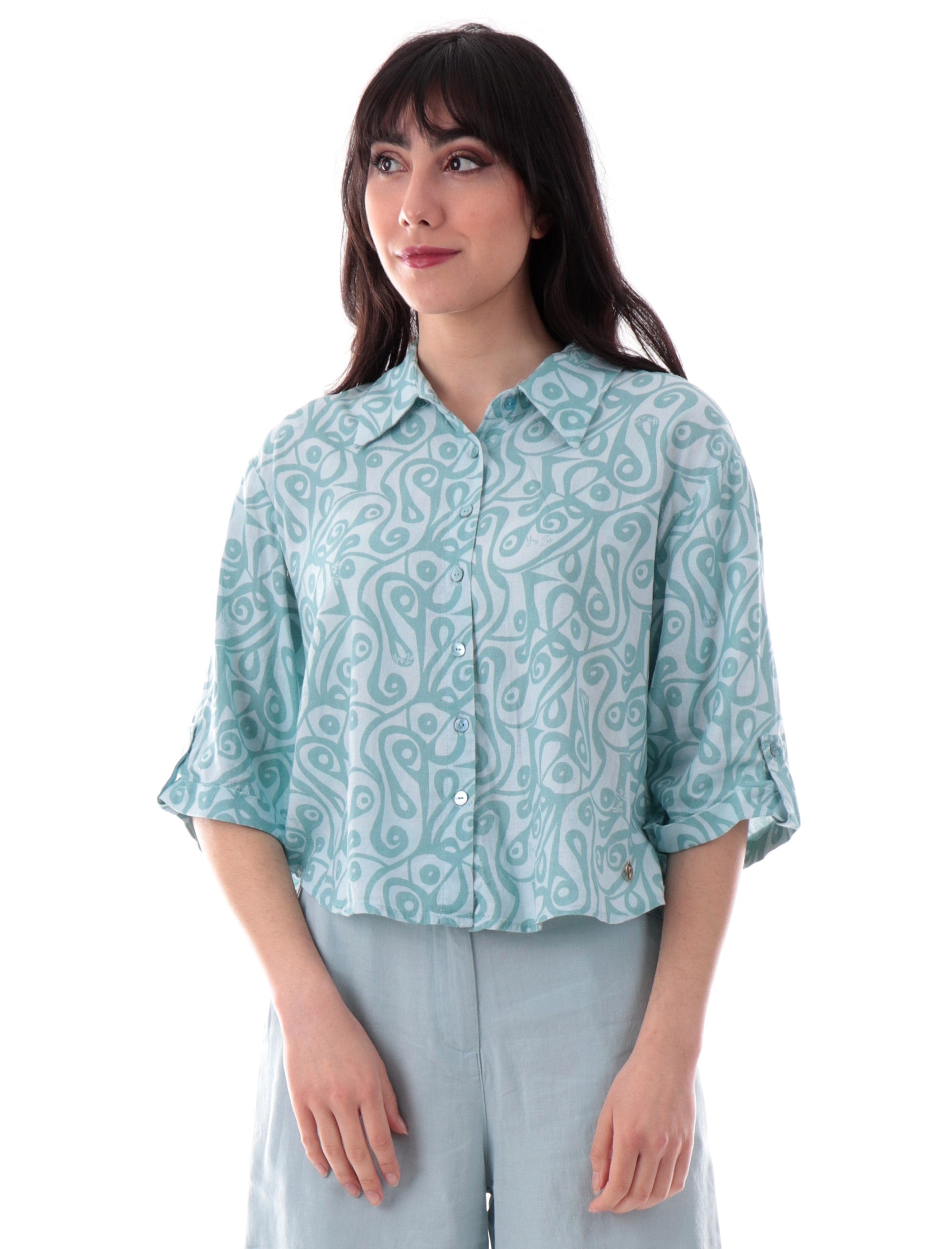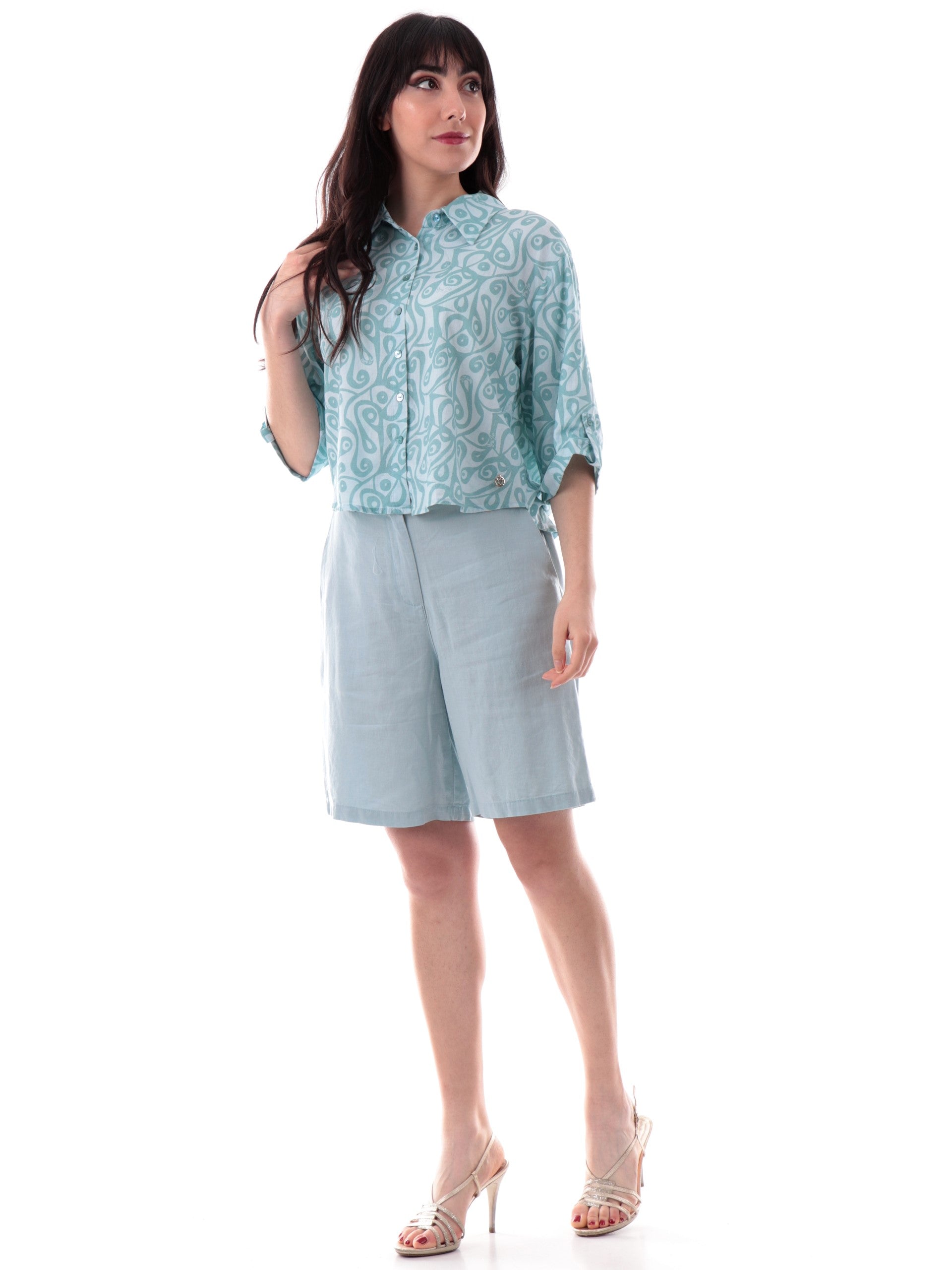 Camicia lino Yes Zee verde da donna fantasia foulard C400V900. Questa camicia donna Yes Zee verde ha il colletto alla francese, la chiusura con bottoni, le maniche a tre quarti e la fantasia foulard.