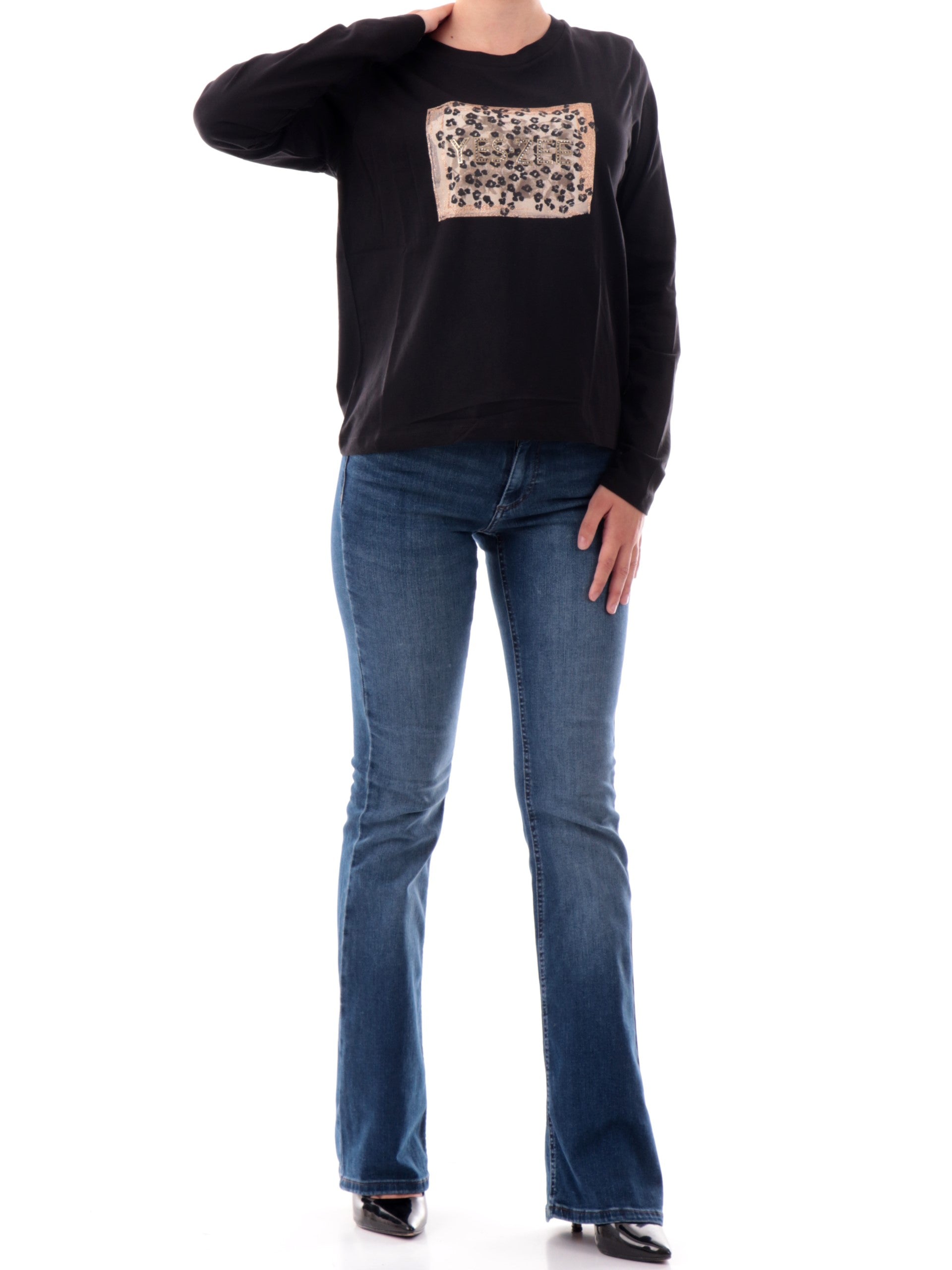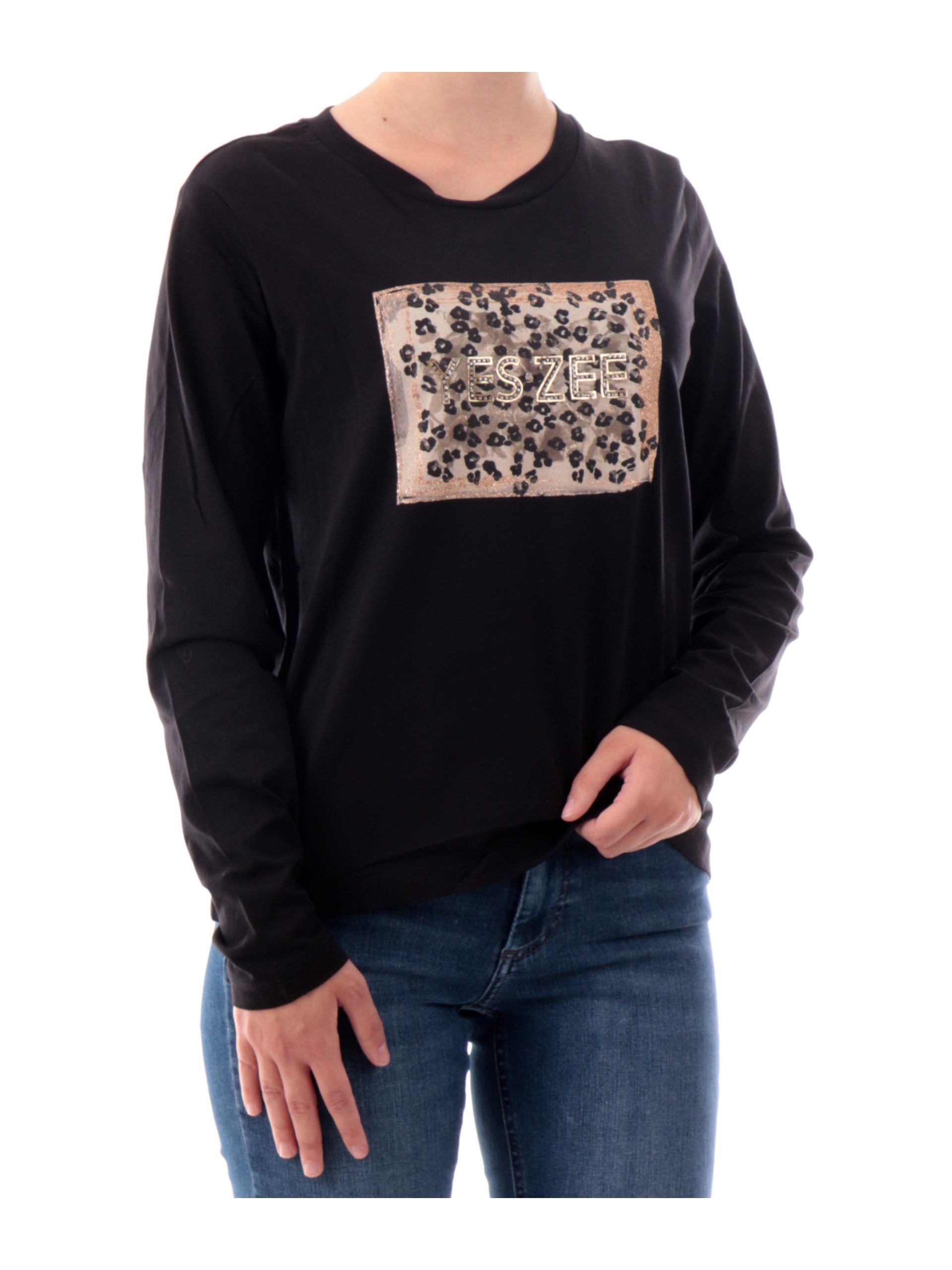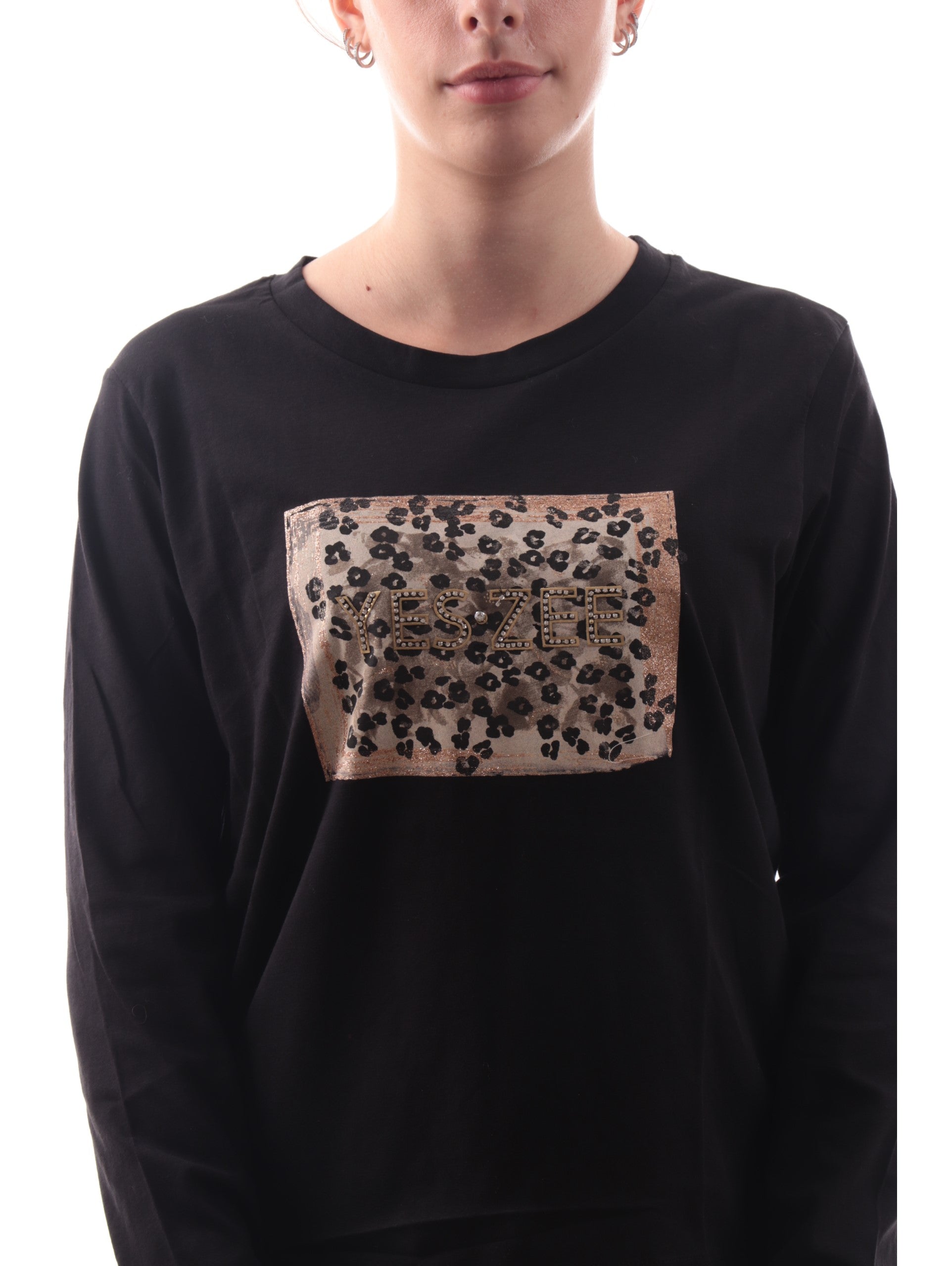Maglia Yes Zee nera a maniche lunghe con box logo animalier e scritta yes zee strass sul davanti. Questa Maglia Yes Zee maniche lunghe da donna è realizzata in cotone elasticizzato essenziale e dinamico perfetto in ogni stagione.