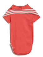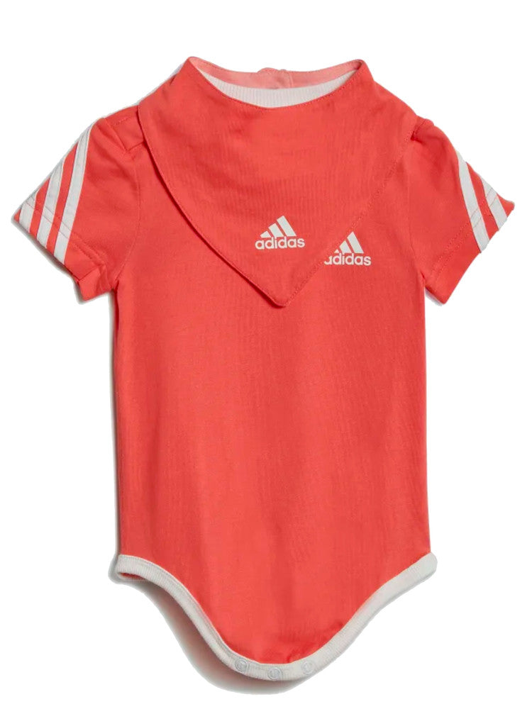 Pink Adidas bodysuit for newborns HF1975. This pink crew-neck Adidas bodysuit has two snap buttons on the left shoulder which make it easy to wear, the 3Stripes behind the back, the logo printed on the front left side, the closure with three snap buttons on the bottom and the 100% cotton composition. This Adidas bodysuit for newborns is sold together with a matching logo bandana with two snap button closure.