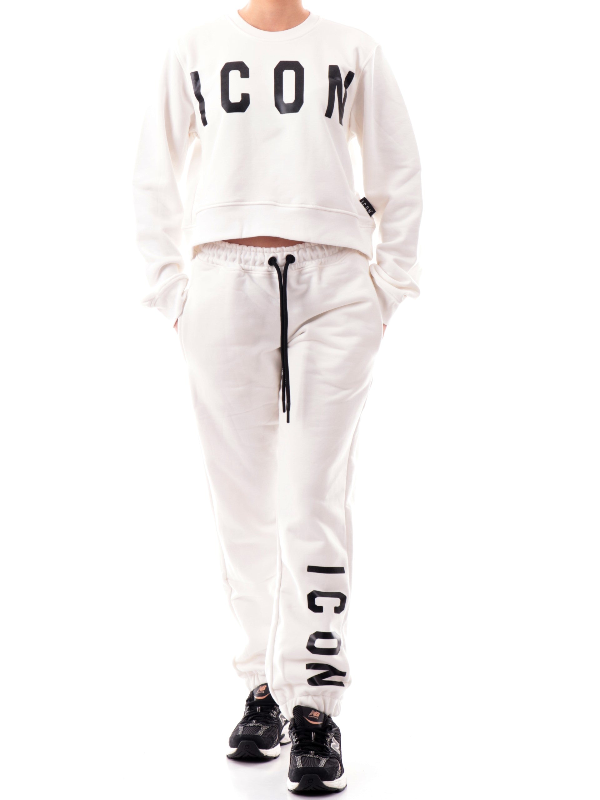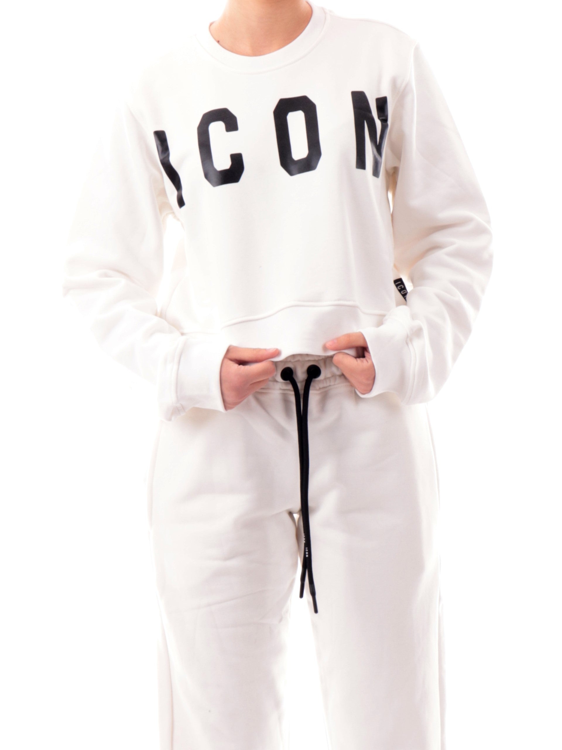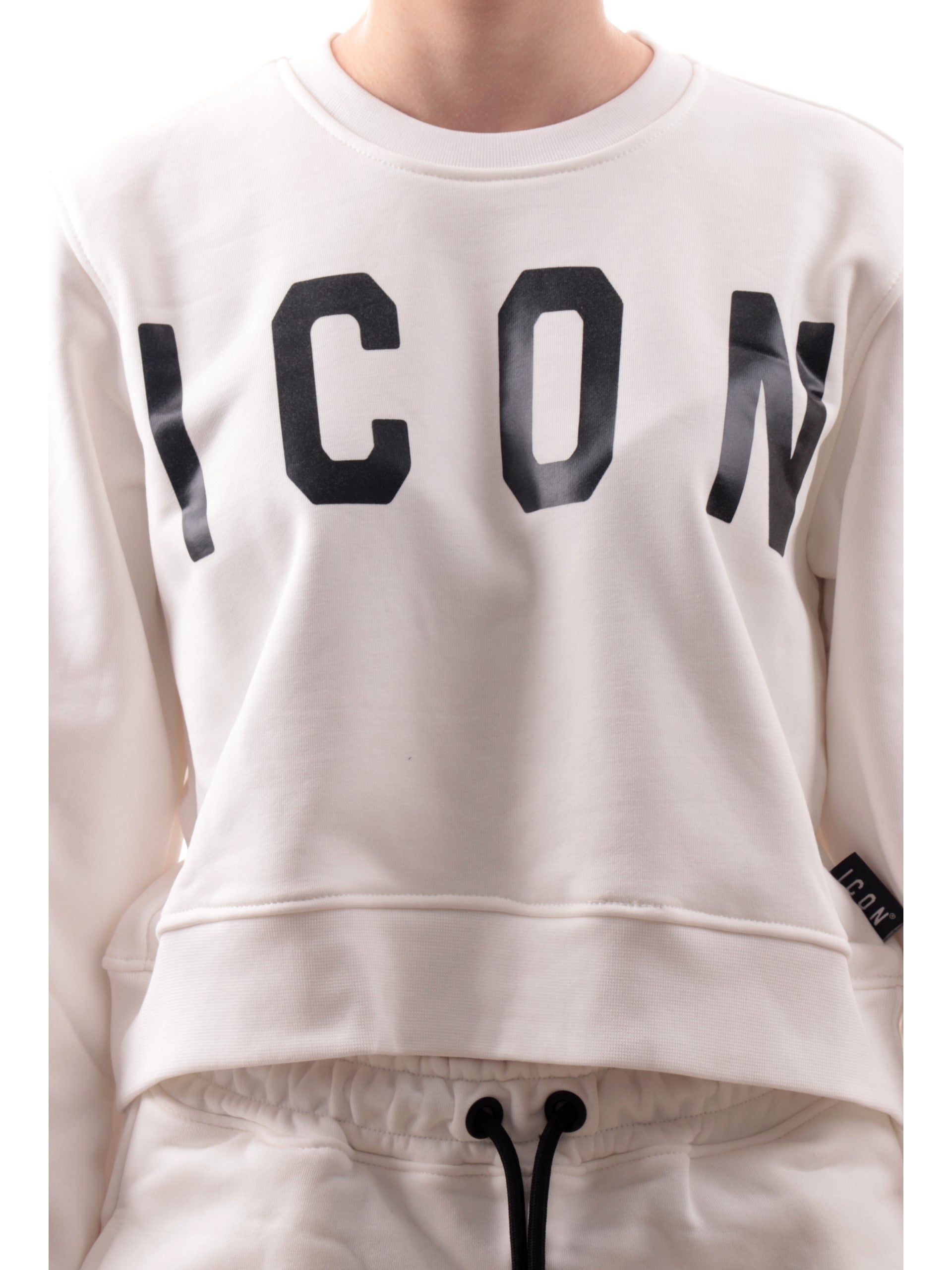 Felpa crop Icon bianca da donna con scritta Icon nera. Questa felpa Icon bianca è realizzata in morbido tessuto felpato . Questa felpa crop bianca Icon è perfetta per essere abbinata con tutta la linea.