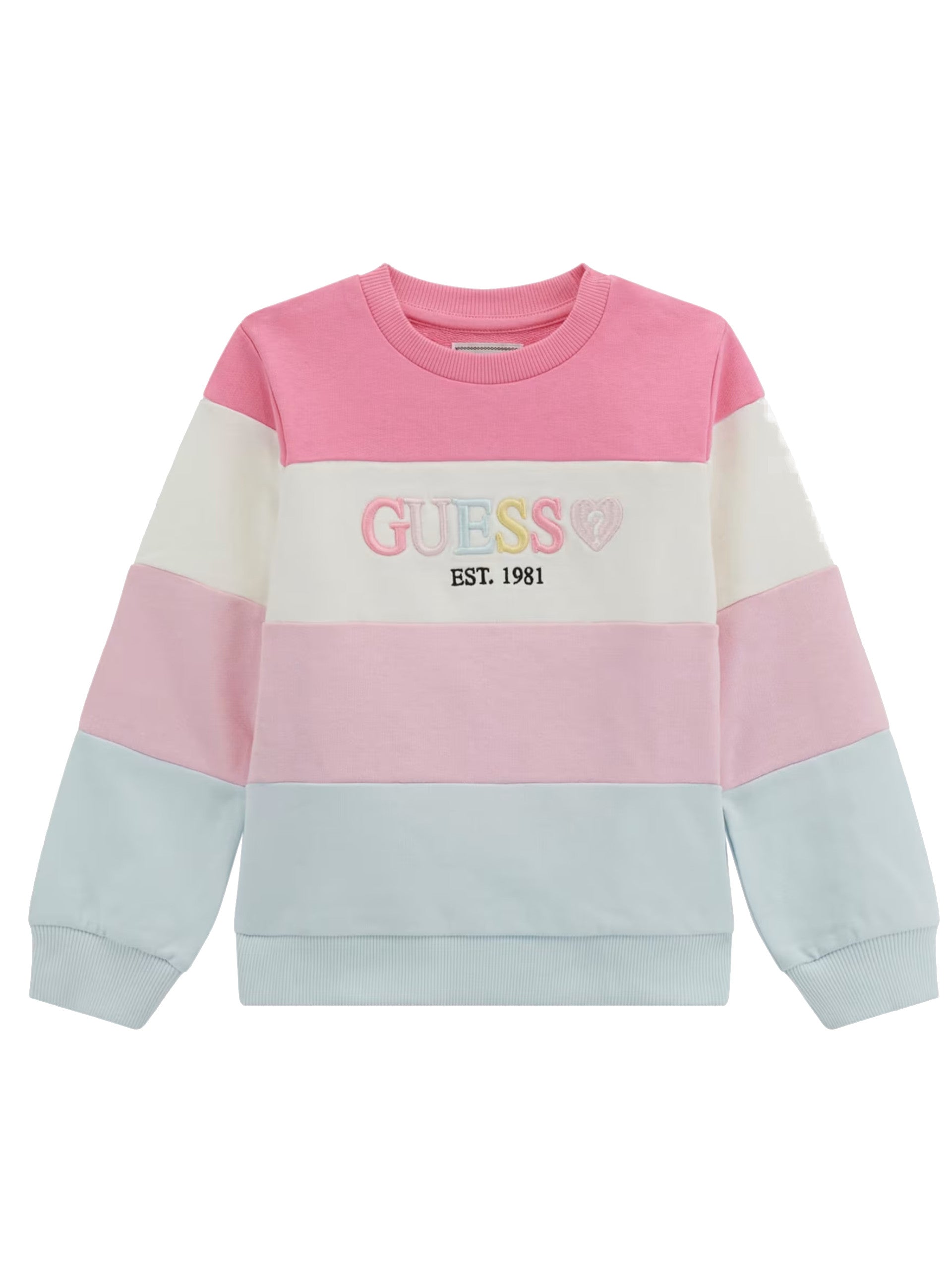 Felpa Guess rosa da bambina con logo ricamato sul davanti , realizzata in 100% puro cotone. La felpa rosa Guess ha il girocollo, bande pastello colorate , logo Guess ricamato al centro.