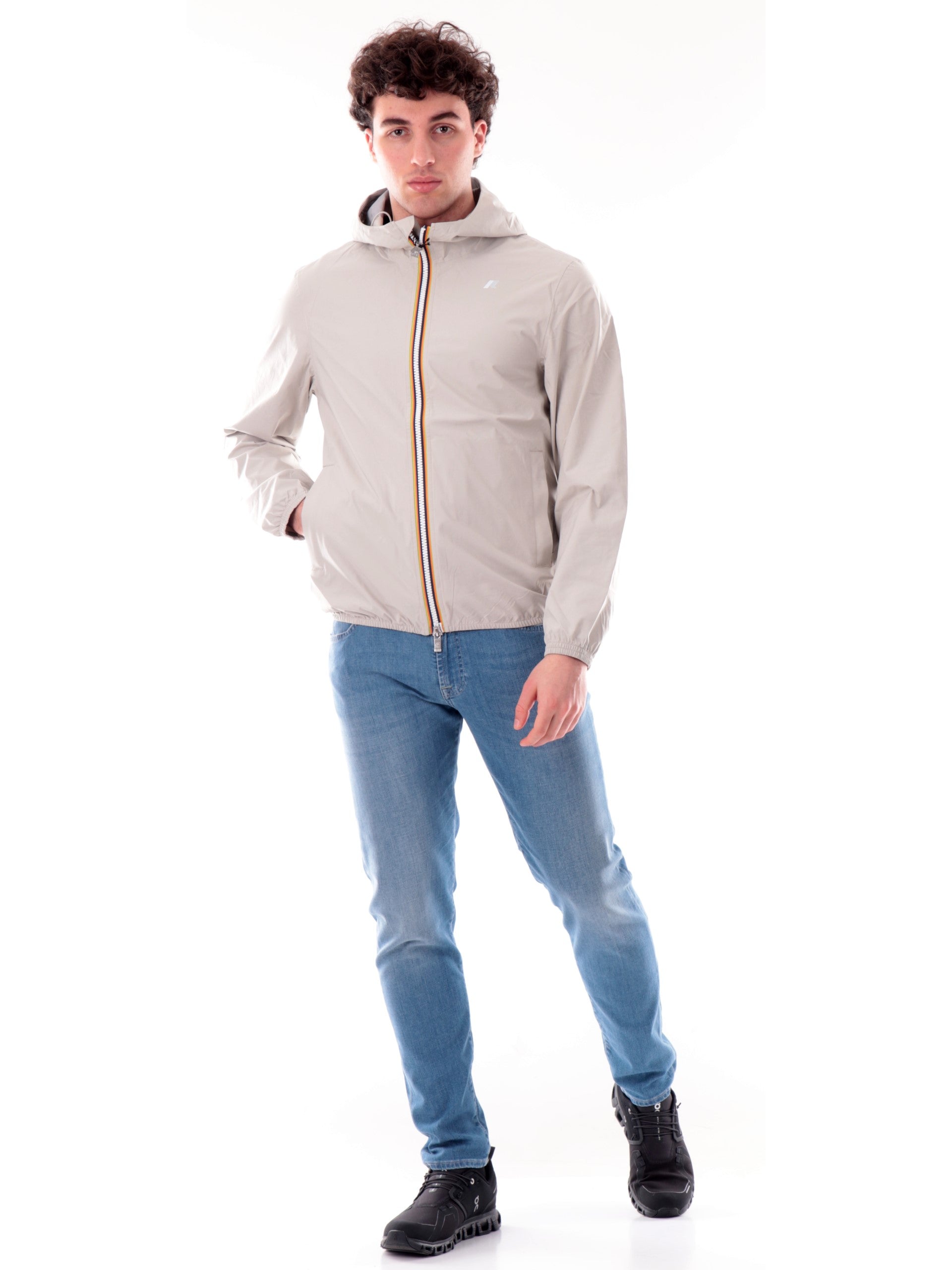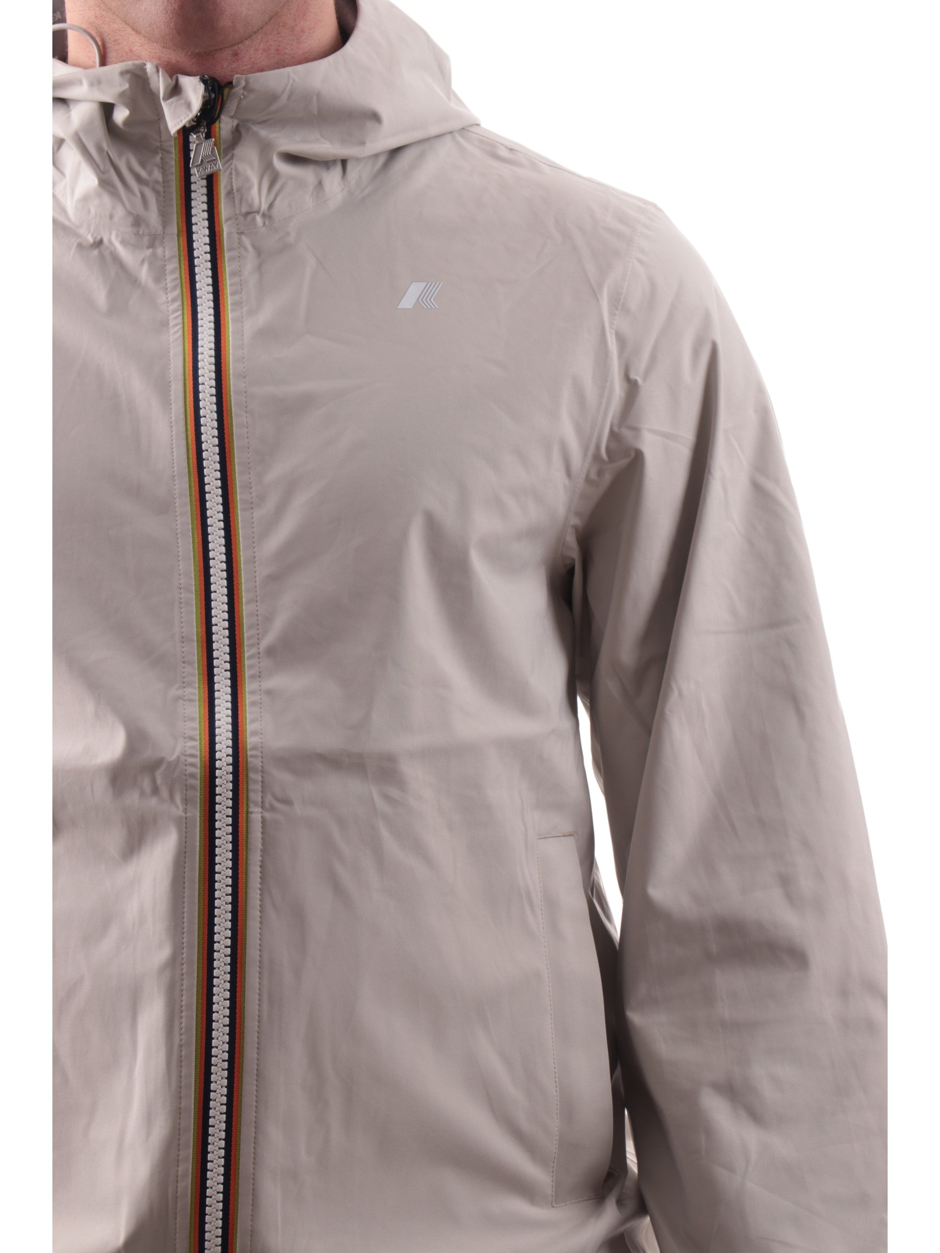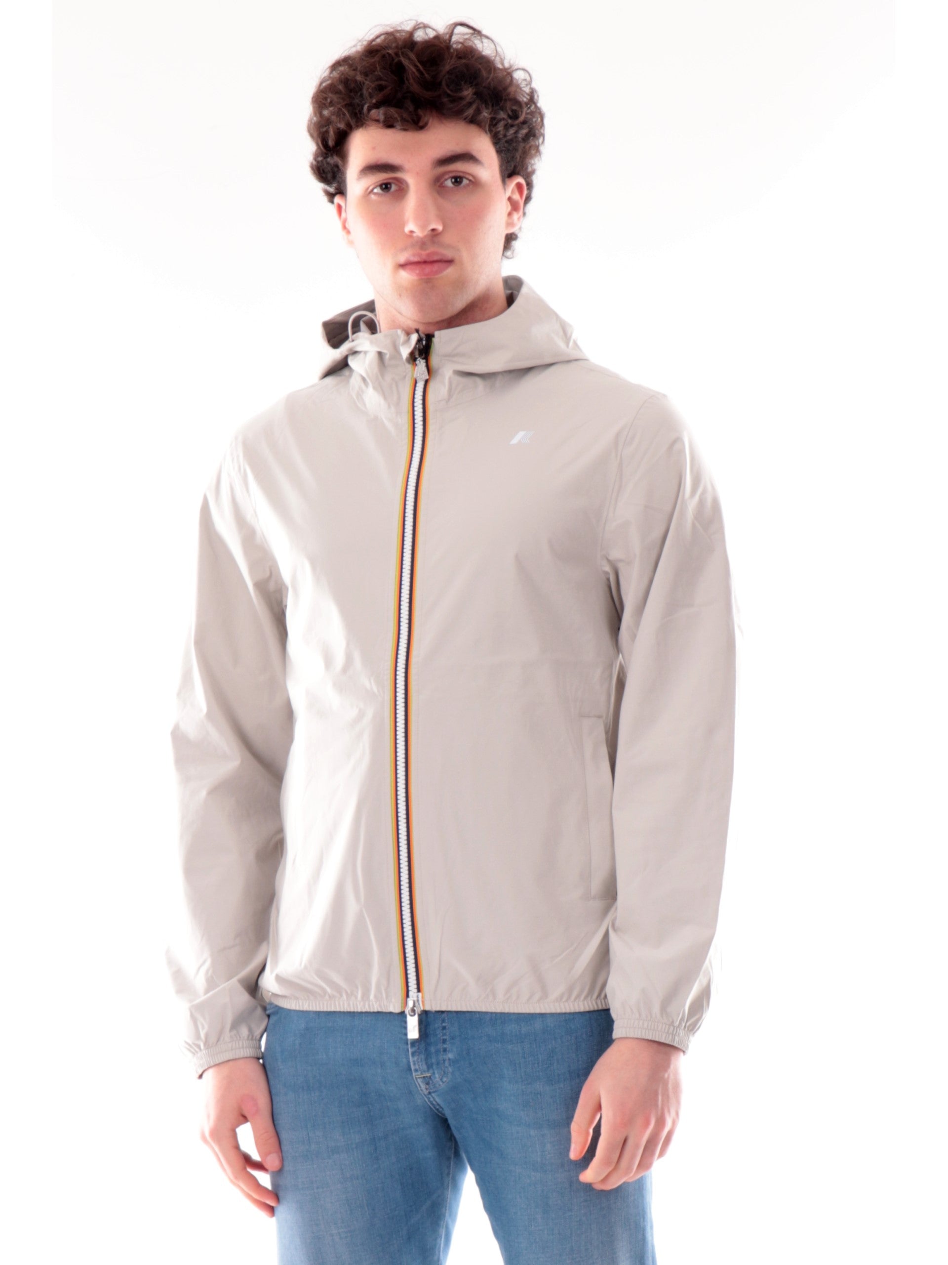Giacca K-Way beige da uomo Jack Stretch Dot. Questa giacca K-Way è ideale per le mezze stagioni e con vestibilità slim, realizzata in tessuto tecnico elasticizzato, che segue i movimenti e protegge dal vento e dalla pioggia. L'interno è foderato con una membrana isolante decorata con K-Way stampato all over in tonalità argento. Questo giaccetto K-Way è caratterizzato dal cappuccio fisso con coulisse, chiusura full zip con doppio cursore, due tasche laterali con zip, logo del branda applicato a lato cuore, polsini e fondo elasticizzati.