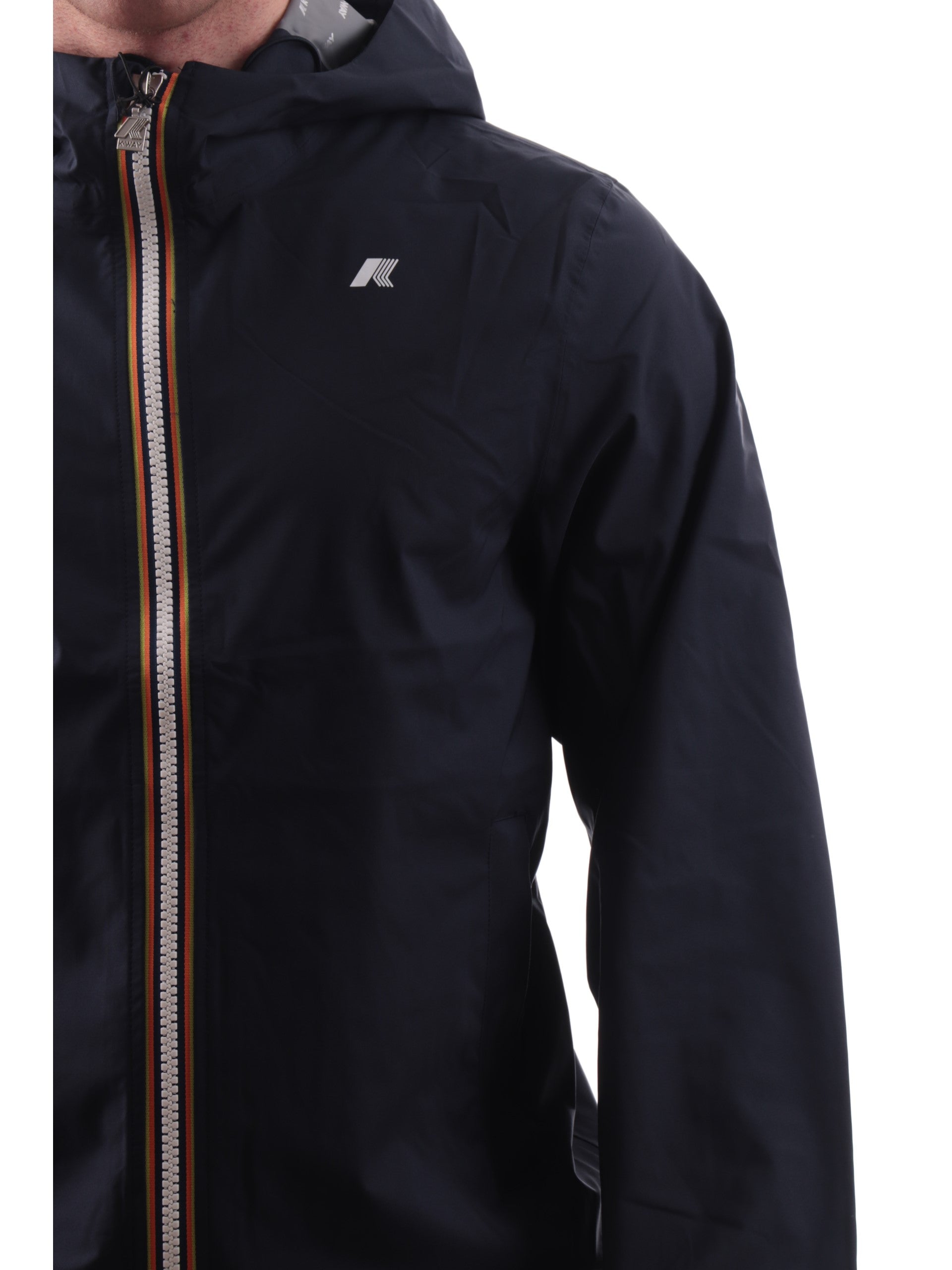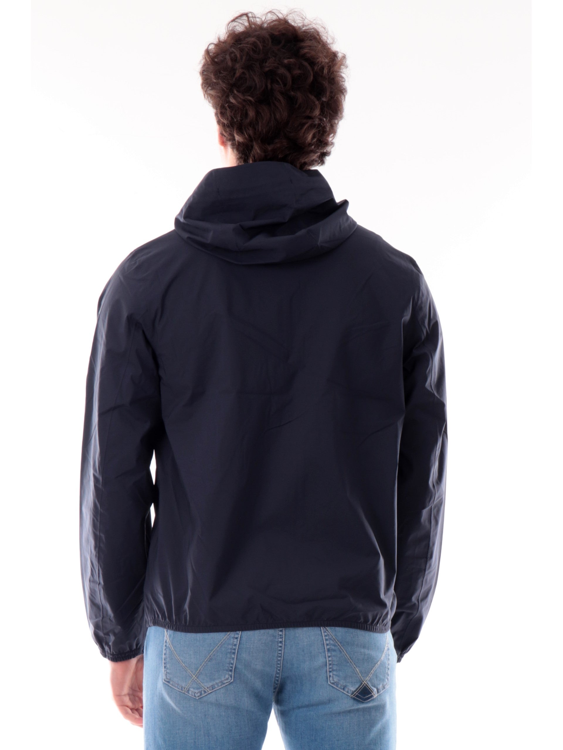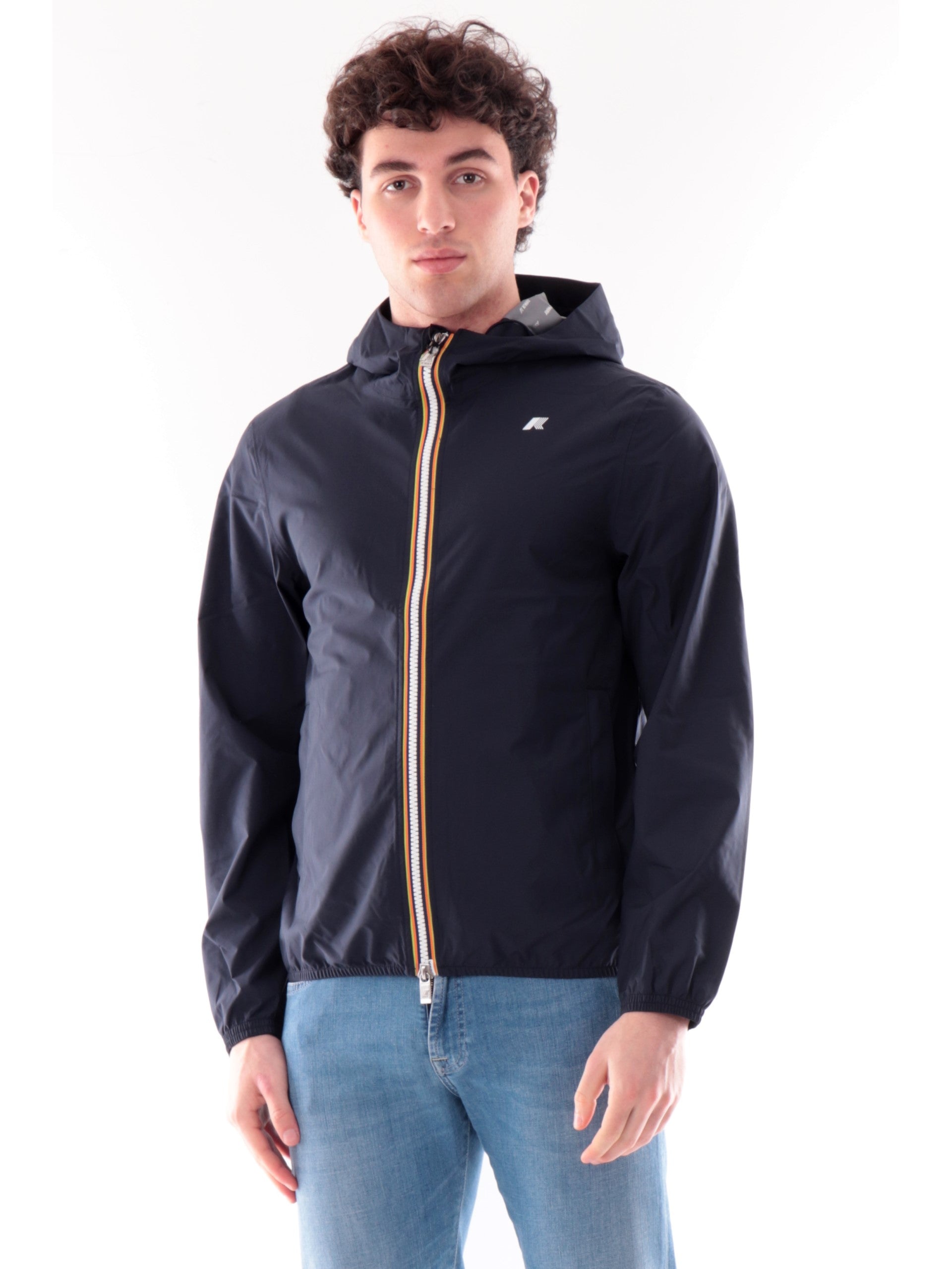 Giacca K-Way blu da uomo Jack Stretch Dot. Questa giacca K-Way è ideale per le mezze stagioni e con vestibilità slim, realizzata in tessuto tecnico elasticizzato, che segue i movimenti e protegge dalvento e dalla pioggia. L'interno è foderato con una membrana isolante decorata con K-Way stampato all over in tonalità argento. Questo giaccetto K-Way è caratterizzato dal cappuccio fisso con coulisse, chiusura full zip con doppio cursore, due tasche laterali con zip, logo del branda applicato a lato cuore, polsini e fondo elasticizzati.