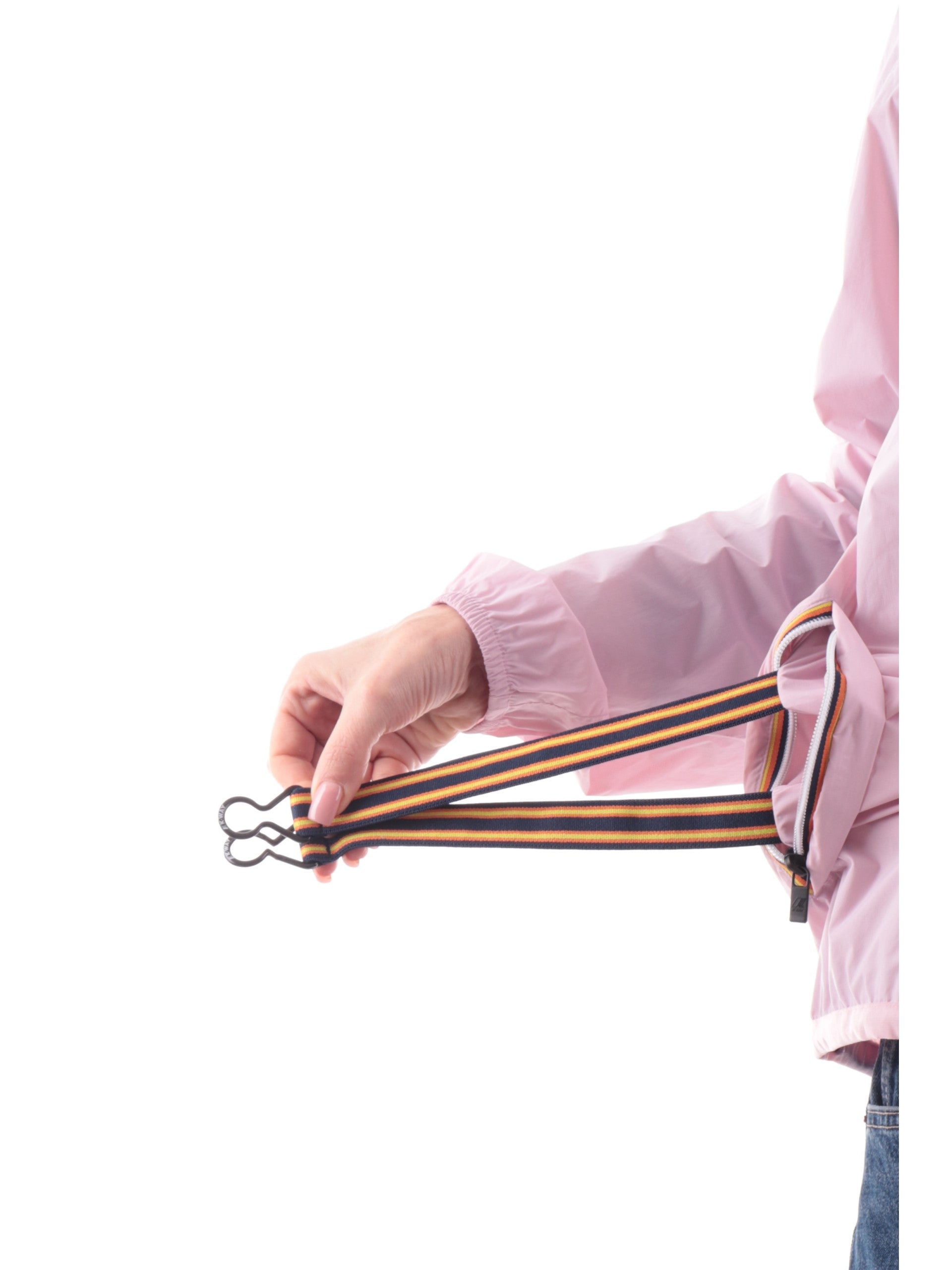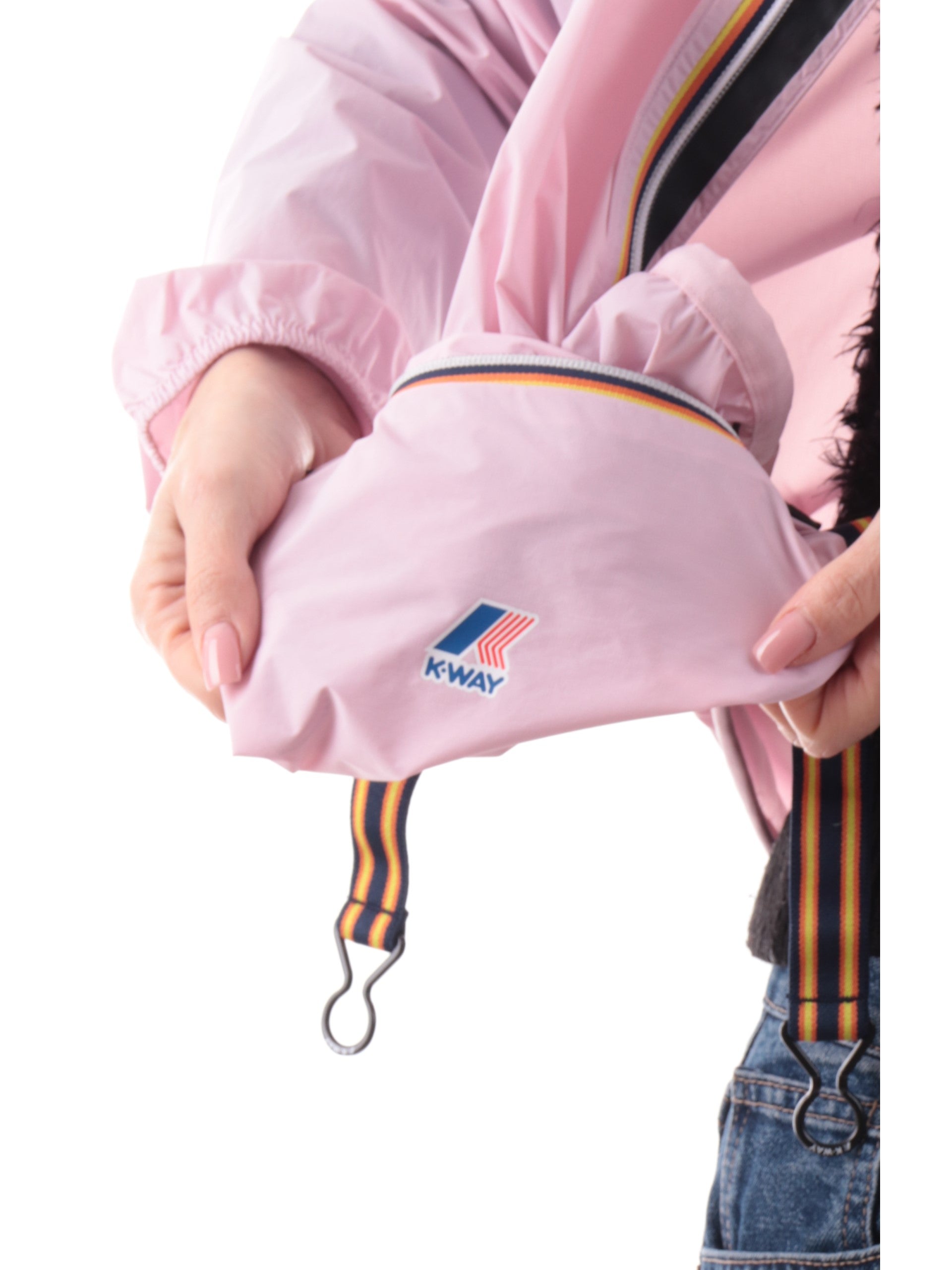 Iconico Impermeabile K-Way realizzato in nylon con cappuccio e tasche. Questo modello storico di KWay è caratterizzato da un sistema che ti permette di richiuderlo in una tasca grazie a dei pratici ganci per minimizzarne l'ingombro e portarlo sempre con te come una pratica mini pochette.