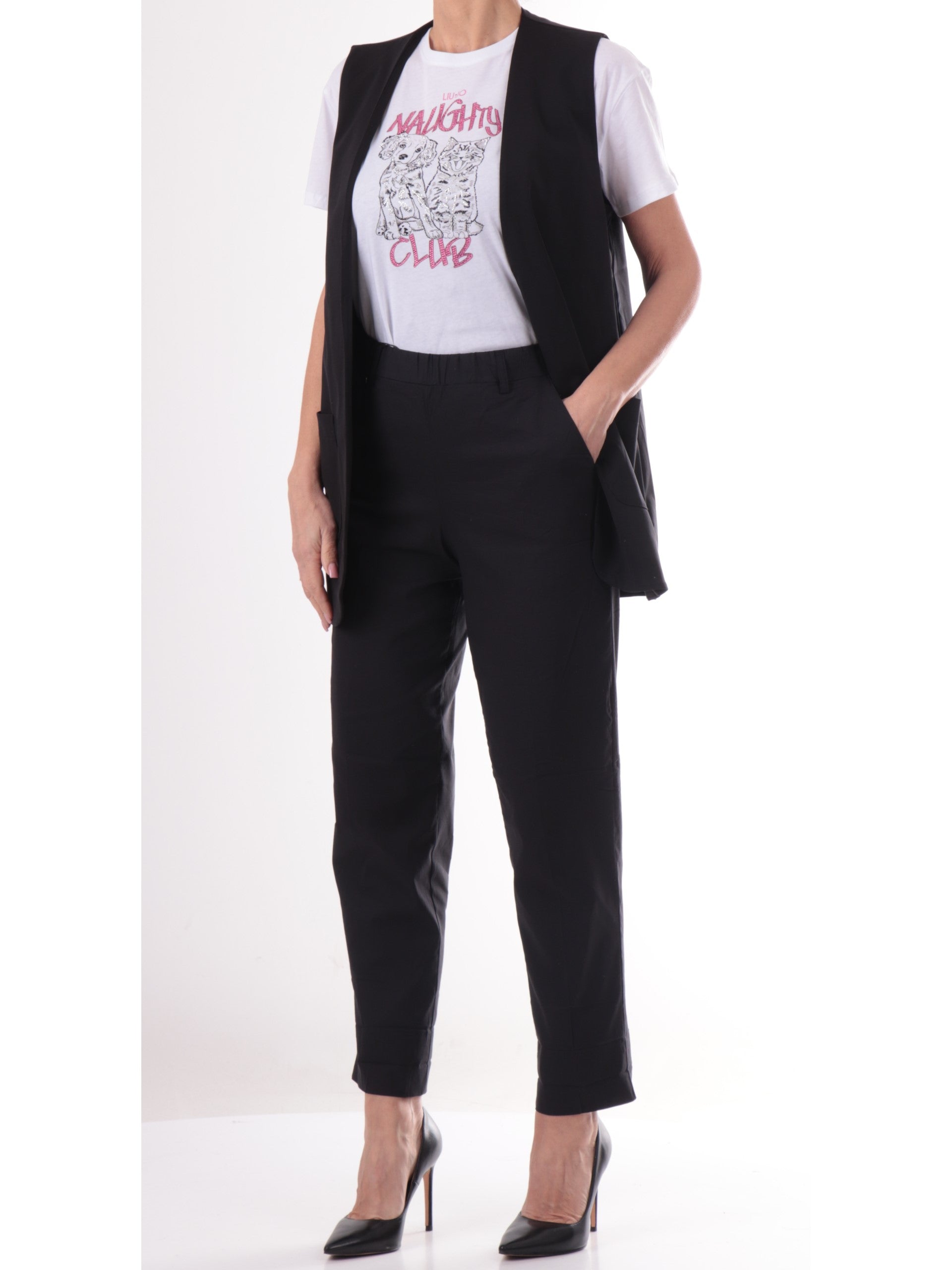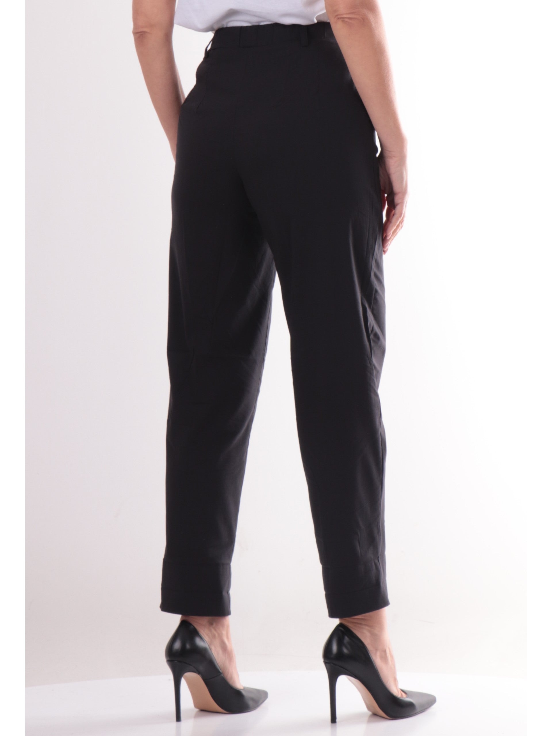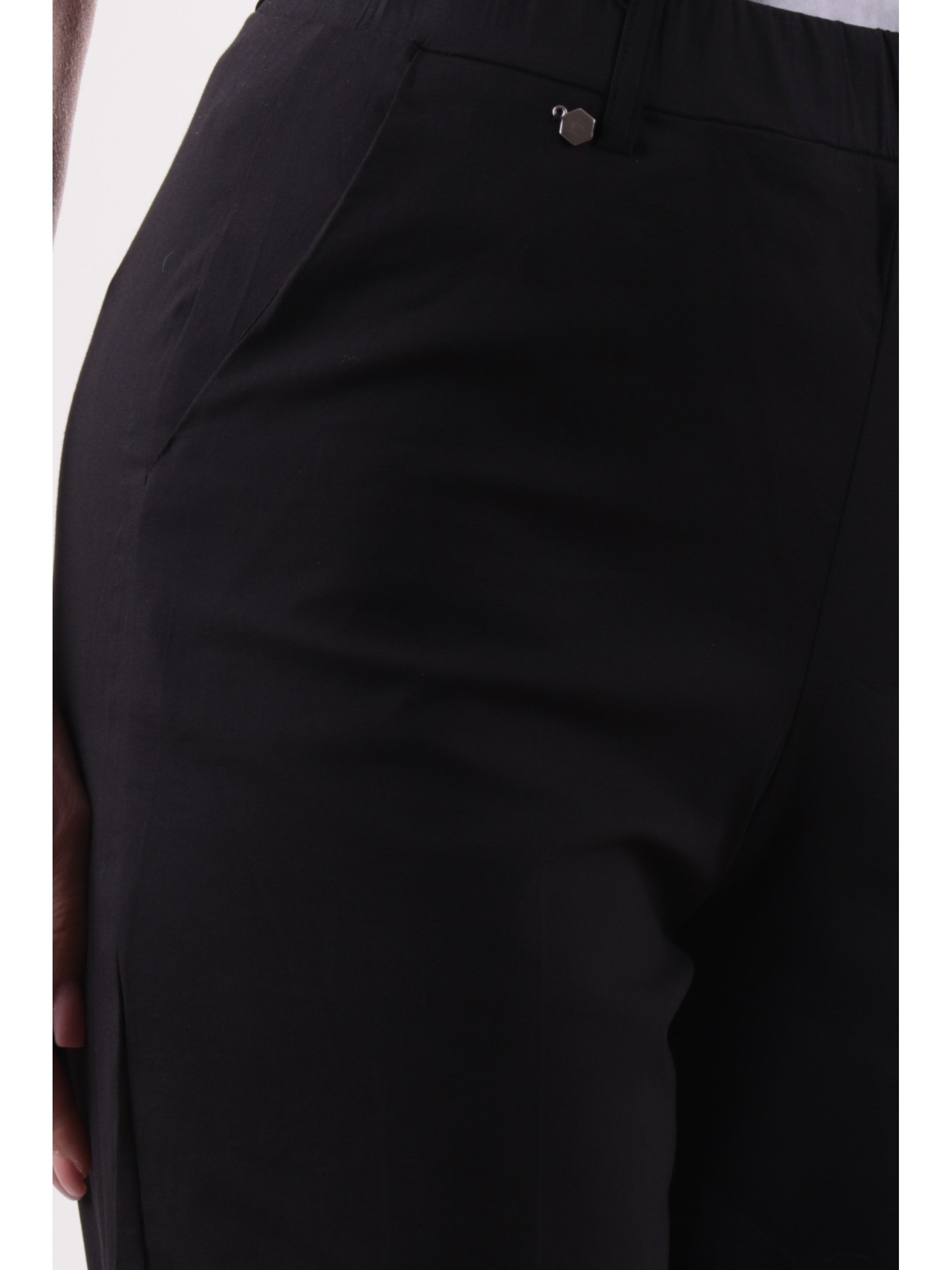 Pantaloni Ragno neri da donna Carrot. Questi pantaloni da donna, realizzati in cotone, hanno la banda elastica sul punto vita, passanti per la cintura, due tasche laterali oblique e la gamba dritta. Perfetti per un look elegante e casual.