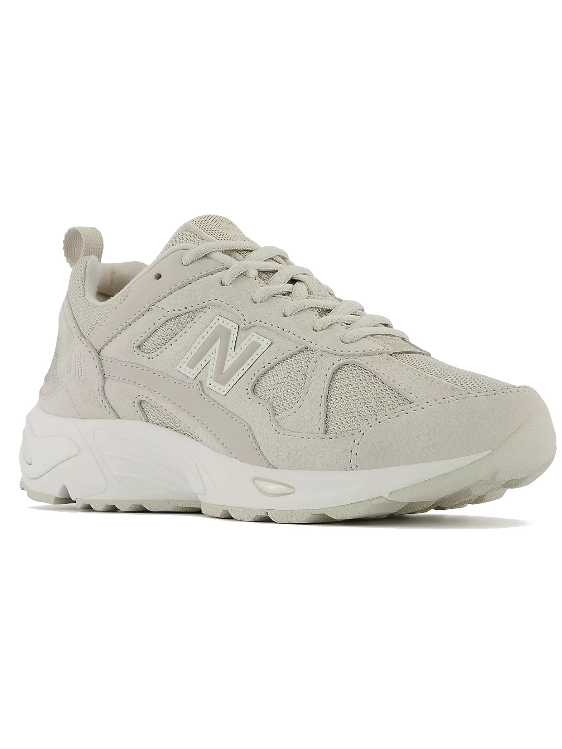 Scarpe New Balance 878 beige. Queste New Balance beige hanno la tomaia in tessuto e la suola Abzorb in gomma, hanno la linguetta posteriore che agevola l'entrata del piede, la chiusura a lacci e il logo del brand ambo i lati.