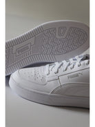 White Puma shoes for children Caven 2.0 39383. These low white Puma sneakers have a mesh upper and a reinforced rubber sole. On the front of these Puma we find the classic lace closure, the holes to let the foot breathe and the brand logo in contrasting colour.