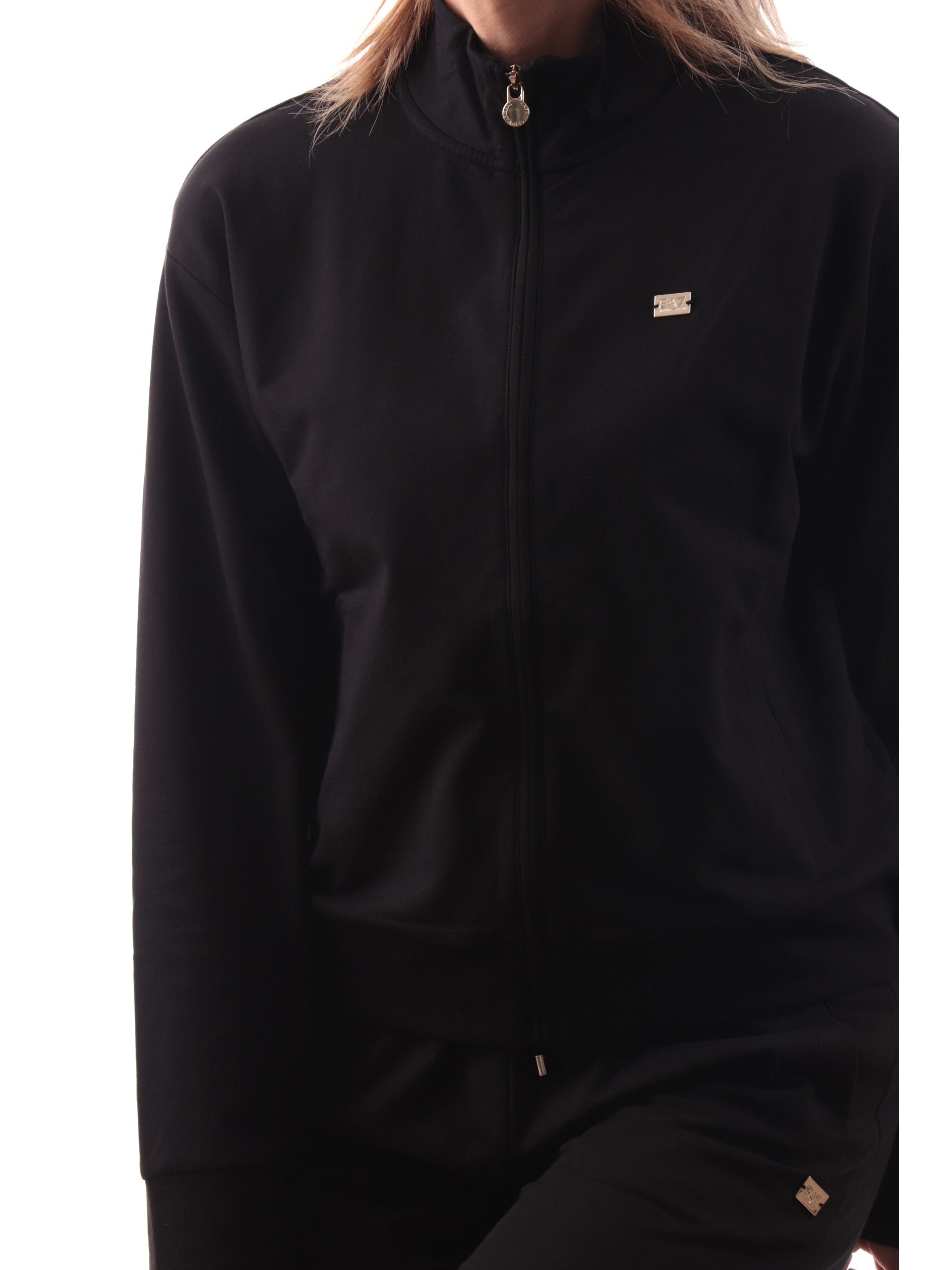 Tuta Emporio Armani EA7 nera da uomo acetata full zip logo bianco 8NPV65PJHCZ. Questa tuta EA7 nera ha la felpa con chiusura full zip, due tasche laterali, la stampa del brand sul davanti lato sinistro a contrasto colore, polsini e fondo elasticizzati e i pantaloni neri con banda elastica sul punto vita regolabile con laccetti, due tasche laterali, il logo stampato sulla gamaba sinistra e polsini. elasticizzati.