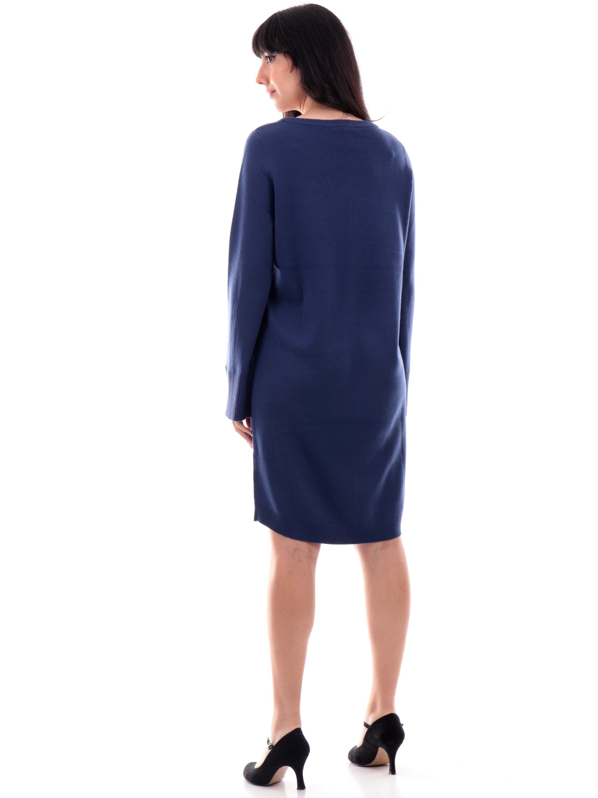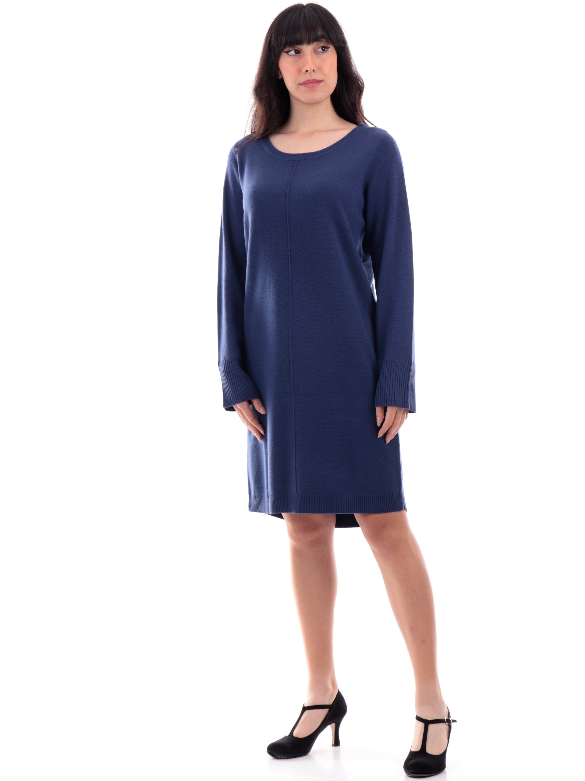 Abito Anis girocollo blu da donna maniche lunghe 245W1321, realizzato in misto lana. Questo vestito Anis blu donna girocollo ha le maniche lunghe, la vestibilità morbida, polsini e fondo elasticizzati a costine.
