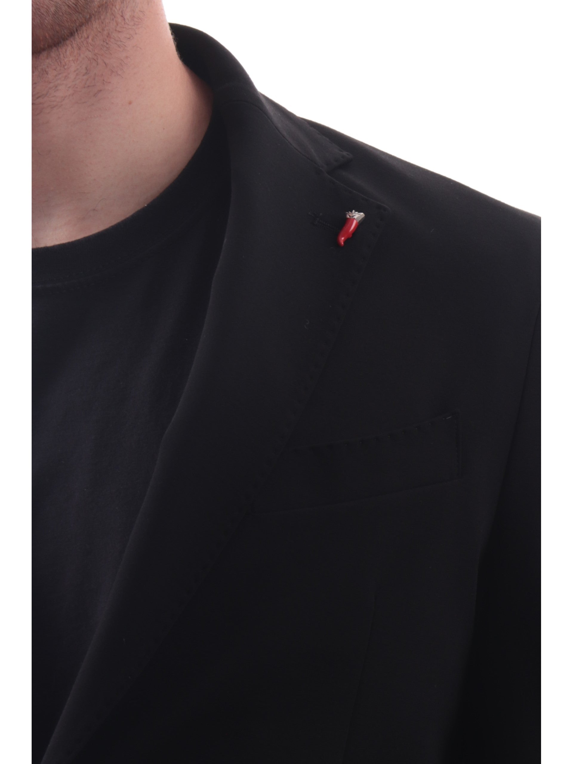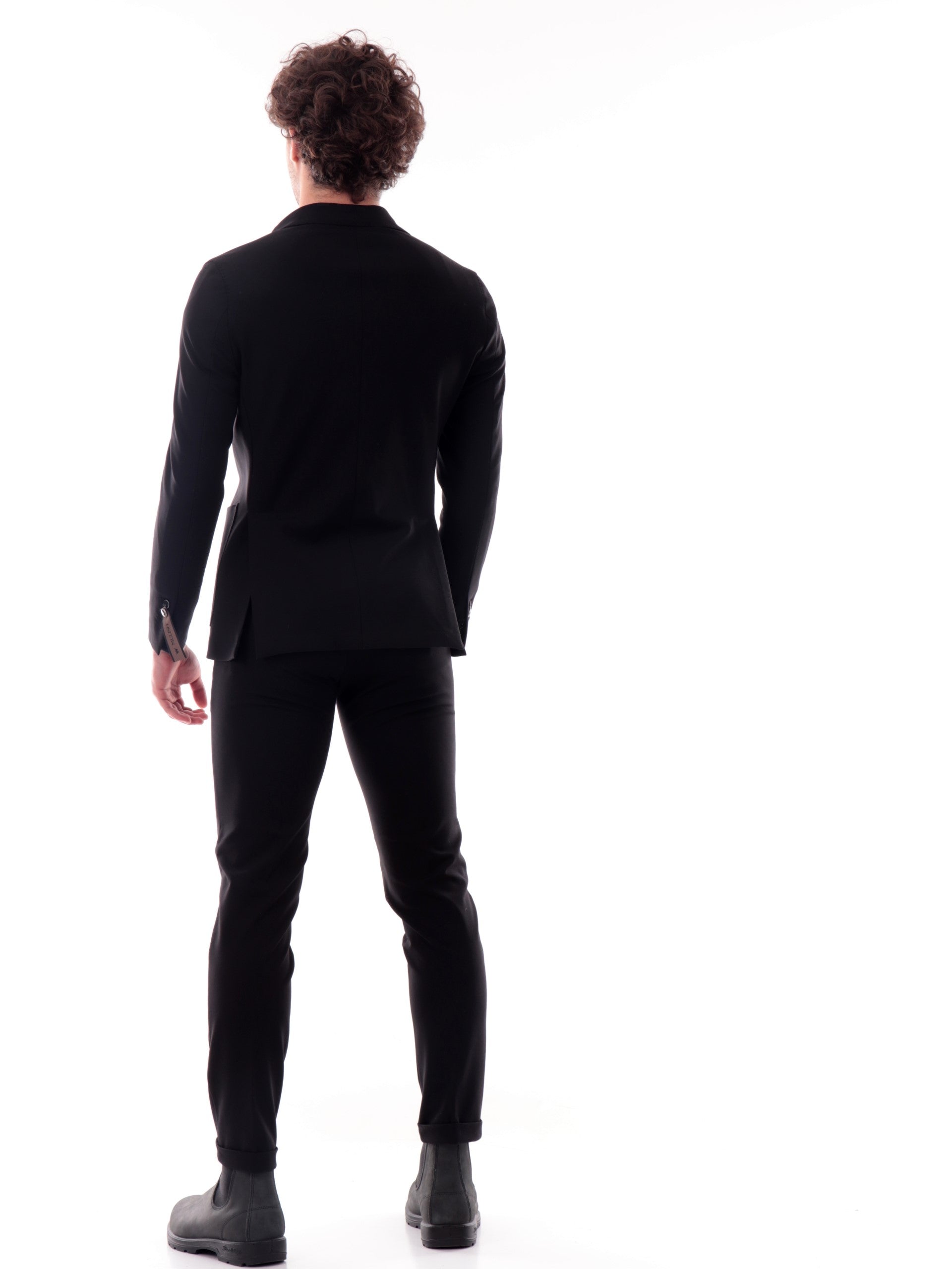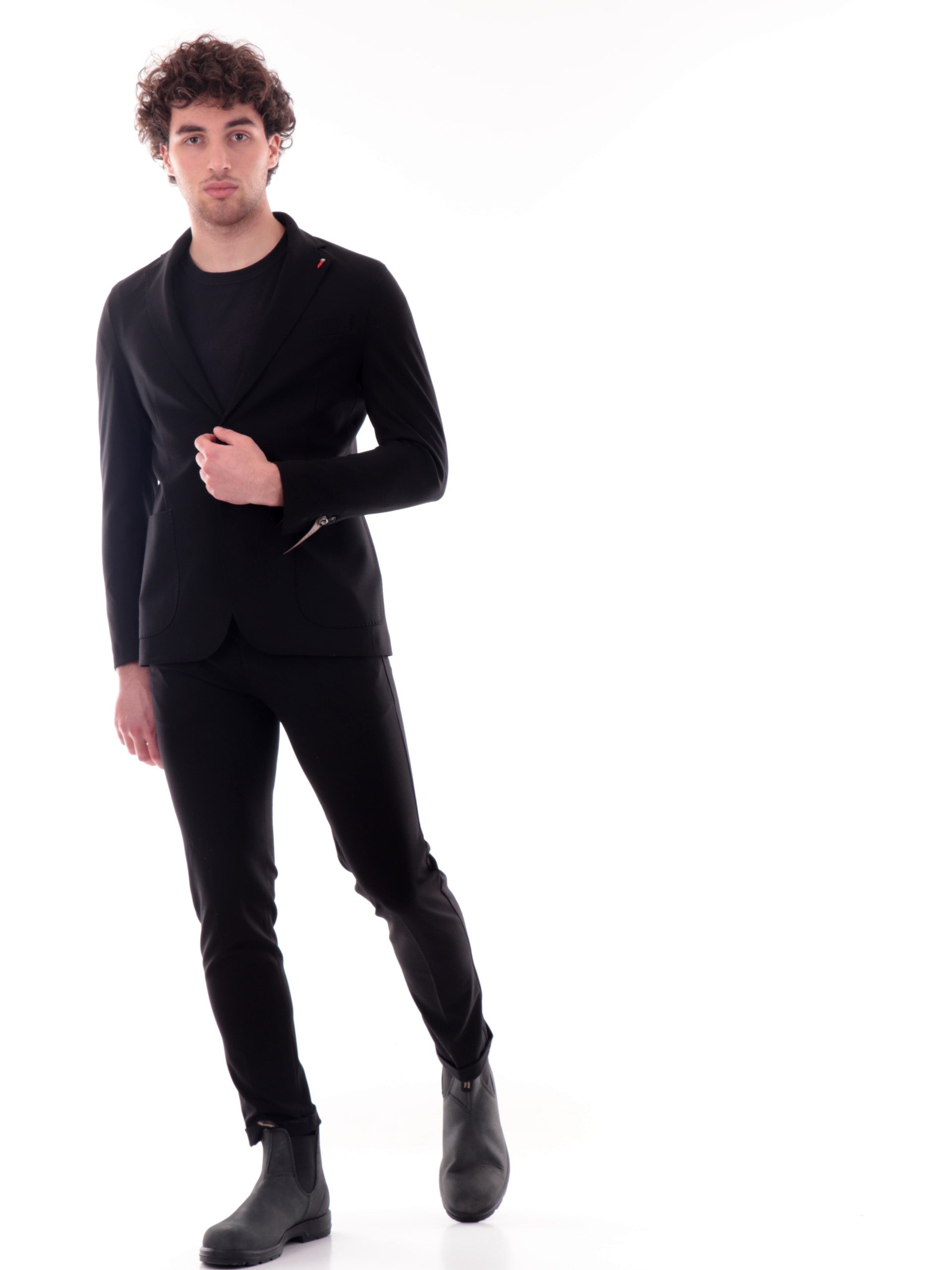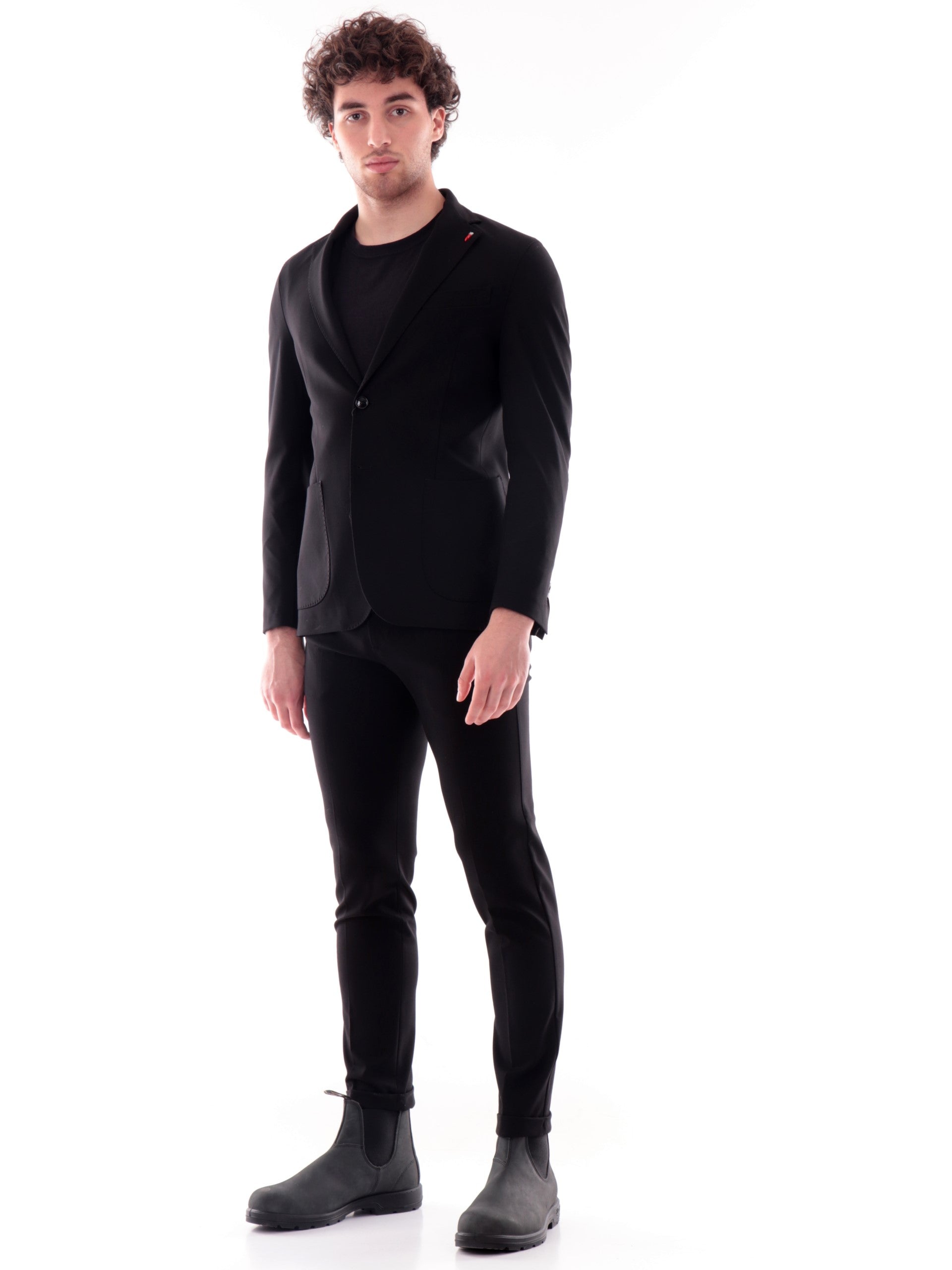 Abito completo Mulish nero da uomo JERSEY. La giacca di questo completo Mulish ha il colletto tradizionale con l'iconico corno rosso, la chiusura con bottoni, due tasche laterali, un taschino e il fondo con spaccatura sul lato posteriore. I pantaloni di questo completo Mulish hanno la chiusura con bottone e zip, due tasche laterali aperte con taglio obliquo, la predisposizione per indossare la cintura e il fondo regolare.