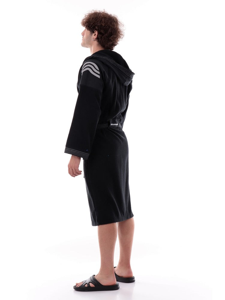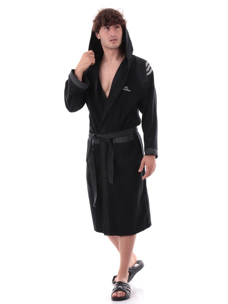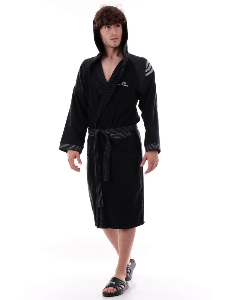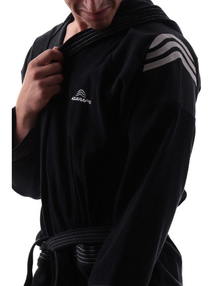 Accappatoio nuoto Aquarapid nero da uomo realizzato in spugna e cotone che conferiscono al prodotto caratteristiche di morbidezza ed assorbenza elevate. Accappatoio nuoto uomo poco con comode taschelaterali, cintura in vita che risulta essere poco ingombrante. Concepito in sostituzione della microfibra, presenta la stessa praticità ma con il comfort della spugna e con caratteristiche didurevolezza nel tempo. Caratterizzato dal logo ricamato sulla spalla sinistra.