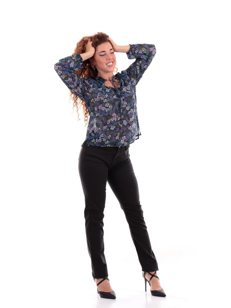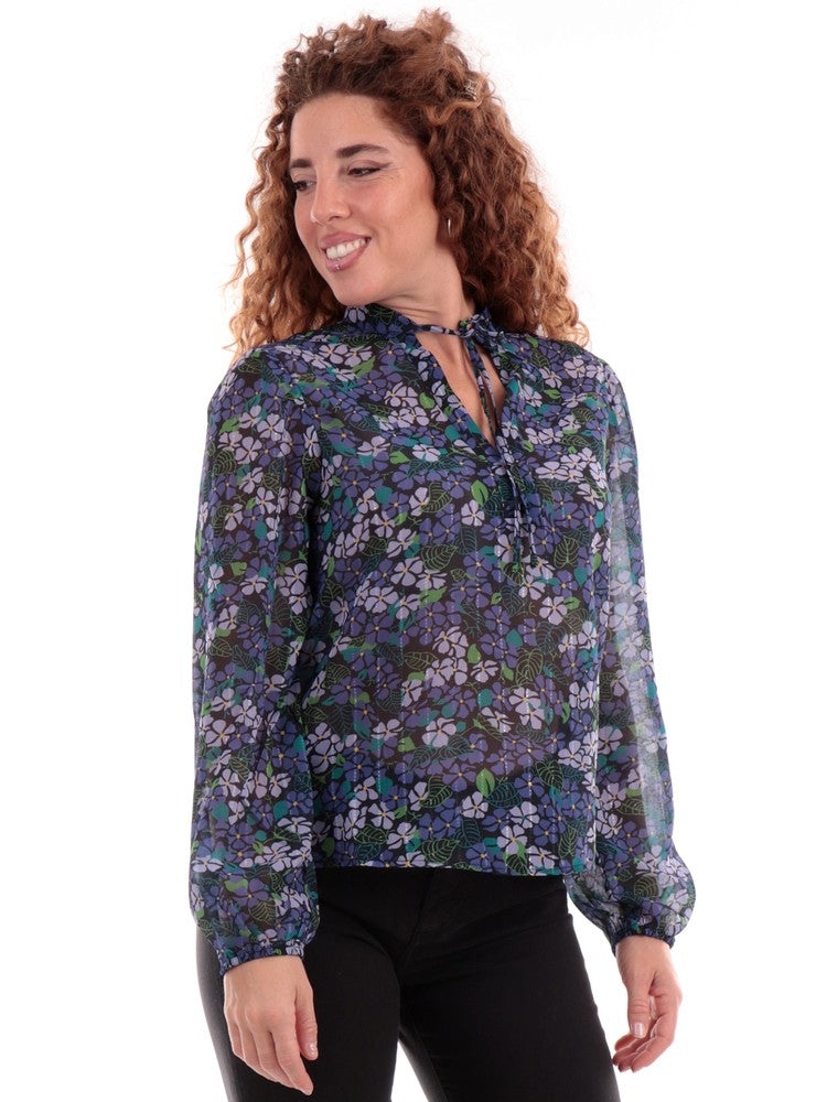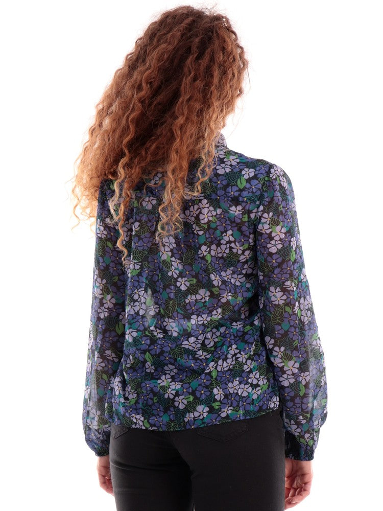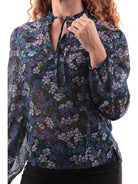 Blusa Molly Bracken viola da donna Woven R1696BH, realizzata in tessuto chiffon. Questa camicia Molly viola ha lo scollo a V, inserti in tessuto lurex e la fantasia floreale all over a contrasto colore.