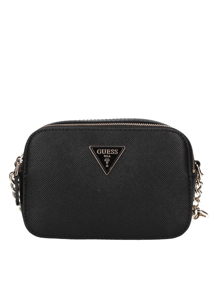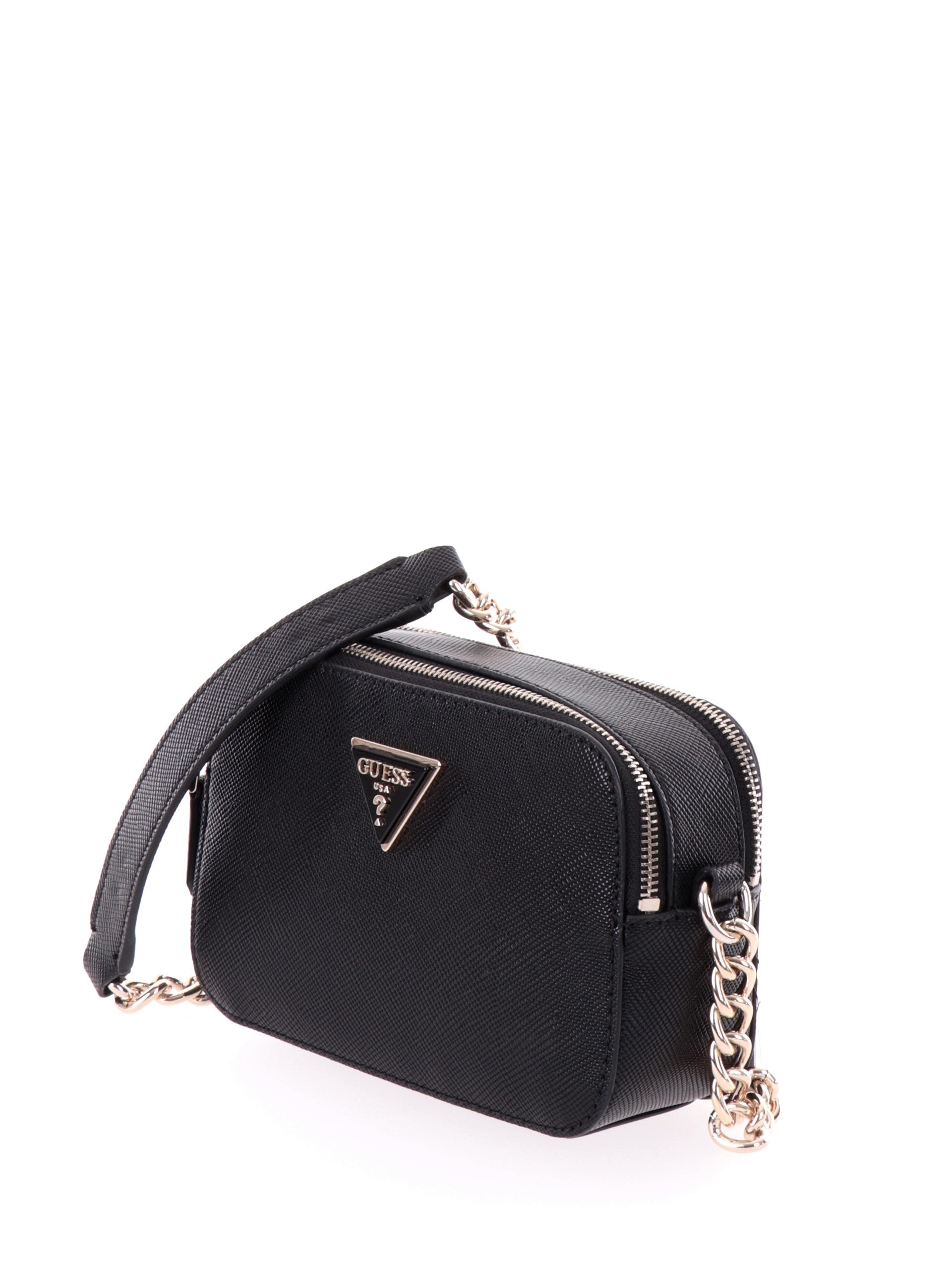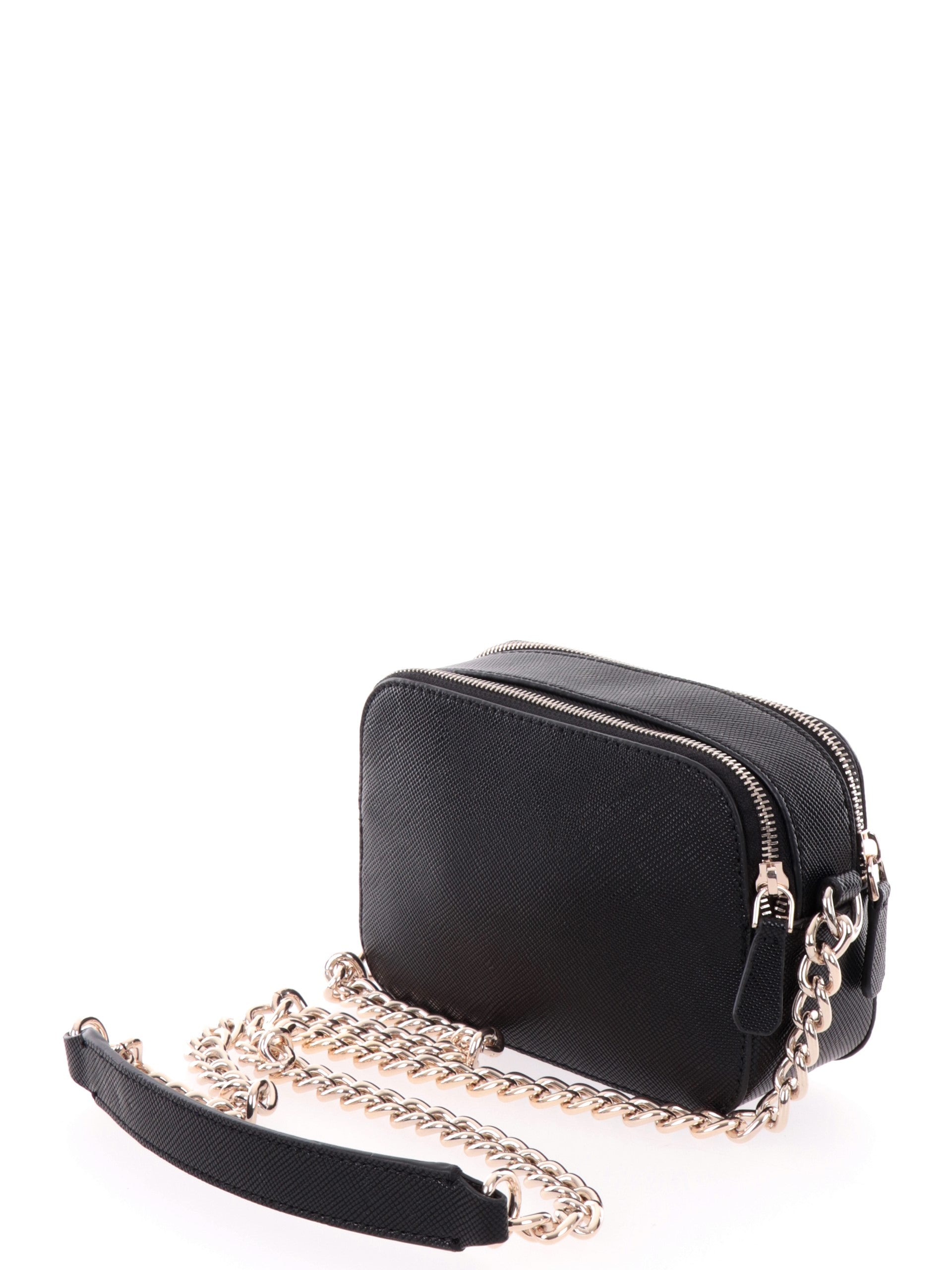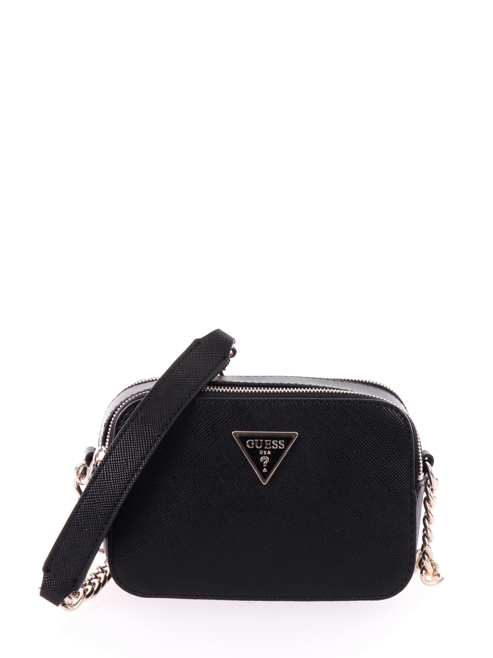 Borsa Guess nera da donna con trama saffiano. Questa borsa Guess da donna ha una catena con salva spalla per consentire di portarla a tracolla, una patch del brand in rilievo sul davanti e duescomparti distinti zip around. Questa tracolla Guess nera ha il primo scomparto con due slots portatessere e il secondo con una tasca con zip per riporre le cose più preziose