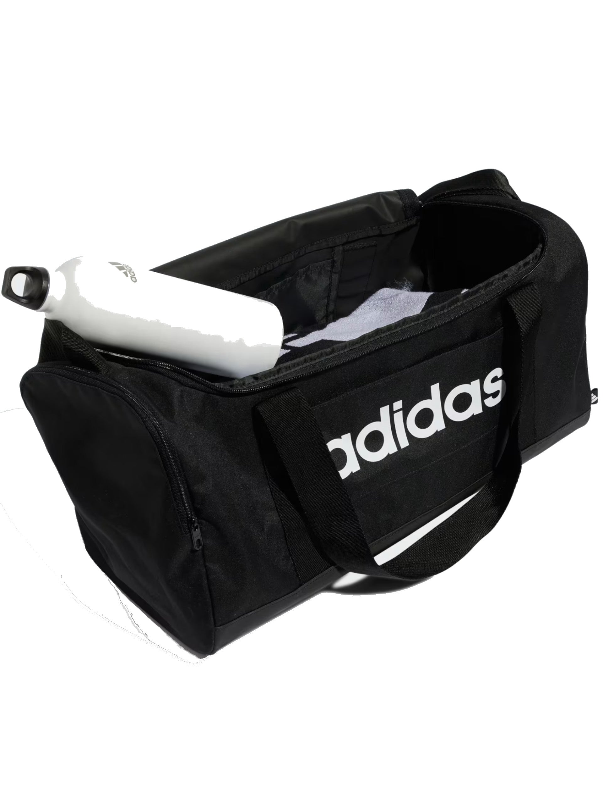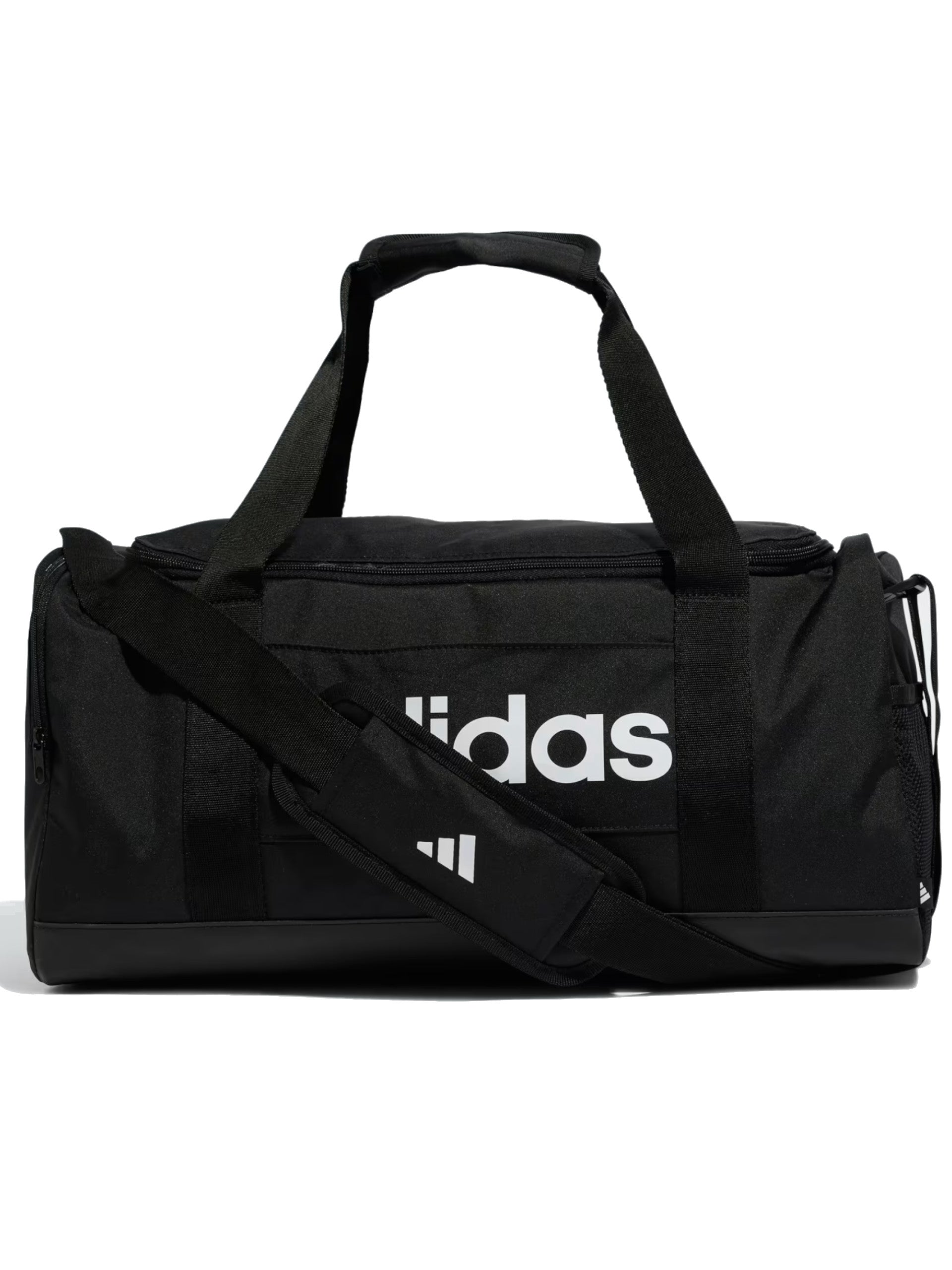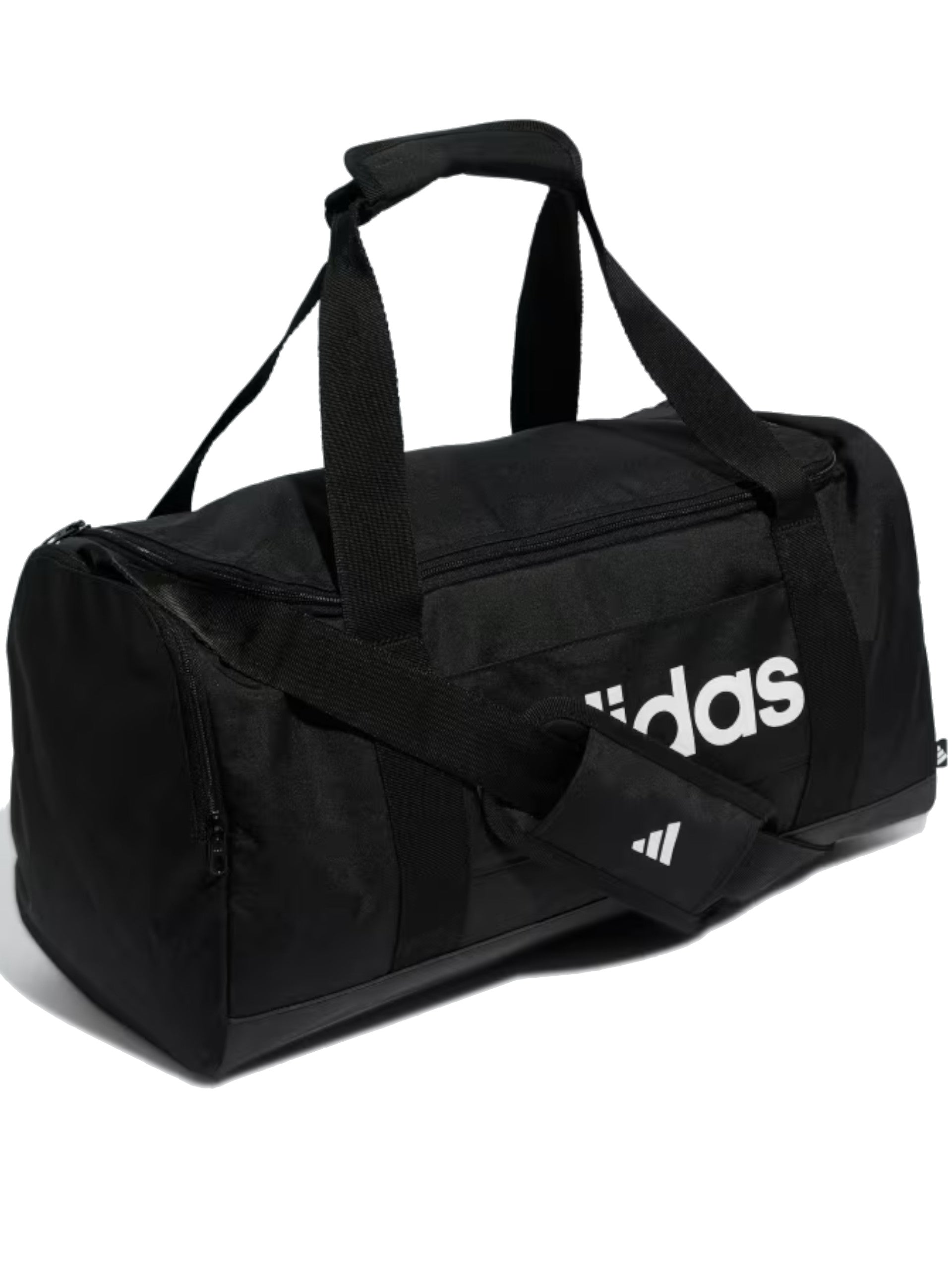 Borsone Adidas nero Linear Duffel S JE8343. Questo borsone Adidas nero ha la tracolla con salvaspalla per il trasporto a spalla, il doppio manico per il trasporto a mano, la stampa logo applicata suldavanti, la tasca laterale con chiusura zip around e lo scomparto principale con chiusura zip around dove riporre tutto il necessario.
