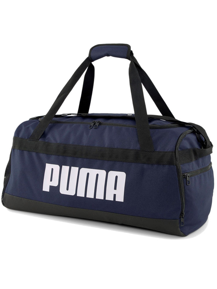 Borsone Puma blu Challenger M da 58 litri. Questa borsa sport Puma blu ha la tracolla regolabile e removibile, doppio manico con imbottitura, il salvaspalla, due scomparti esterni (uno con zip e uno con retina), uno scomparto interno con zip bidirezionale e il logo del brand sul davanti a contrasto colore.