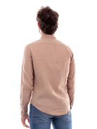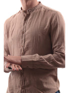 Camicia Impure marrone da uomo SHL1345. Questa camicia Impure marrone ha il colletto alla coreana, la chiusura con bottoni, i polsini con bottoni, il fondo regolare e la composizione 100% lino che larende perfetta per la stagione estiva.