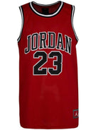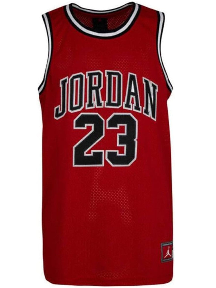 Canotta basket Jordan rossa da bambino 95A773. Questa canotta Nike Jordan rossa ha il girocollo e il giromanica con profili neri e bianchi a contrasto colore, il logo del brand cucito sia sul davantiche sul retro, l'iconico jumpman applicato sul retro, il patch del brand sul fondo a lato sinistro e la composizione in tessuto tecnico ultra leggero e traspirante che la rende ideale per la stagioneestiva.